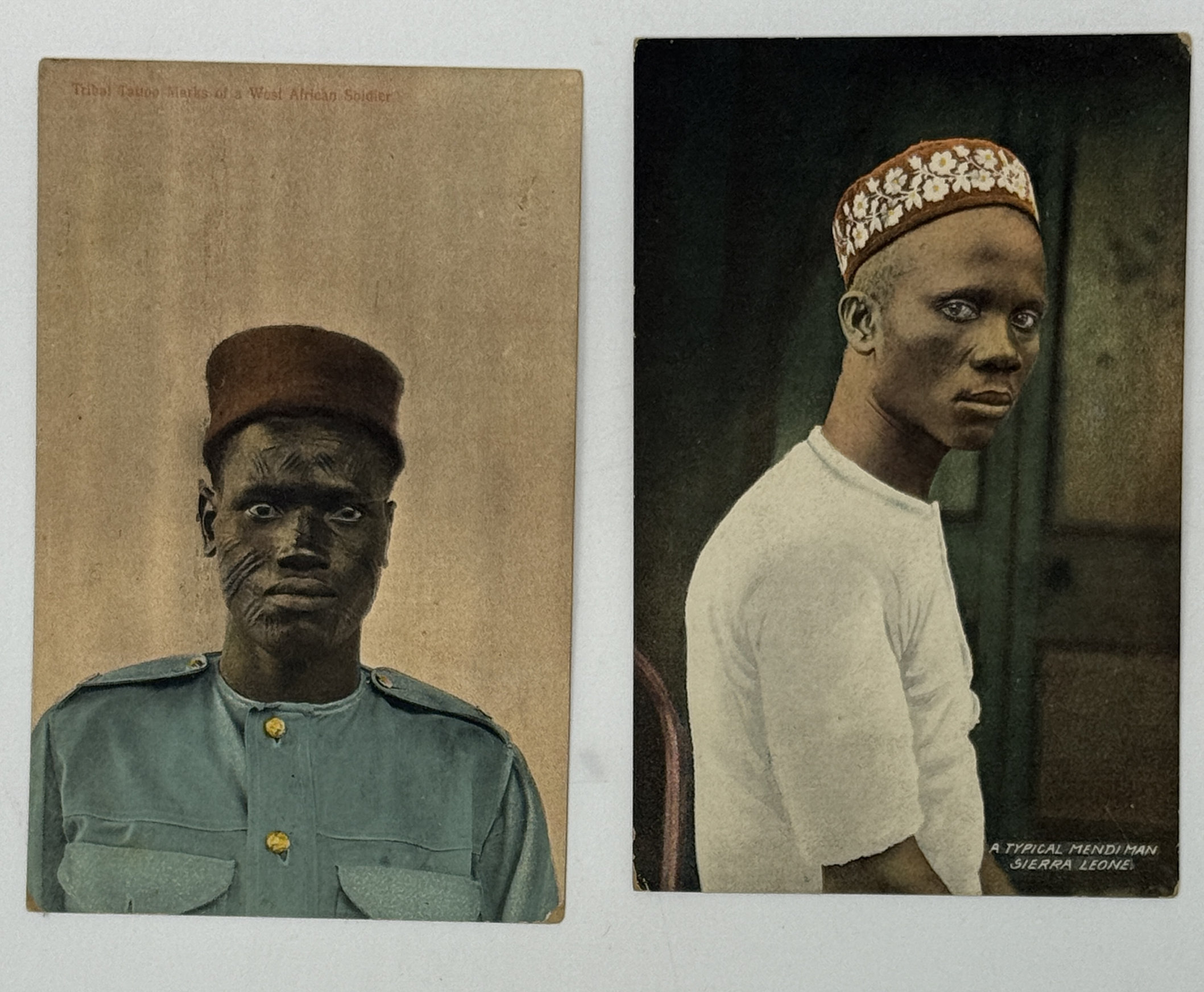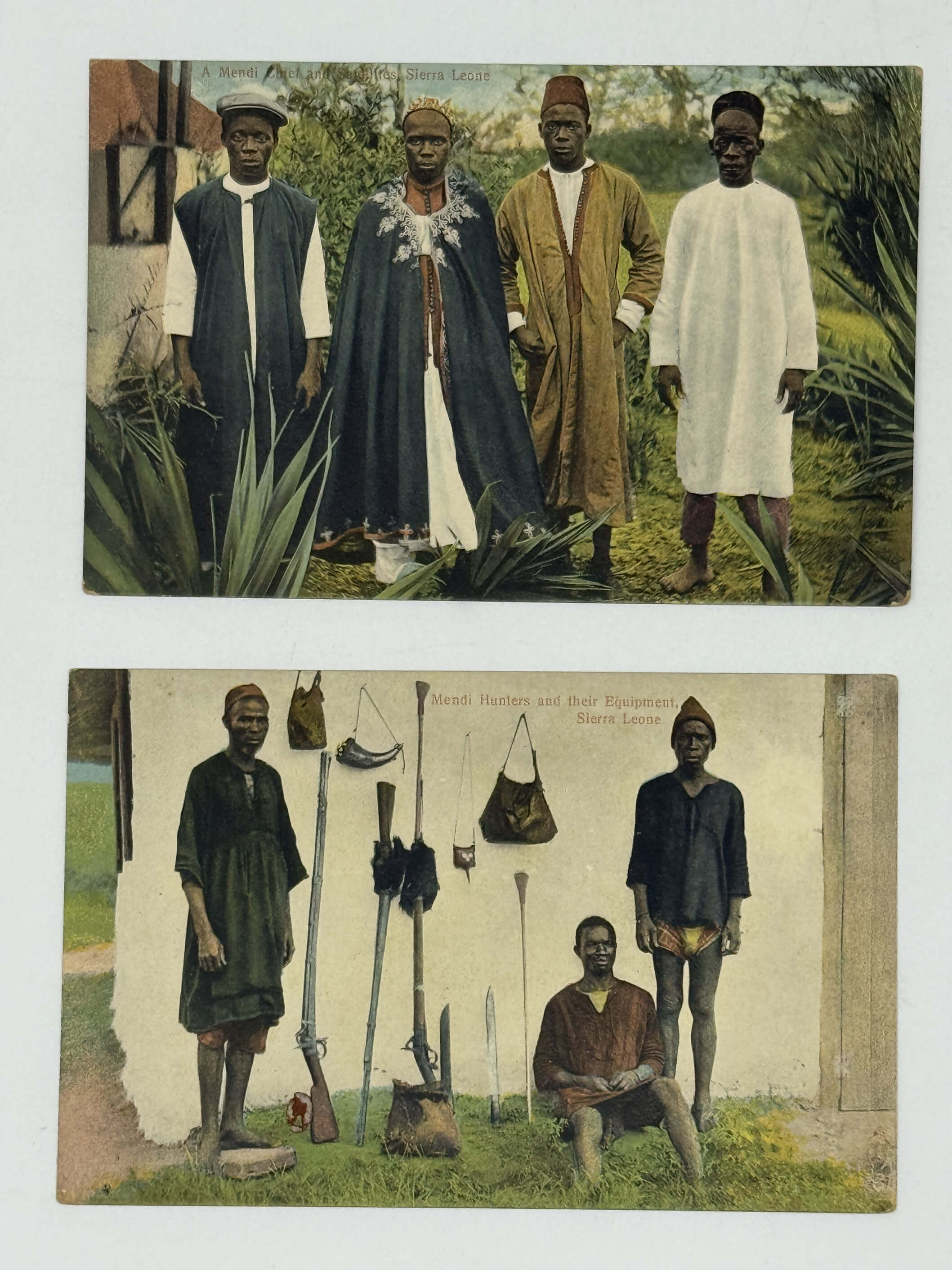The postcards of Sierra Leone mostly show Freetown (Cape lighthouse, Susan’s Bay, waterfront, King Jimmy Landing Place, downtown core, Law Courts, Government House, Princess Christian Mission Hospital, the Cotton Tree, Bank of British West Africa), as well as Mano, Aberdeen, Wilberforce Barracks, Bonthe (U.B.C. church), Moyamba, portraits of mothers with babies, wives of a native chief, “Bundu initiates,” a Mende chief, Mende hunters, “a typical Mendi barrie,” &c.