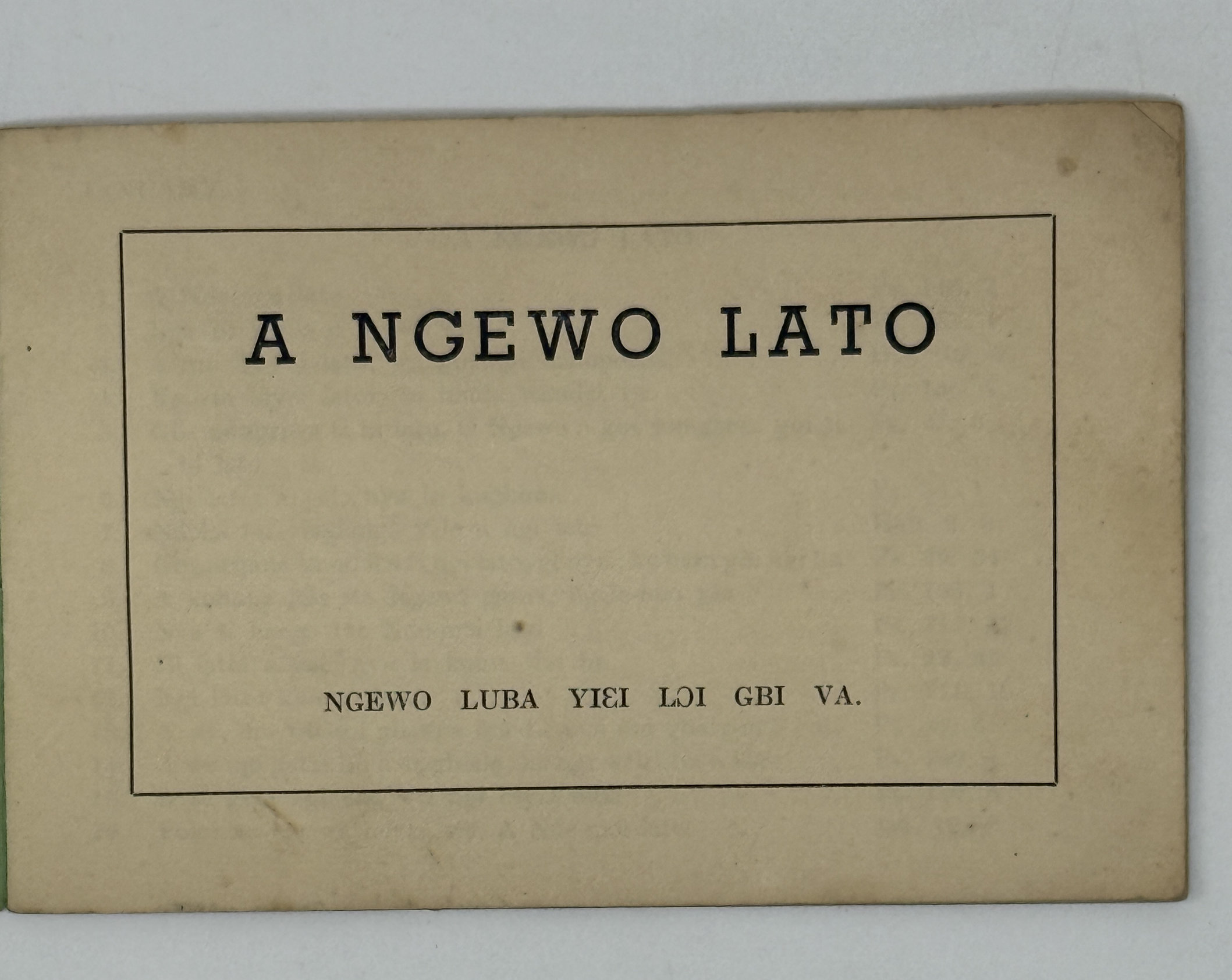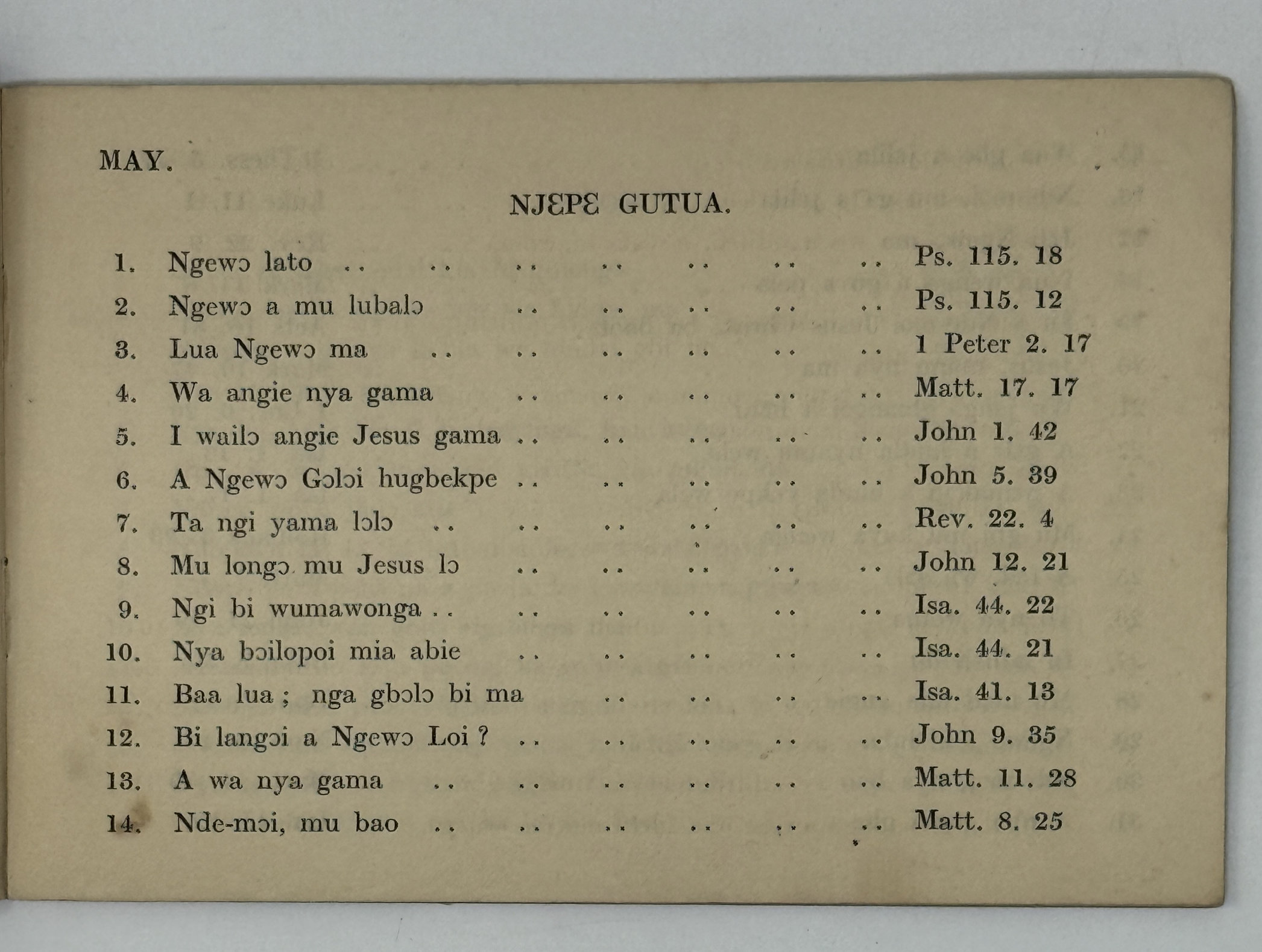 A rare brochure with Bible verses in the Mende language, titled “A Ngewo Lato” and published specially “for Miss M. Eaton, United Brethren Mission, Sierra Leone,” contains selected quotes from the Old and New Testaments (Pentateuch, Psalms, books of Prophets, Gospels, Acts, Epistles, Book of Revelation, and others), organized according to each day of the year. In the end, there are the translations of Jesus’s parables of the lost sheep (Luke 15, 3-7), the lost coin (Luke 15, 8-10) and the prodigal son (Luke 15, 11-24). The brochure is preserved in the original publisher’s wrappers.
