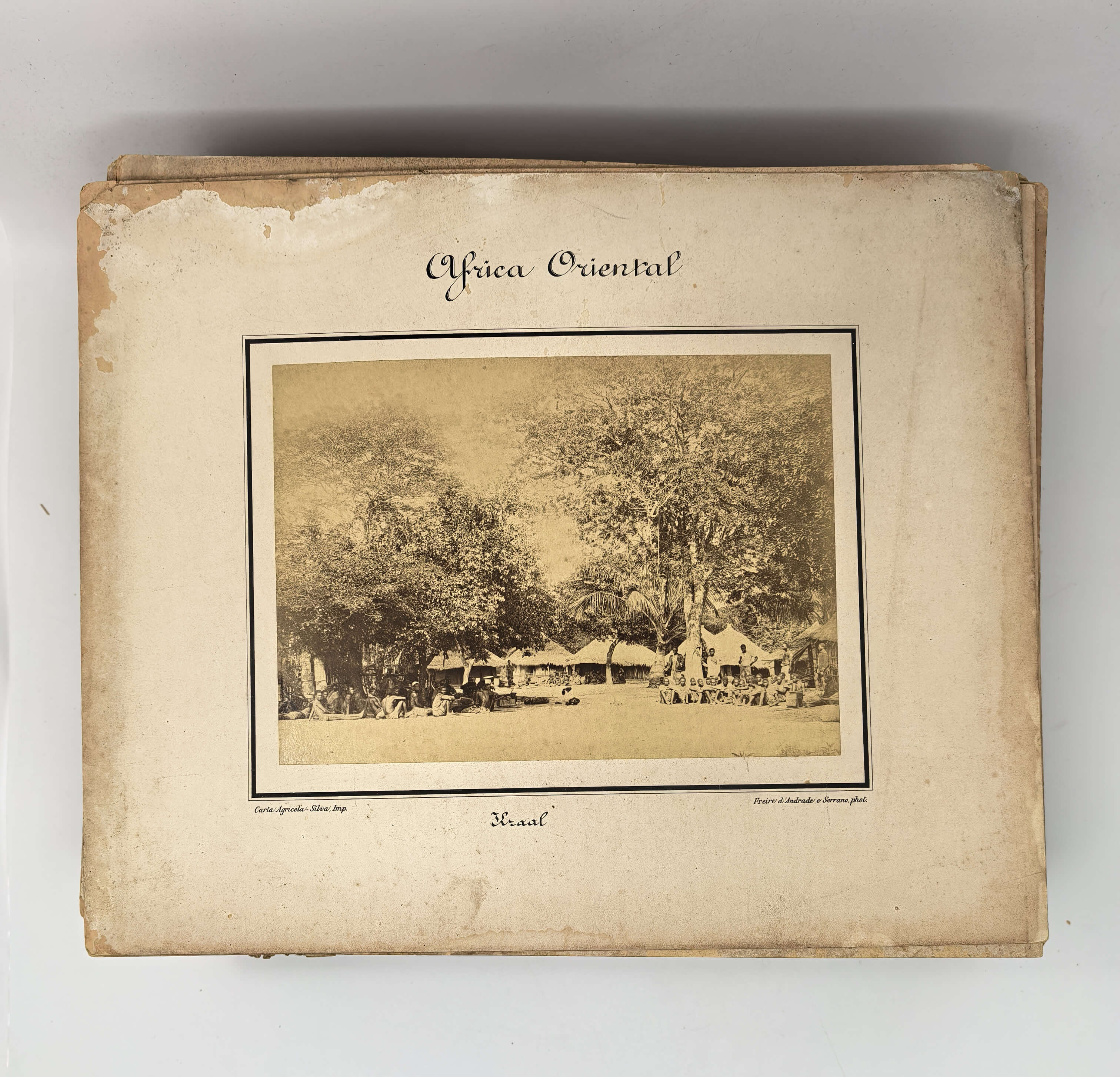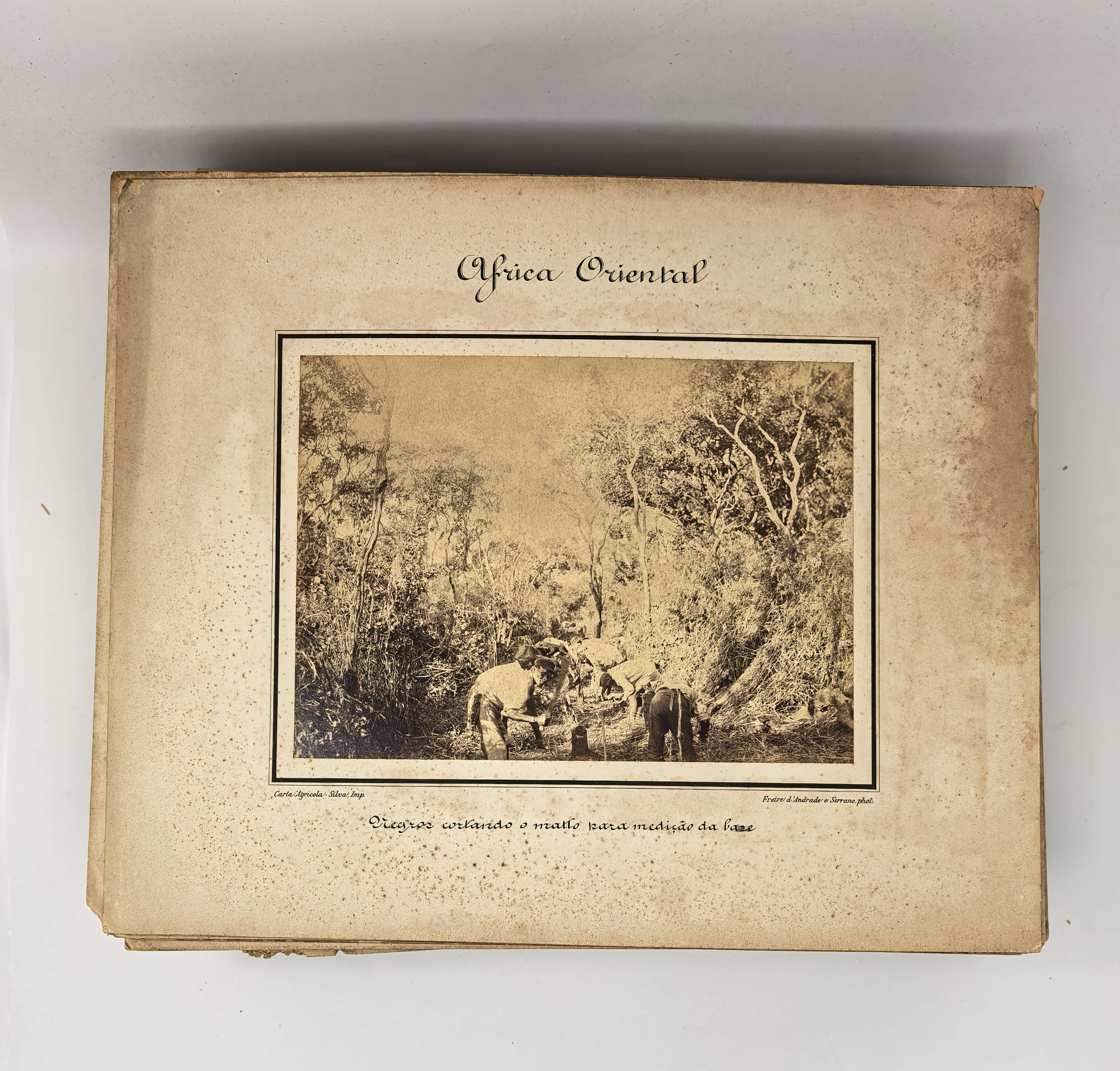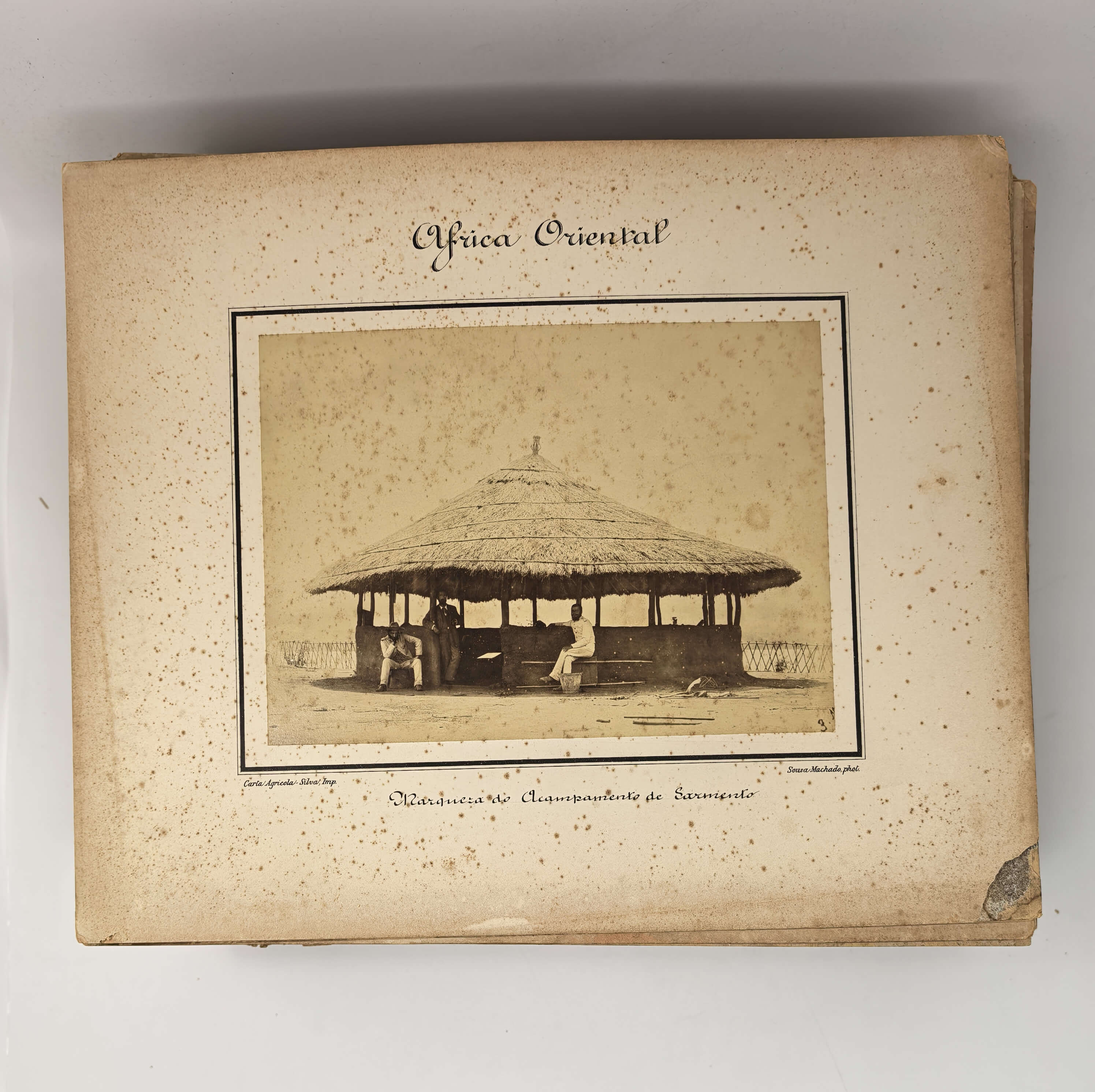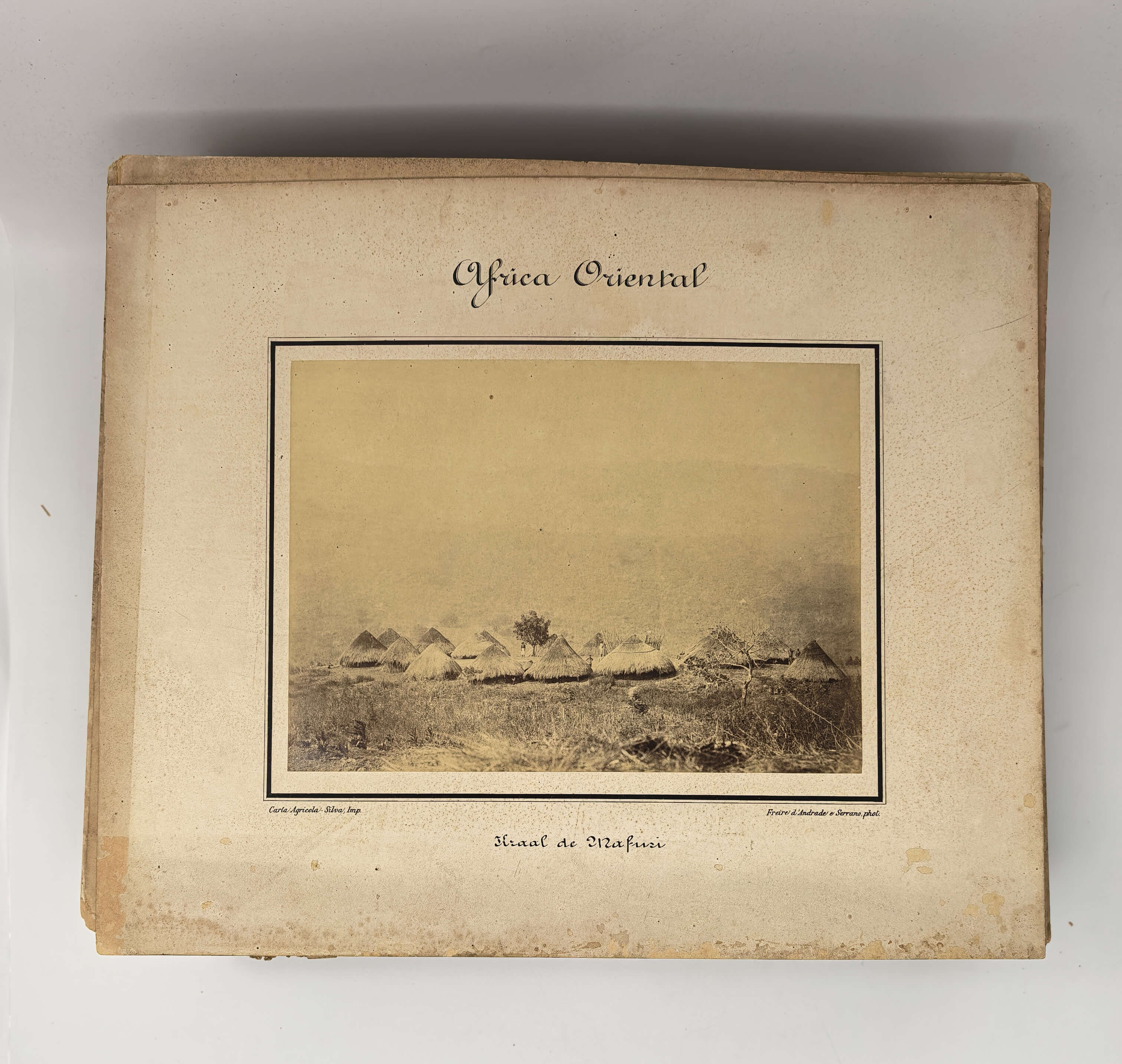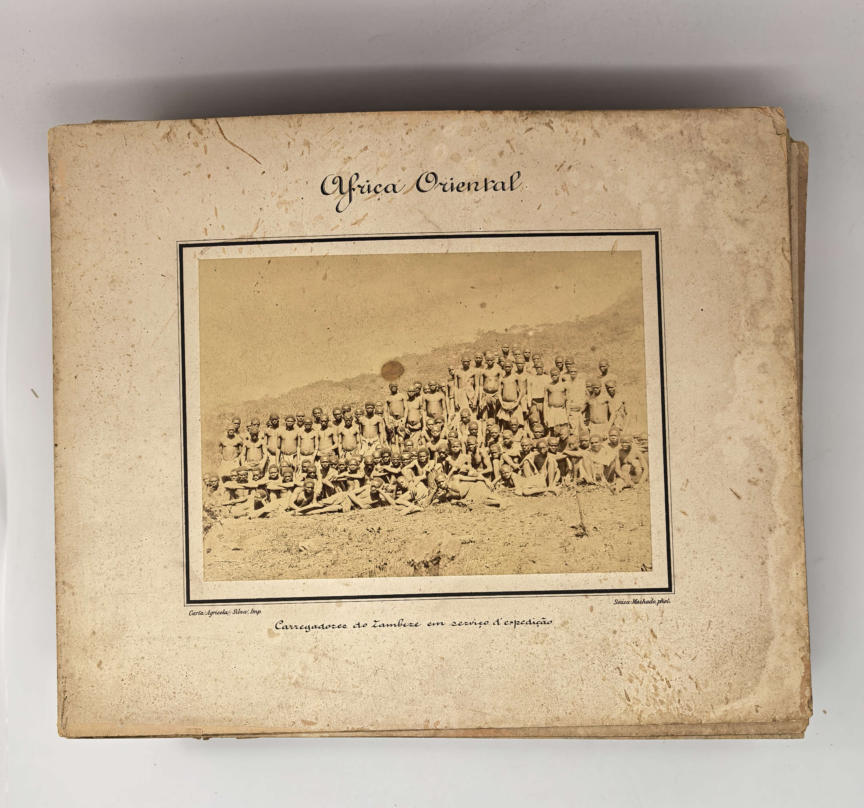 104 original albumen photographs (including eight duplicates), all but two are ca. 15,5x21,5 cm (6 x 8 ¼ in); two smaller images are ca. 11,5x16,5 cm (4 ½ x 6 ½ in). All photos are mounted on original card stock leaves ca. 29,5x36,5 cm (11 ¼ x 14 ¼ in), within printed black borders. All mounts with printed titles (general “Africa Oriental,” all but two smaller images also with specific titles), and credentials of the photographers (“Freire d’Andrade e Serrano, phot.” or “Sousa Machado, phot.”) and of the publishing office (“Carta Agricola-Silva Imp.”). Mounts with different degrees of foxing, about forty with water stains, chipping or damage on the margins, about twenty with losses of corners or parts of margins; Photos with varying degrees of mild to moderate fading; overall a good collection of interesting rare photos.