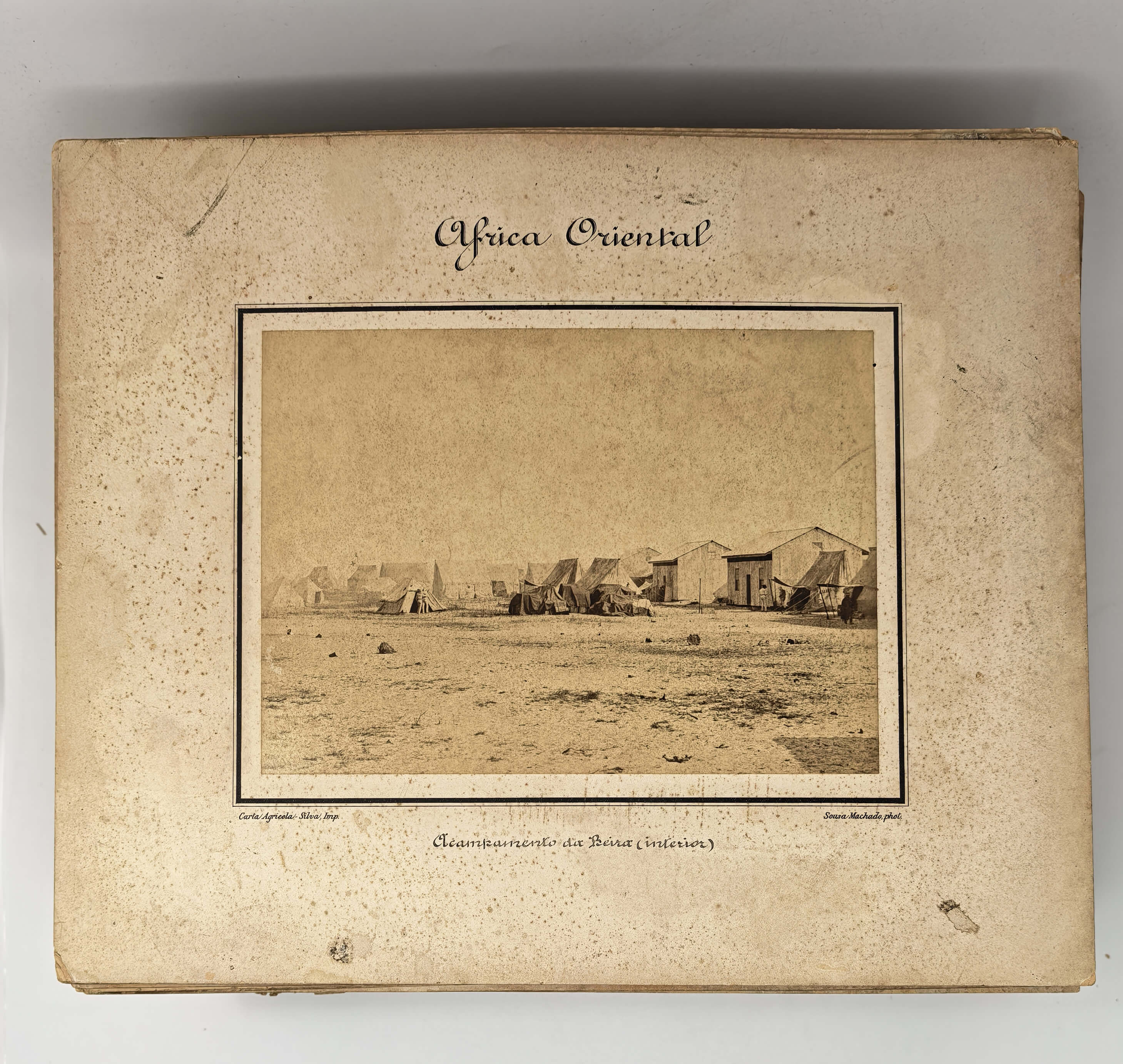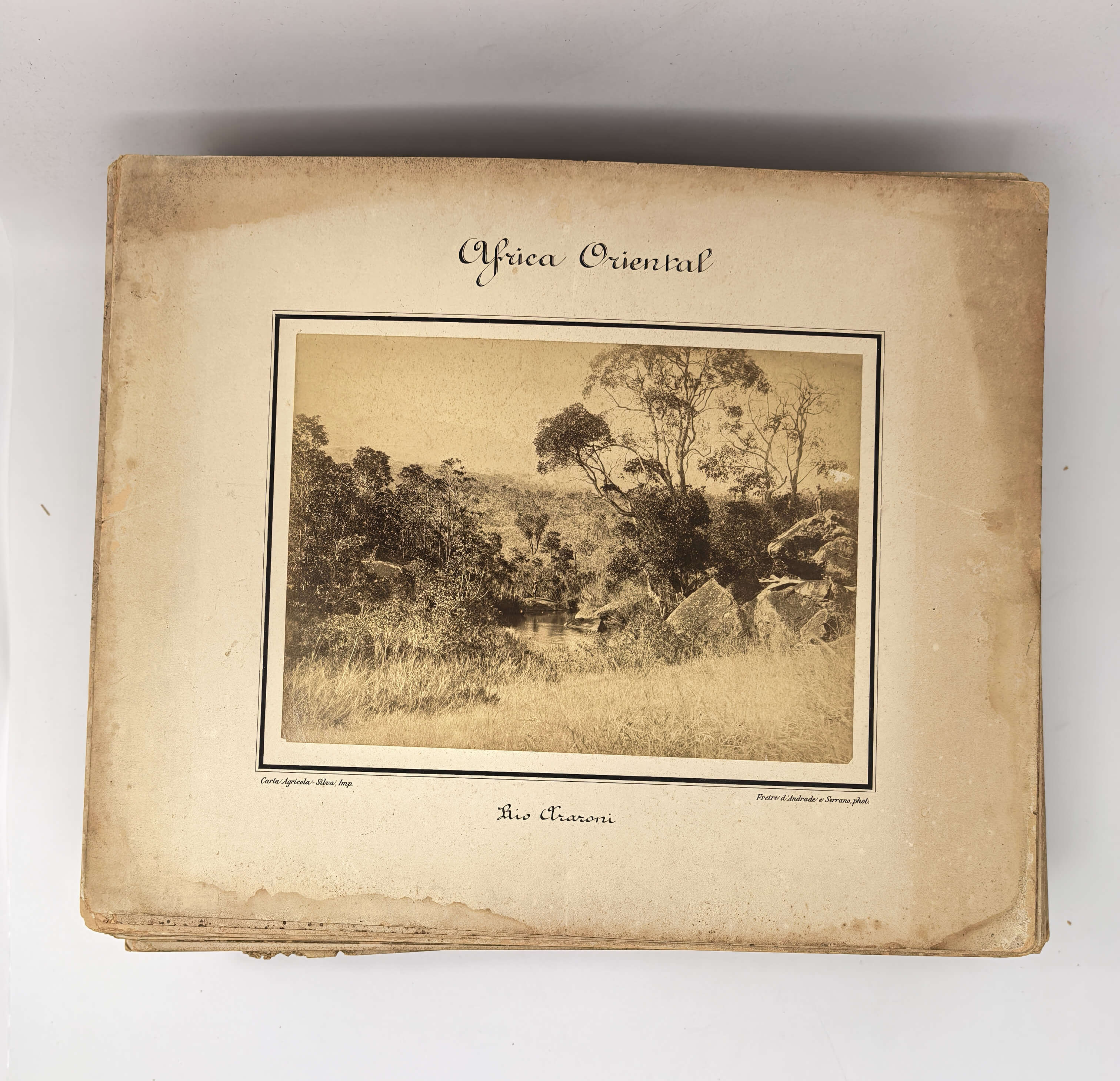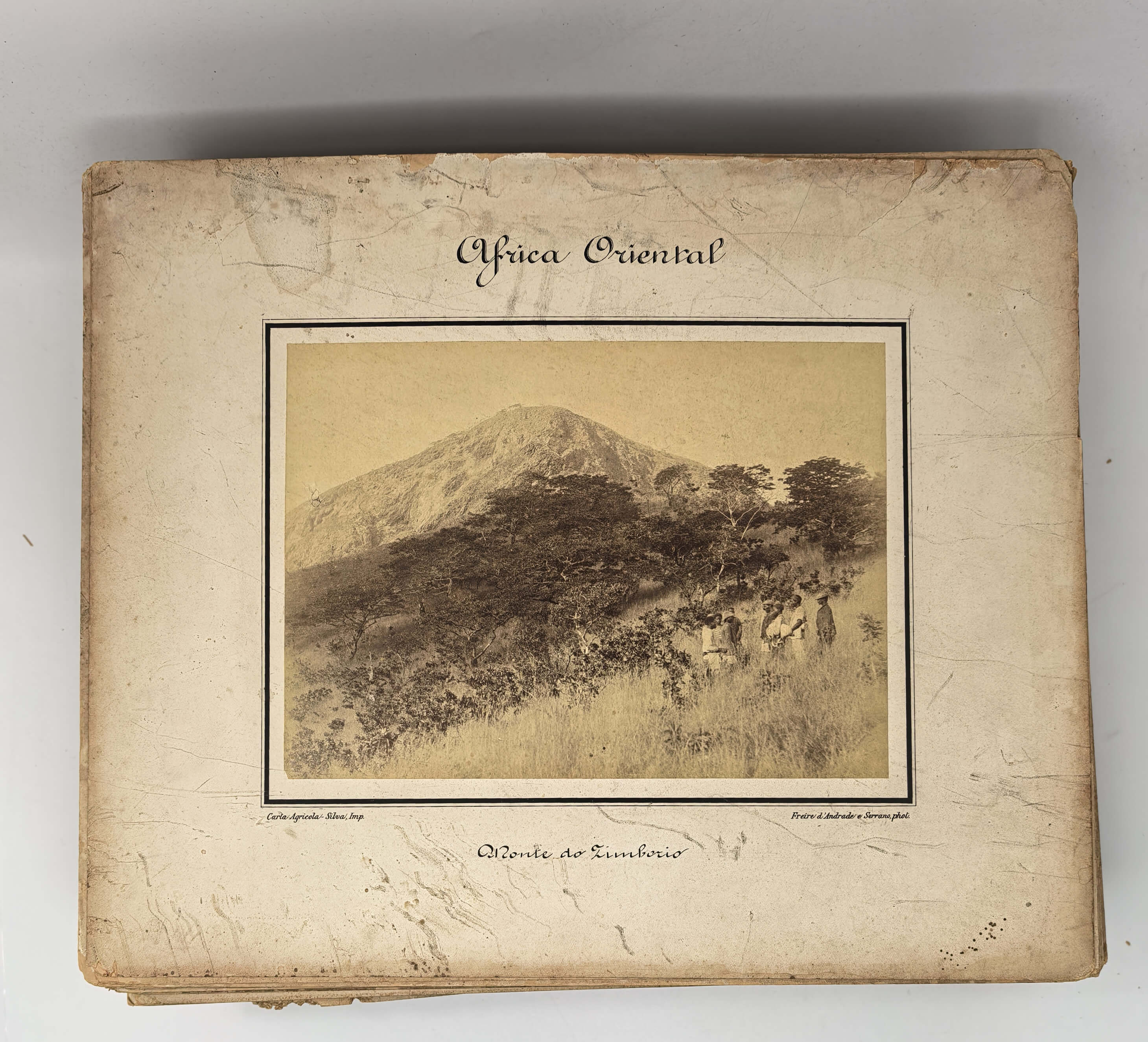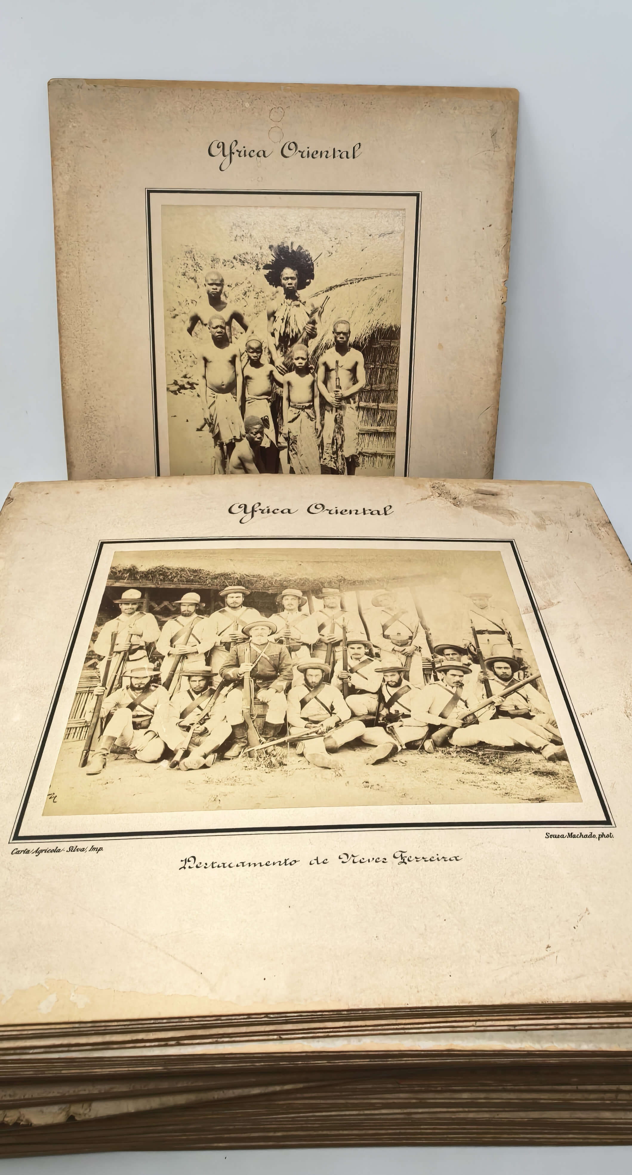 104 original albumen photographs (including eight duplicates), all but two are ca. 15,5x21,5 cm (6 x 8 ¼ in); two smaller images are ca. 11,5x16,5 cm (4 ½ x 6 ½ in). All photos are mounted on original card stock leaves ca. 29,5x36,5 cm (11 ¼ x 14 ¼ in), within printed black borders. All mounts with printed titles (general “Africa Oriental,” all but two smaller images also with specific titles), and credentials of the photographers (“Freire d’Andrade e Serrano, phot.” or “Sousa Machado, phot.”) and of the publishing office (“Carta Agricola-Silva Imp.”). Mounts with different degrees of foxing, about forty with water stains, chipping or damage on the margins, about twenty with losses of corners or parts of margins; Photos with varying degrees of mild to moderate fading; overall a good collection of interesting rare photos.