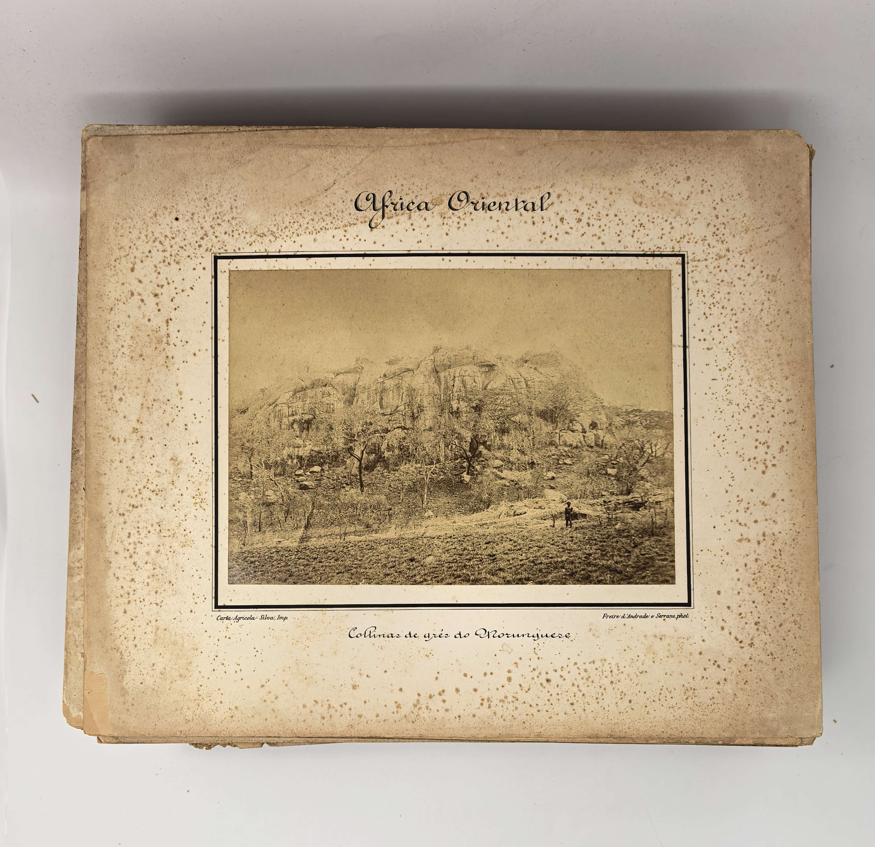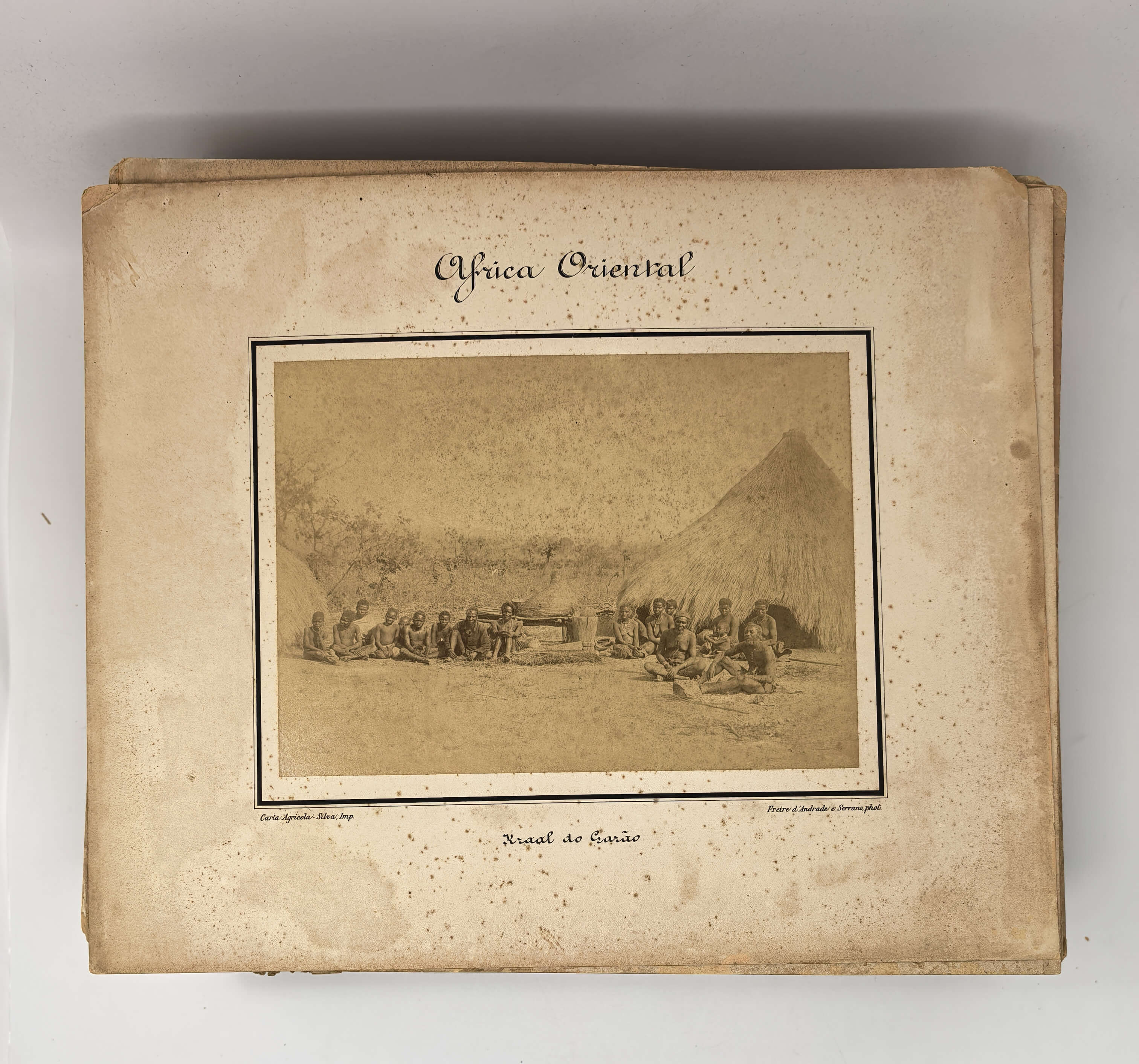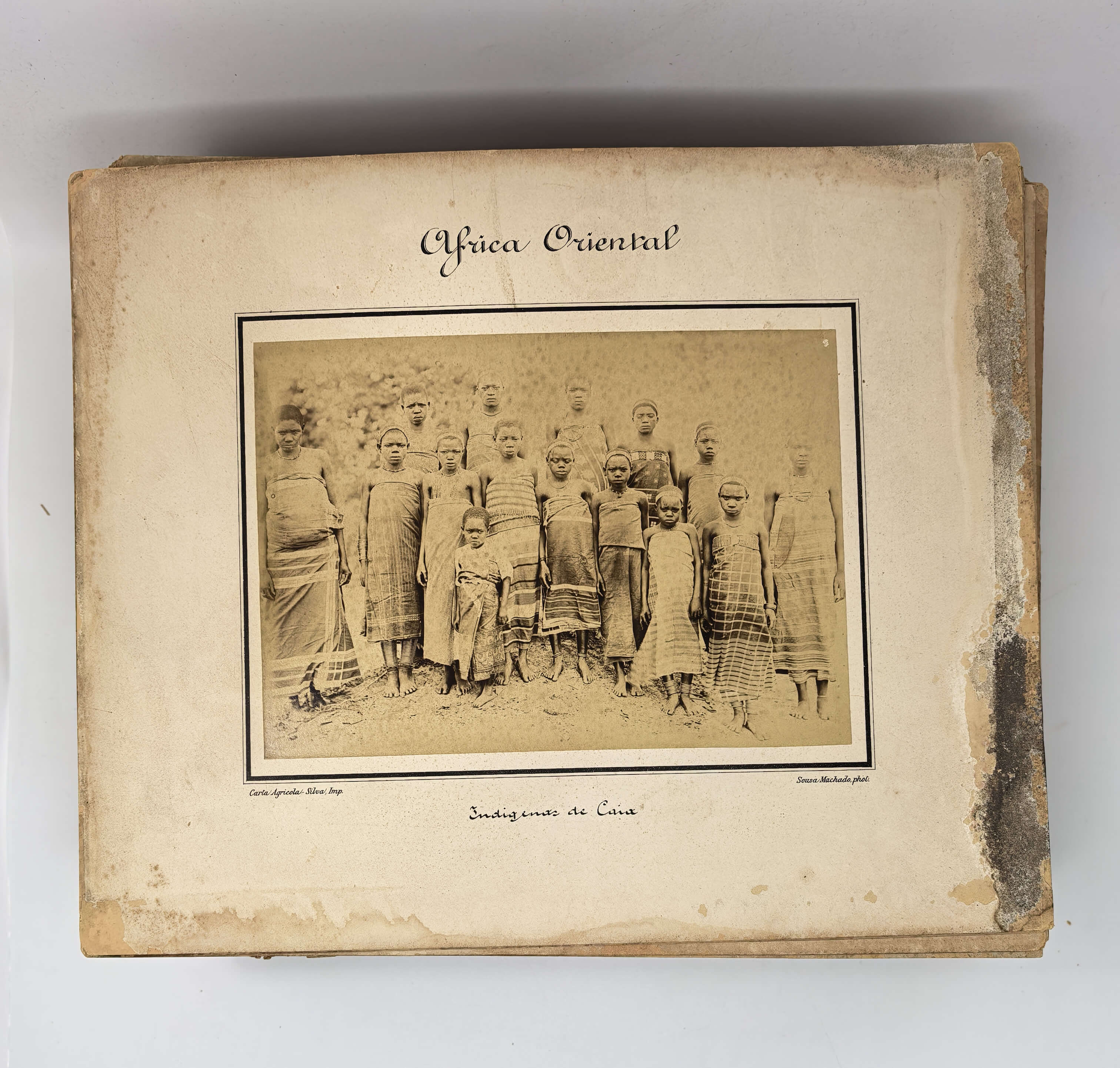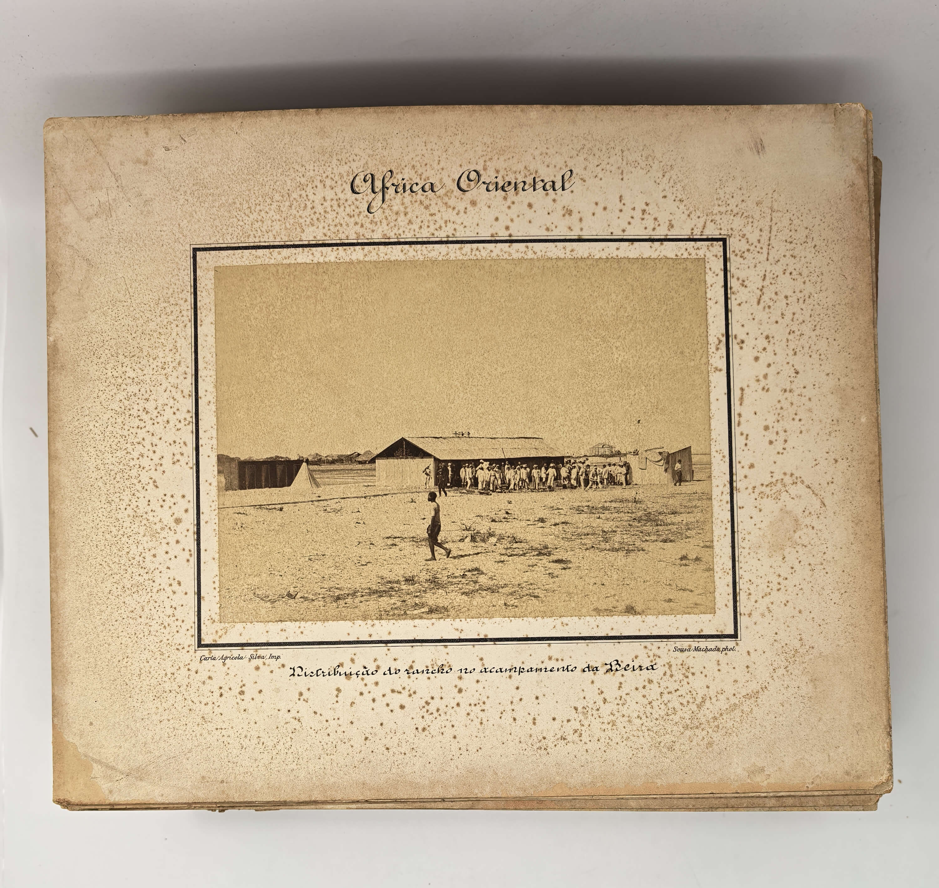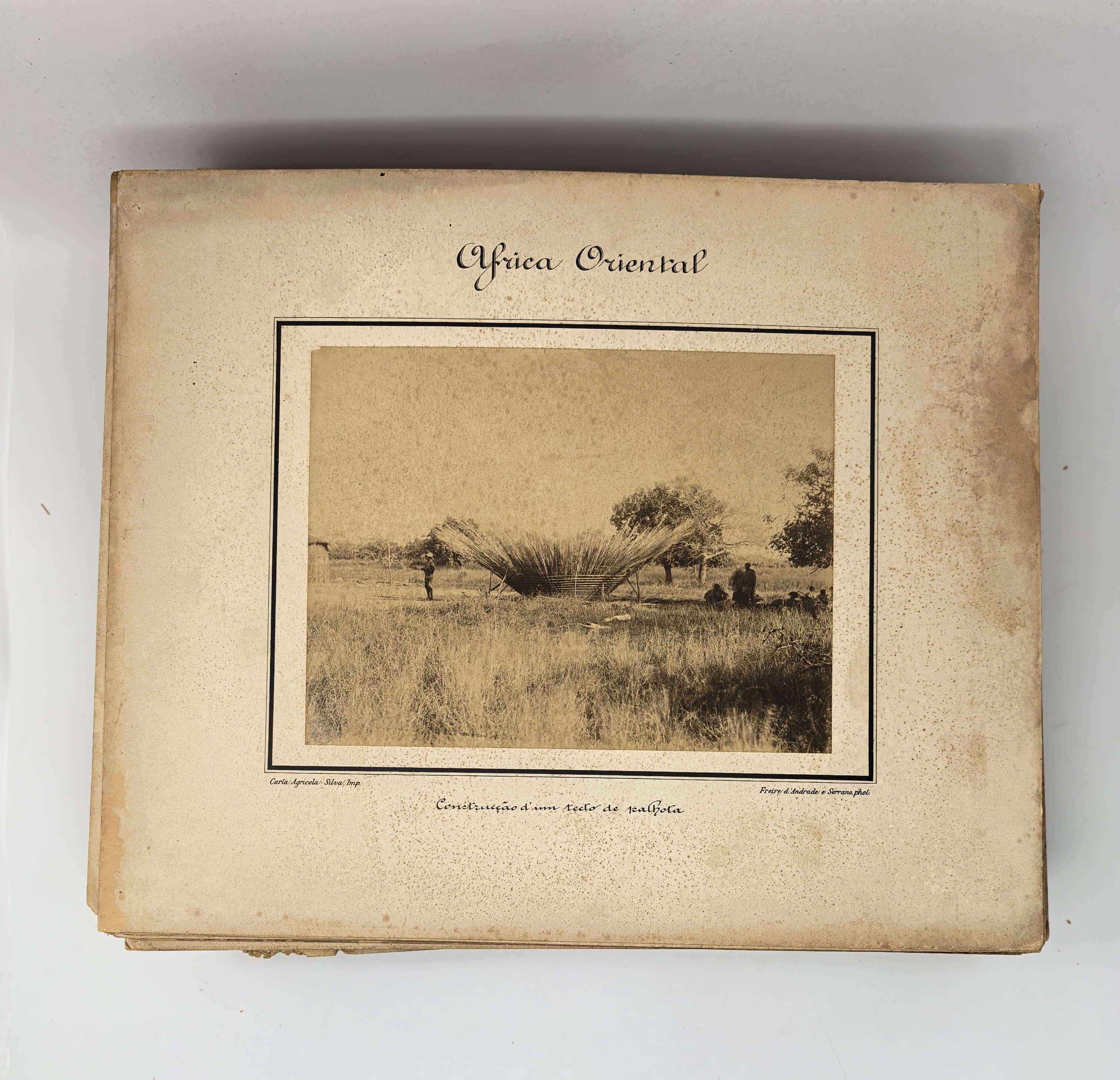 104 original albumen photographs (including eight duplicates), all but two are ca. 15,5x21,5 cm (6 x 8 ¼ in); two smaller images are ca. 11,5x16,5 cm (4 ½ x 6 ½ in). All photos are mounted on original card stock leaves ca. 29,5x36,5 cm (11 ¼ x 14 ¼ in), within printed black borders. All mounts with printed titles (general “Africa Oriental,” all but two smaller images also with specific titles), and credentials of the photographers (“Freire d’Andrade e Serrano, phot.” or “Sousa Machado, phot.”) and of the publishing office (“Carta Agricola-Silva Imp.”). Mounts with different degrees of foxing, about forty with water stains, chipping or damage on the margins, about twenty with losses of corners or parts of margins; Photos with varying degrees of mild to moderate fading; overall a good collection of interesting rare photos.