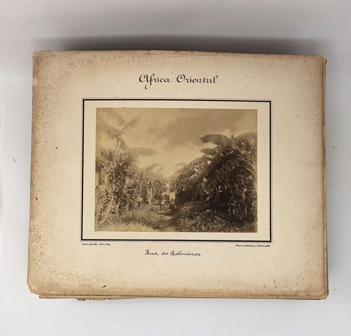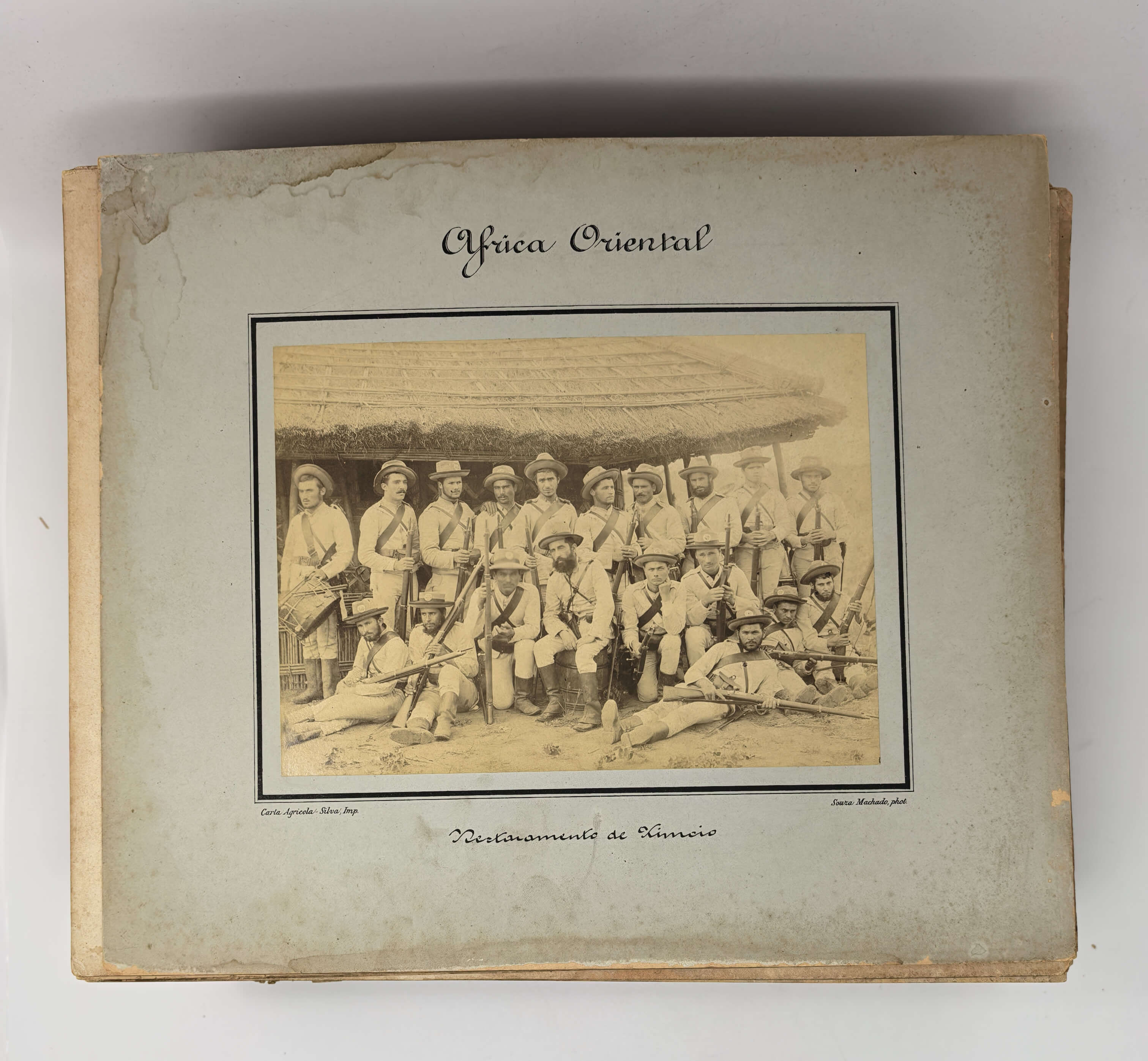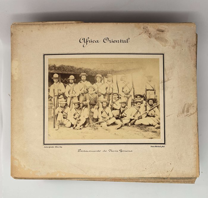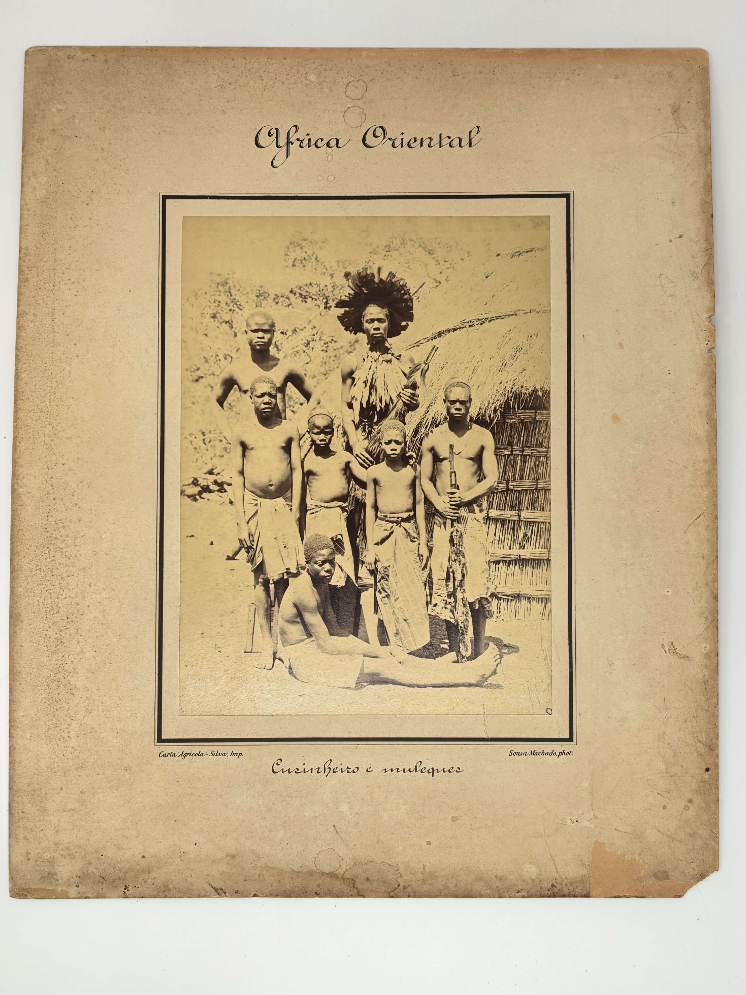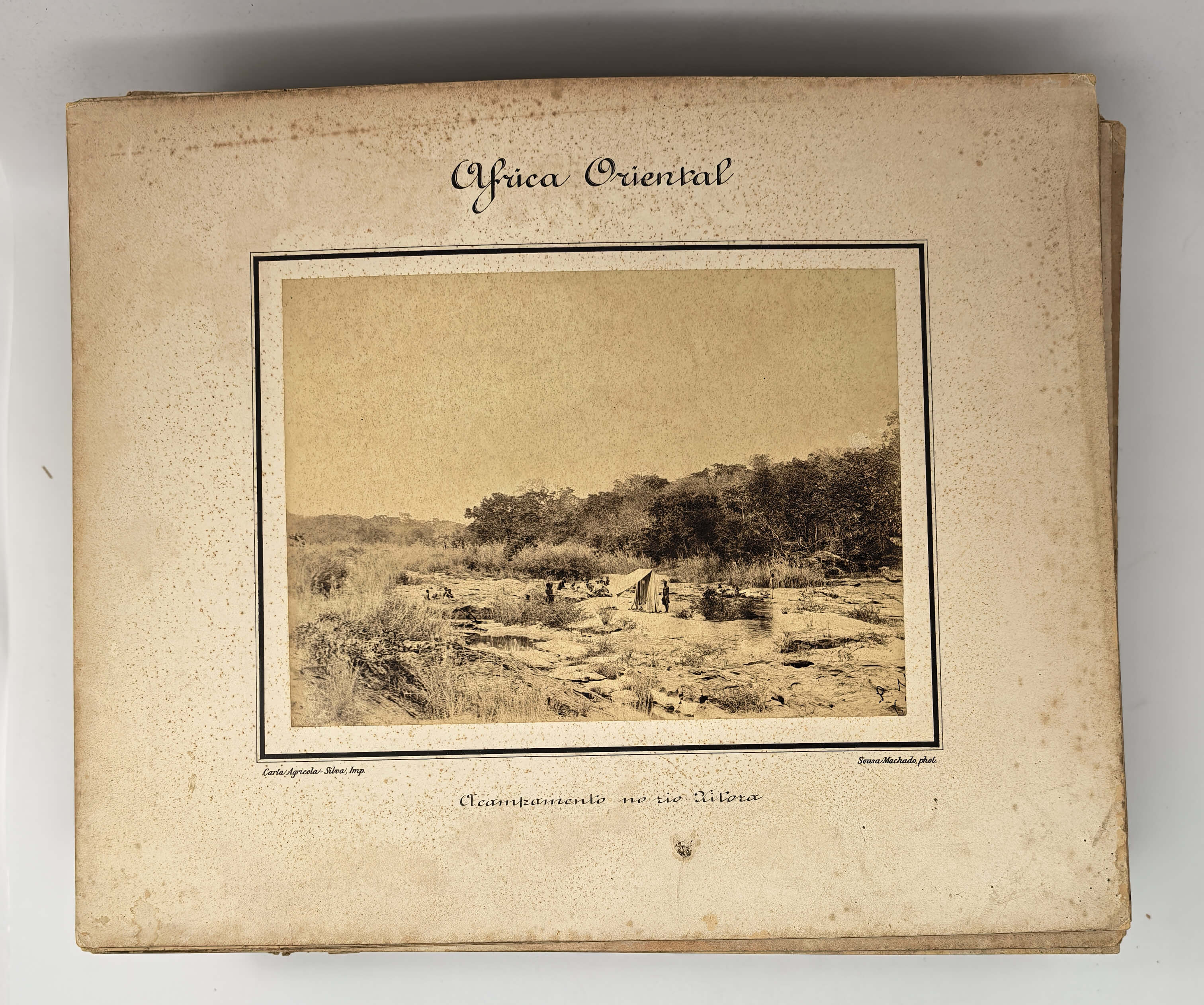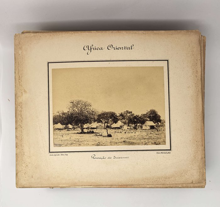 104 original albumen photographs (including eight duplicates), all but two are ca. 15,5x21,5 cm (6 x 8 ¼ in); two smaller images are ca. 11,5x16,5 cm (4 ½ x 6 ½ in). All photos are mounted on original card stock leaves ca. 29,5x36,5 cm (11 ¼ x 14 ¼ in), within printed black borders. All mounts with printed titles (general “Africa Oriental,” all but two smaller images also with specific titles), and credentials of the photographers (“Freire d’Andrade e Serrano, phot.” or “Sousa Machado, phot.”) and of the publishing office (“Carta Agricola-Silva Imp.”). Mounts with different degrees of foxing, about forty with water stains, chipping or damage on the margins, about twenty with losses of corners or parts of margins; Photos with varying degrees of mild to moderate fading; overall a good collection of interesting rare photos.