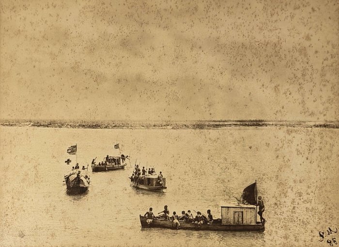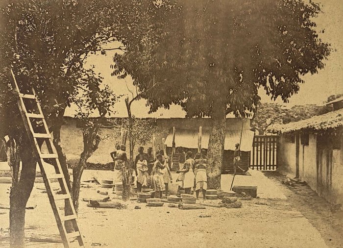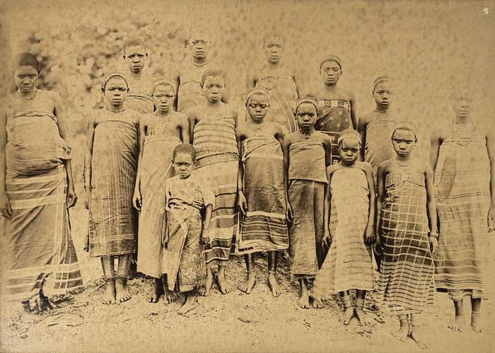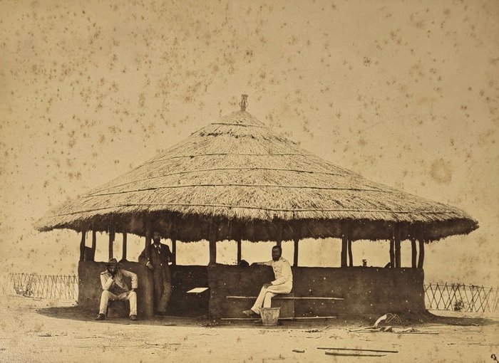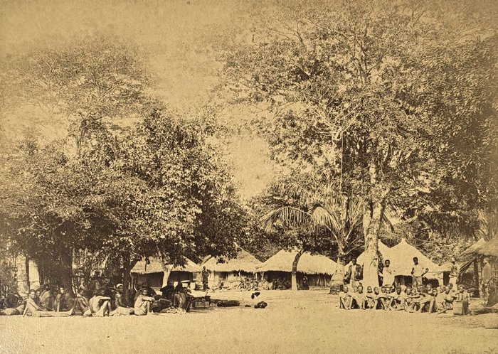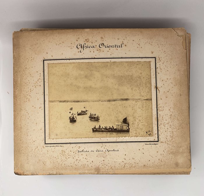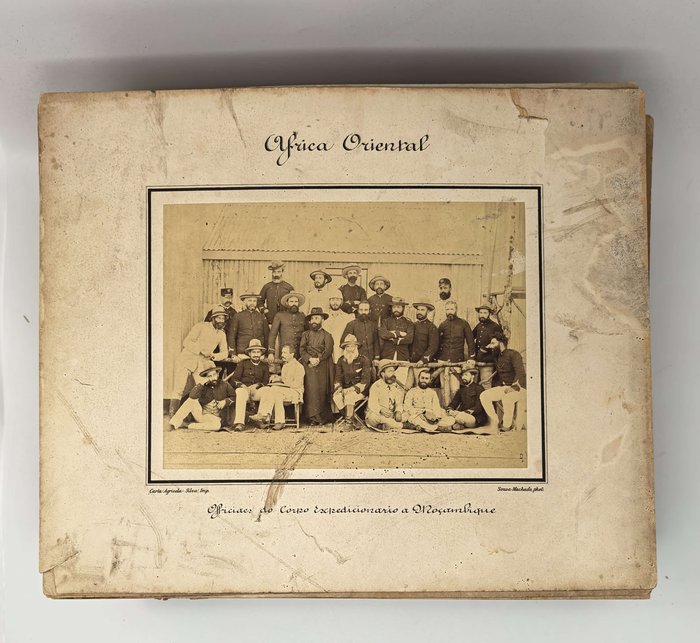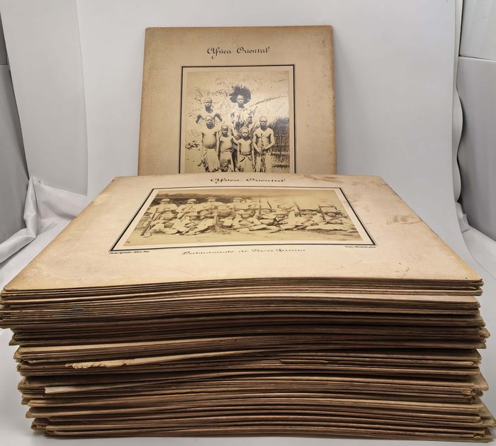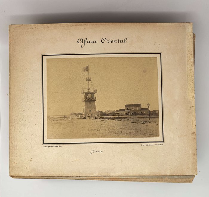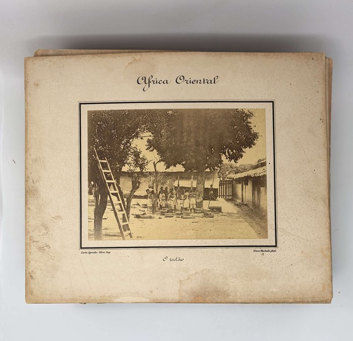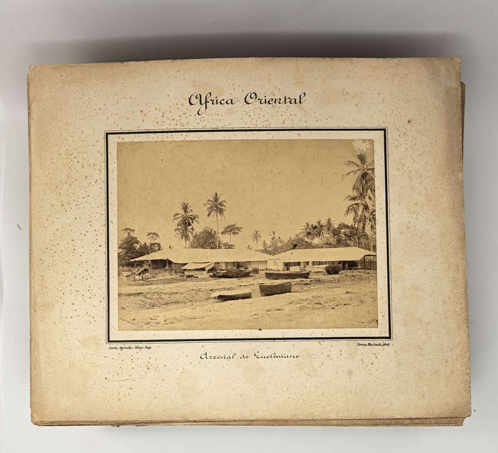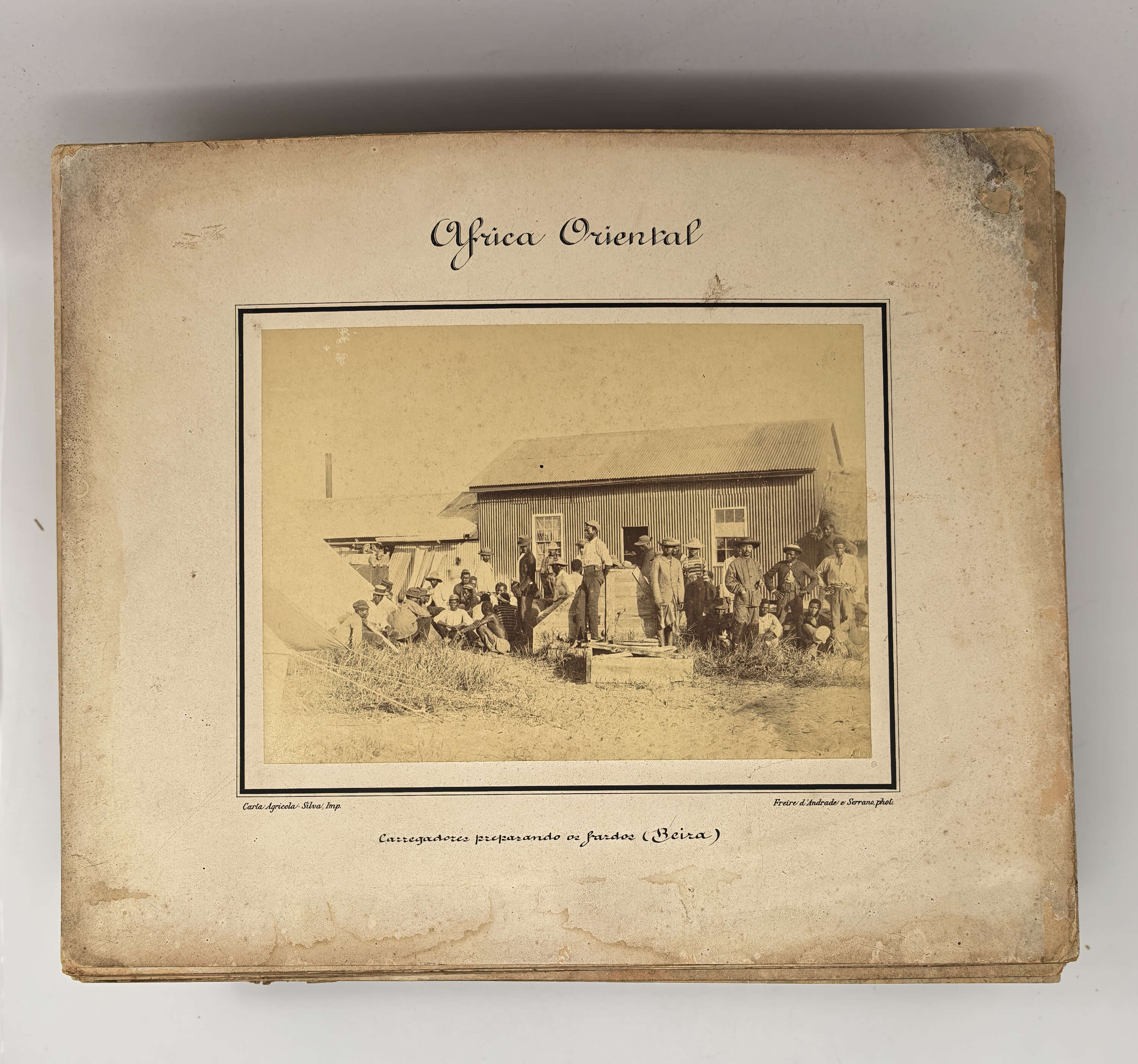 104 original albumen photographs (including eight duplicates), all but two are ca. 15,5x21,5 cm (6 x 8 ¼ in); two smaller images are ca. 11,5x16,5 cm (4 ½ x 6 ½ in). All photos are mounted on original card stock leaves ca. 29,5x36,5 cm (11 ¼ x 14 ¼ in), within printed black borders. All mounts with printed titles (general “Africa Oriental,” all but two smaller images also with specific titles), and credentials of the photographers (“Freire d’Andrade e Serrano, phot.” or “Sousa Machado, phot.”) and of the publishing office (“Carta Agricola-Silva Imp.”). Mounts with different degrees of foxing, about forty with water stains, chipping or damage on the margins, about twenty with losses of corners or parts of margins; Photos with varying degrees of mild to moderate fading; overall a good collection of interesting rare photos.