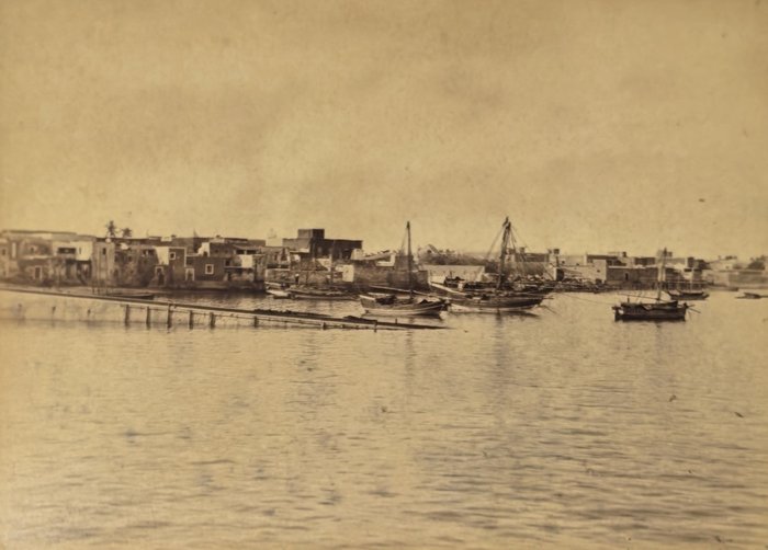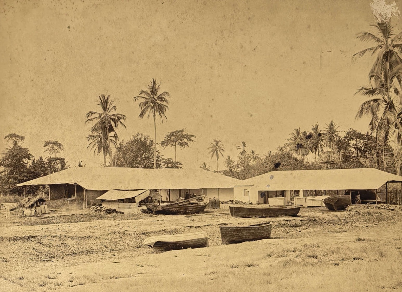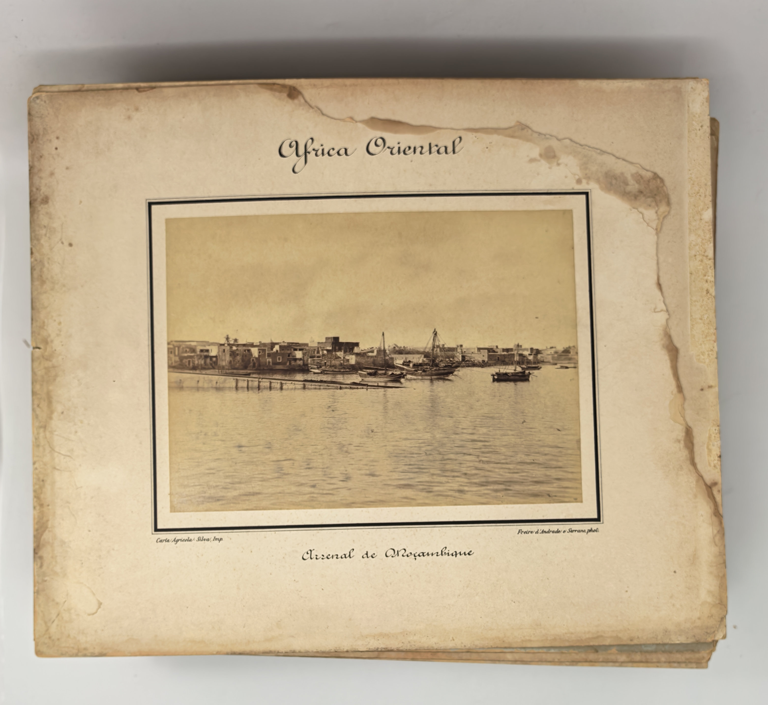 Eight interesting images taken during a Portuguese survey expedition up the Zambezi river show “praia do Vicente,” the town of Sena (Portuguese military post, native quarter, a street), expedition boats on the river near the town of Caia, expedition camp on the “Madziçua” (Maziua) River, native porters and girls from Caia. There are also views of Beira (waterfront street and a tower with a waving flag of Portuguese Mozambique, two views of the expedition camp, native porters), colonial capital “Moçambique”/Cidade de Pedra or Stone Town (“Arcenal de Moçambique,” “Mercado de Moçambique,” “Escavação d’una cisterna em Moçambique”), Quilemane (governor’s residence, “Rua da fabrica,” arsenal), Garvao, Araroni River, “Monte do Zimborio,” “kraal de Mafusi,” “kraal de Garão,” construction of a grass roof to a hut, expedition camps in “Xiden,” “Saranbagera,” “Lagoa Natxanha,” villages of “Cruabumba,” “Inxenxe,” “Vueza,” “Framaja” &c.
