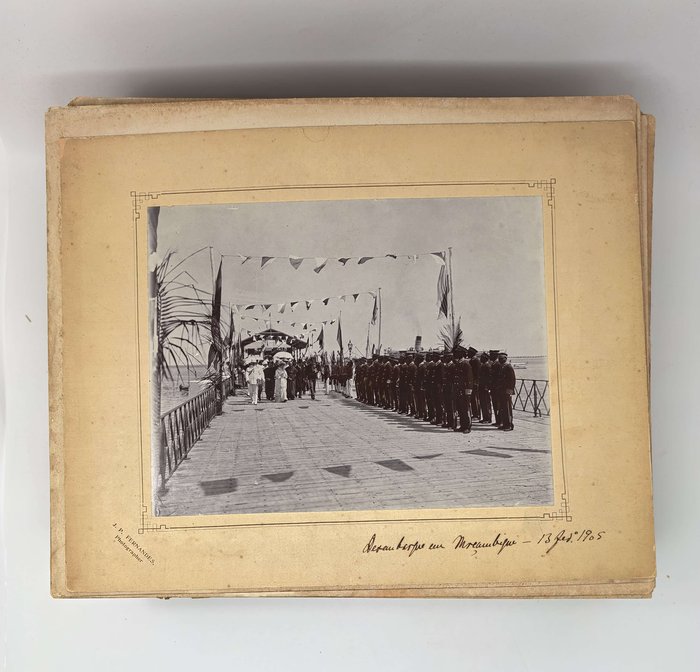 Historically significant extensive collection of 104 large original albumen photographs, documenting Portuguese initiative in the 1890s to solidify the western border of their colony in East Africa (Portuguese Mozambique) – with the Boer Transvaal or South African Republic (modern-day South Africa) and the newly chartered territory of the British South Africa Company, later known as Southern Rhodesia (modern-day Zimbabwe). The tension between Britain and Portugal over their territories in East Africa rose in the late 1880s, after it became obvious that the former was expanding its influence into the new regions of Southern Africa (Matabeleland and Mashonaland), seeking the gateway to the Indian Ocean, which led through the Portuguese possessions between the Zambezi and Limpopo Rivers. The Royal charter to the British South Africa Company in 1889 empowered its founder, Cecil Rhodes, to sign a treaty with Lobengula, one of the chiefs on the Manica borderlands, which encroached on the Portuguese sphere of influence (parts of modern-day Manicaland in Zimbabwe and bordering Manica Province of Mozambique). This led to an armed conflict between Portuguese and BSAF forces in November 1890 – May 1891, which resulted in the British capture of Massi Kessi, a Portuguese fort close to the border. The Anglo-Portuguese boundary treaty, signed on June 11, 1891, had the captured Portuguese territories in the Manica region returned, but permission was granted to the British to construct a railway to the Indian Ocean along the Pungwe River.