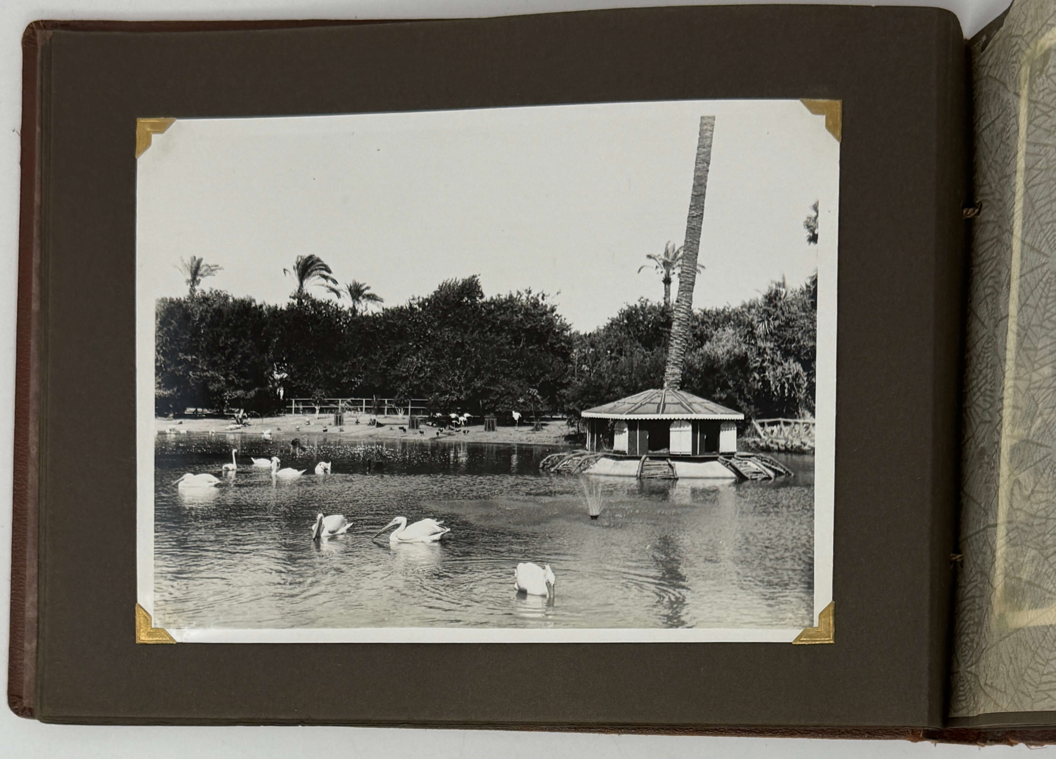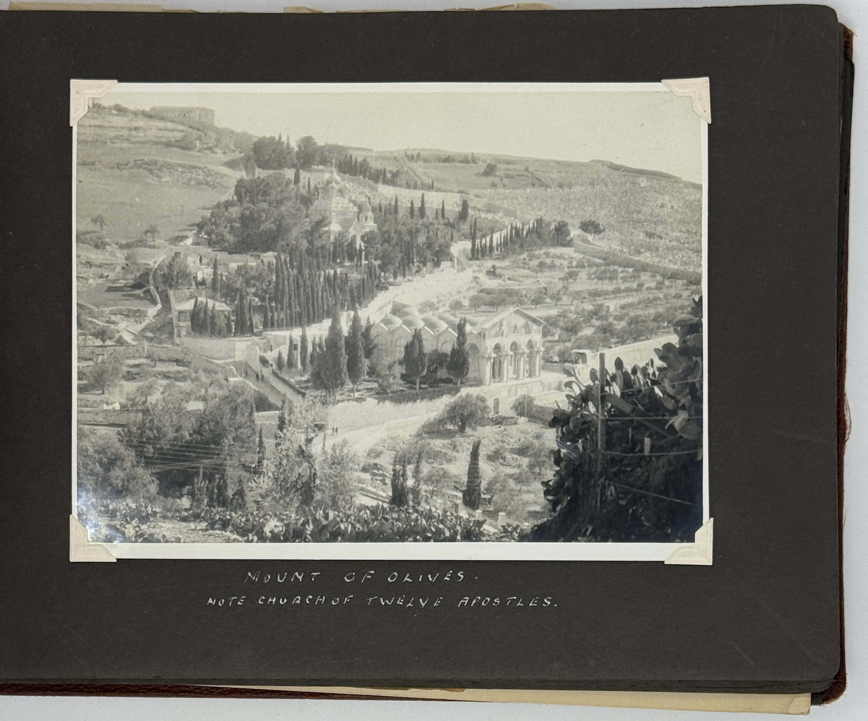 Album 1. Oblong Folio album (ca. 28,5x36,5 cm or 11 ¼ x 14 ¼ in). 24 card stock leaves. With 96 mounted original gelatin silver photos, including over twenty large images from ca. 20x28 cm (7 ¾ x 11 in) to ca. 16x21,5 cm (6 ¼ x 8 ¼ in); the rest of the photos (some are real photo postcards) are from ca. 13x18 cm (5x7 in) to ca. 9x12 cm (3 ½ x 4 ½ in). All but a few photos with period white ink captions on the mounts; two large images of the Great Pyramids of Giza and the Sphinx with the compiler’s extensive ink notes on verso. Period brown quarter cloth album with papered boards, fastened with a string. Binding rubbed on extremities, spine and corners with tears and minor losses, several mounts and photos with minor creases, a few photos mildly faded, but overall a very good album with strong interesting photos.