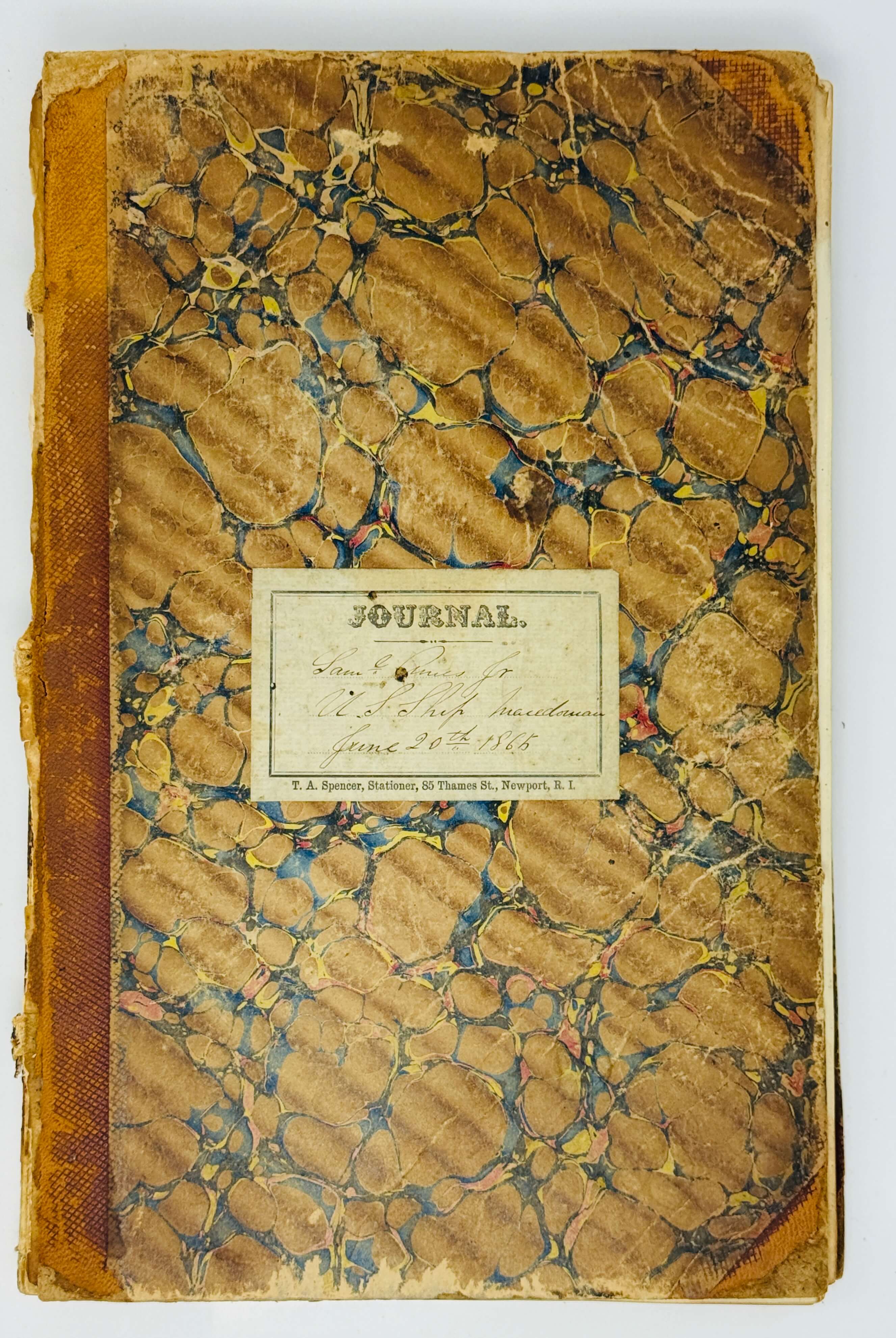 Folio logbook (ca. 33,5x21 cm or 13 ¼ x 8 ¼ in). Ca. 92 leaves with printed forms completed in hand, filled in on recto and verso; in all ca. 180 pp of text; with ca. 36 blank leaves at the rear. Brown ink on lined paper. Original light brown quarter sheep journal with marbled papered boards; front cover with an original printed label “Journal” and manuscript text “Saml. Ames Jr., U.S. Ship Macedonian, June 20th, 1865;” the compiler’s handwritten name (“Saml. Ames Jr.”) on one of the first blank leaves. Binding rubbed on extremities, from cover detached from the stub, ink of the text slightly faded, but overall a very good, internally clean journal with legible text.