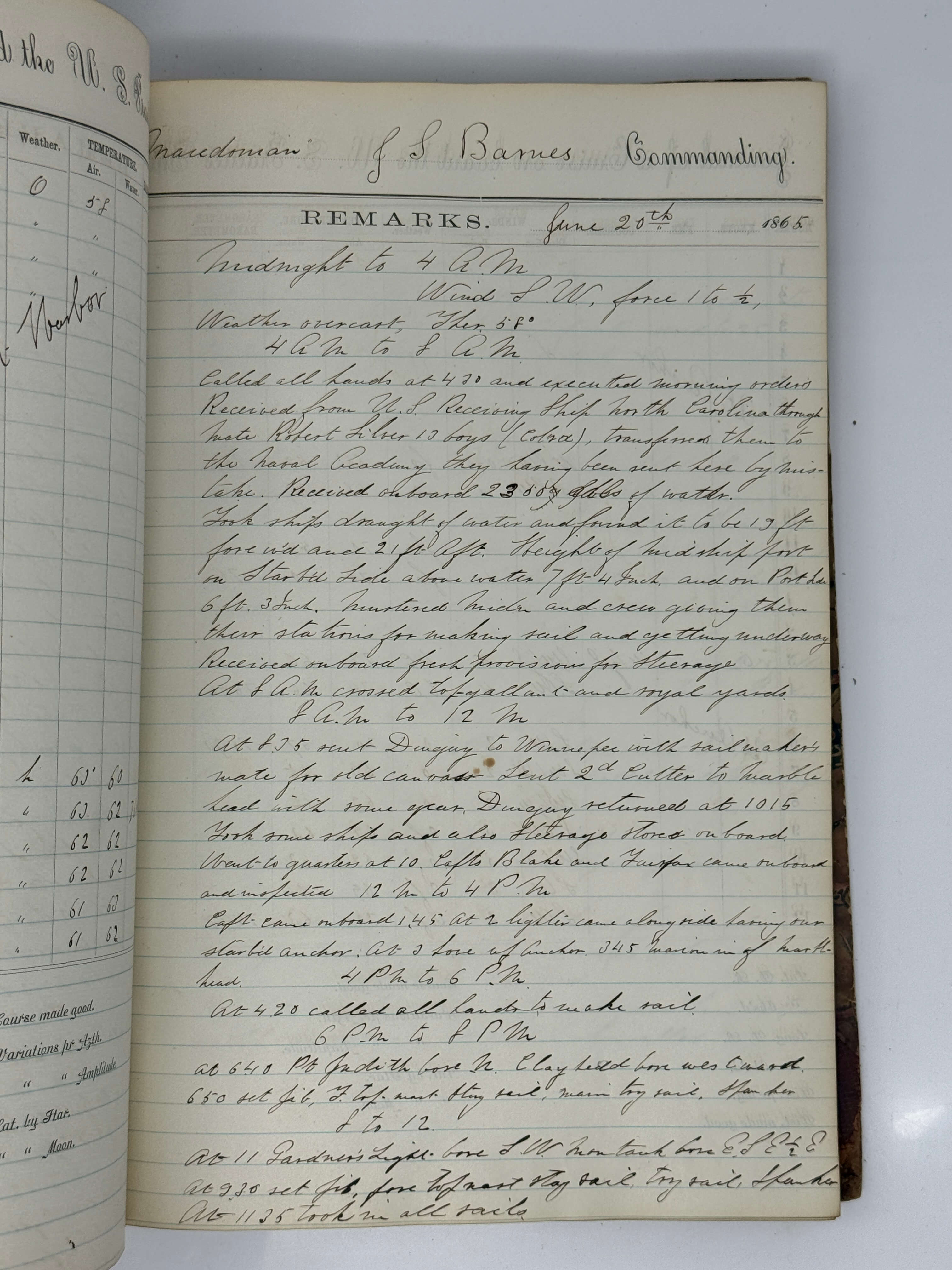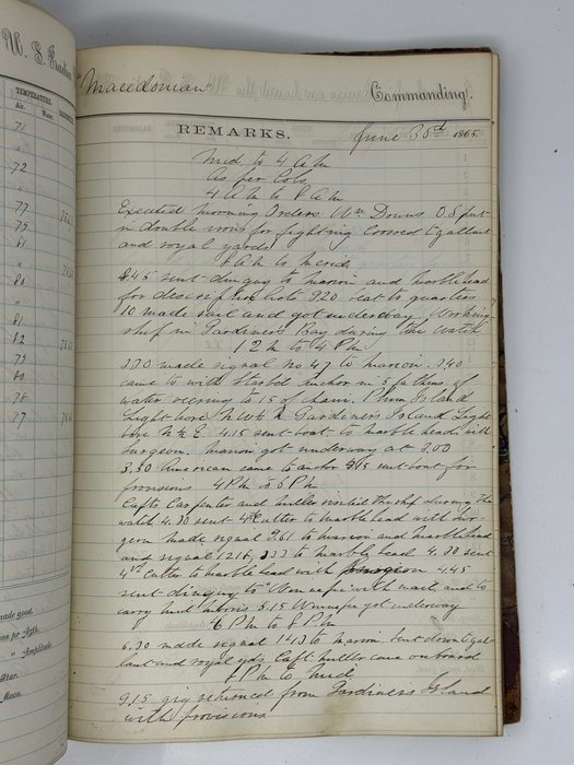 Historically significant original logbook of U.S.S. “Macedonian” - a participant of Commodore Matthew Perry’s expedition to Japan (she was one of the ten American ships entering Edo Bay, Japan on February 13, 1854), a part of the U.S. West Indies Squadron during the American Civil War, and in 1863-1870 - a practice ship of the United States Naval Academy. The logbook documents her voyage from Newport, Rhode Island, to Annapolis, in June-September 1865, just weeks after the end of the American Civil War. At the beginning of the war, the Academy evacuated to Newport and returned to its original location in the summer of 1865, with all its staff, ships and students.