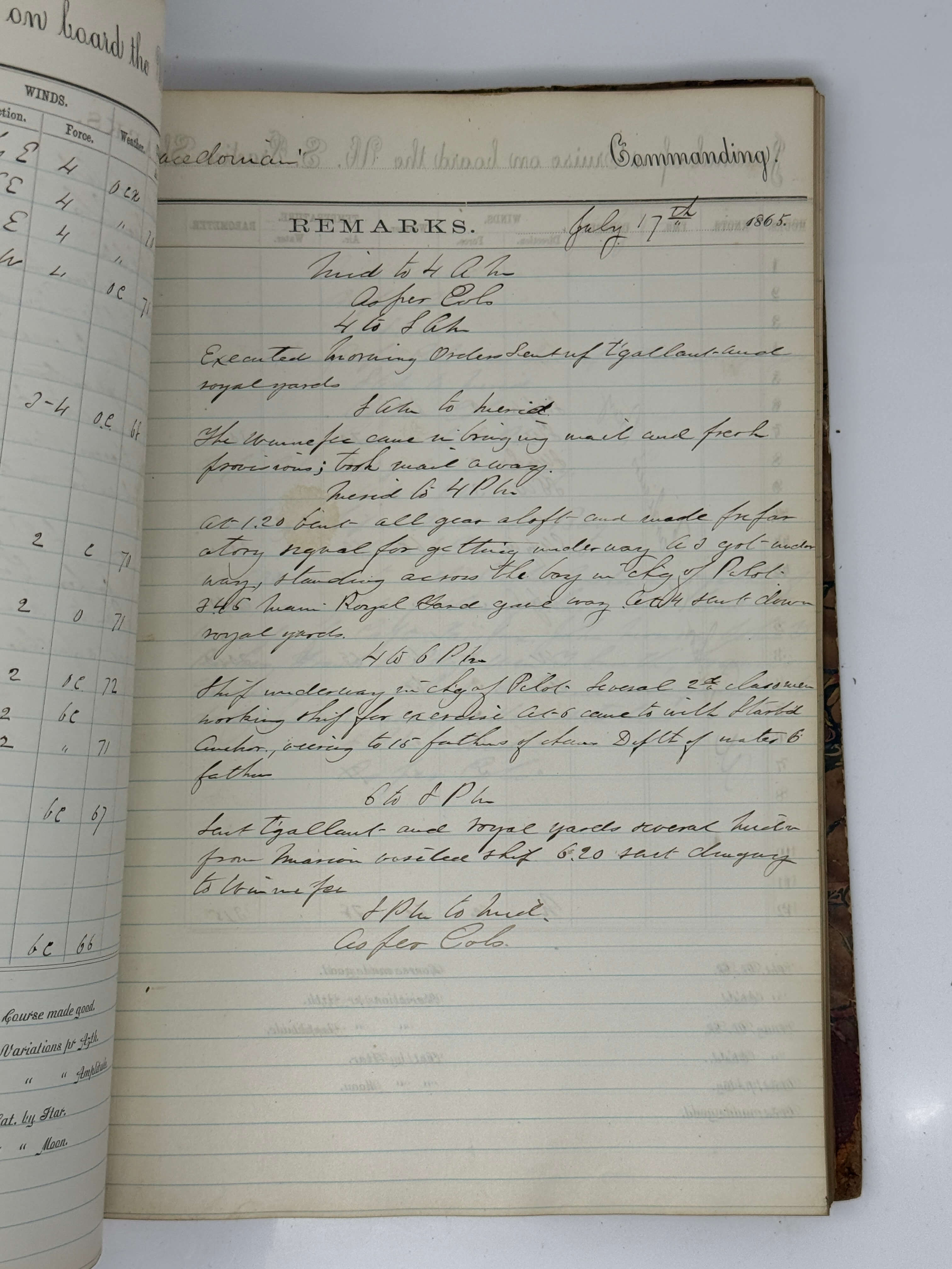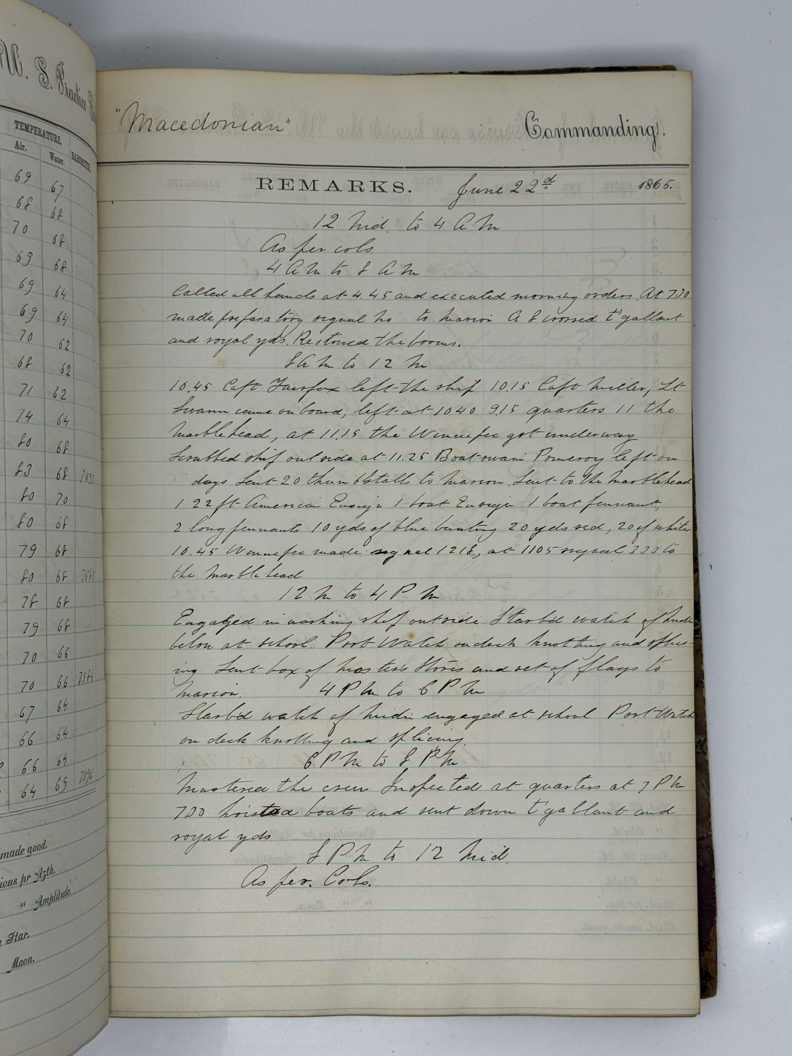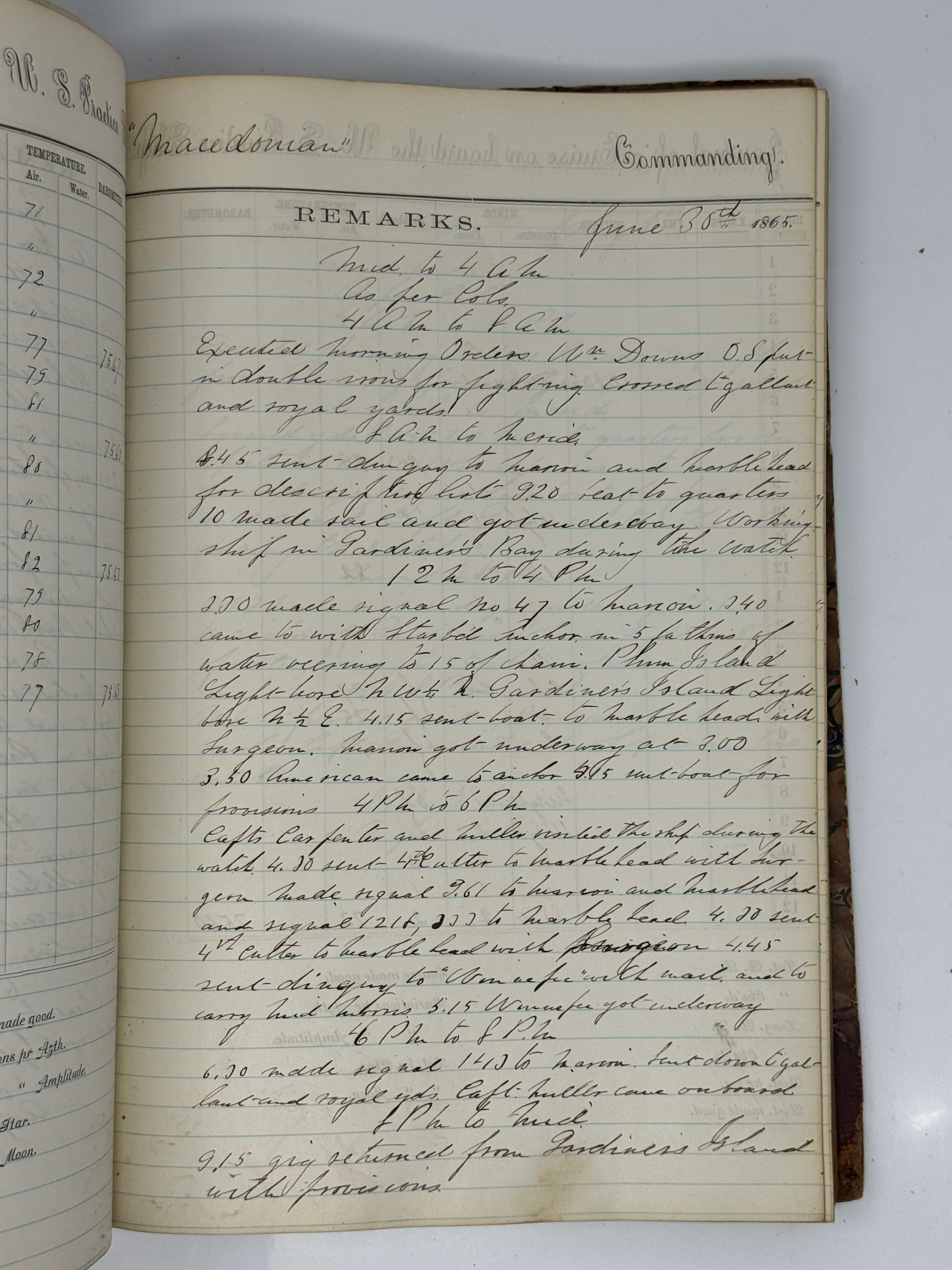 The logbook starts on June 13, 1865, when the “Macedonian” was preparing for her departure, and ends with her arrival at Hampton Roads and Chesapeake Bay on September 10-13. Most of the summer she spent in the Gardiner and Buzzards Bays off the coast of New England, with several visits to New London and New Bedford. The logbook contains the data about the ship’s course and position, winds, air temperature, barometer readings, operations with sails; records all midshipmen leaving for shore and returning, officers visiting the ship, received or sent stores, supplies and equipment; studies, exercises and drills on board (using sextant, “tacking & wearing ship”, “reefing top sails,” “practical seamanship,” “infantry drill,” firing exercises, &c.), cleaning and coaling the ship, taking observations, &c. There are also frequent notes on punishments (extra duty hours, putting on “blacklist,” solitary confinement, confinement in single or double irons, &c.), given for various violations - disorderly conduct, disobeying orders, skulking work, leaving ship without permission, “being late with hammocks,” not being at their stations, “being under the infliction of liquor,” bringing liquor on board, intoxication, abusing other midshipmen, &c. There is also a case of court martial of midshipman William Smith (July 25), who was found guilty of “bringing liquor on board [&] drunkenness” and was “sentenced for 20 days confinement in double irons and reduced rations with loss of 1 month pay.”