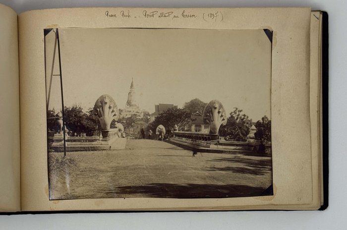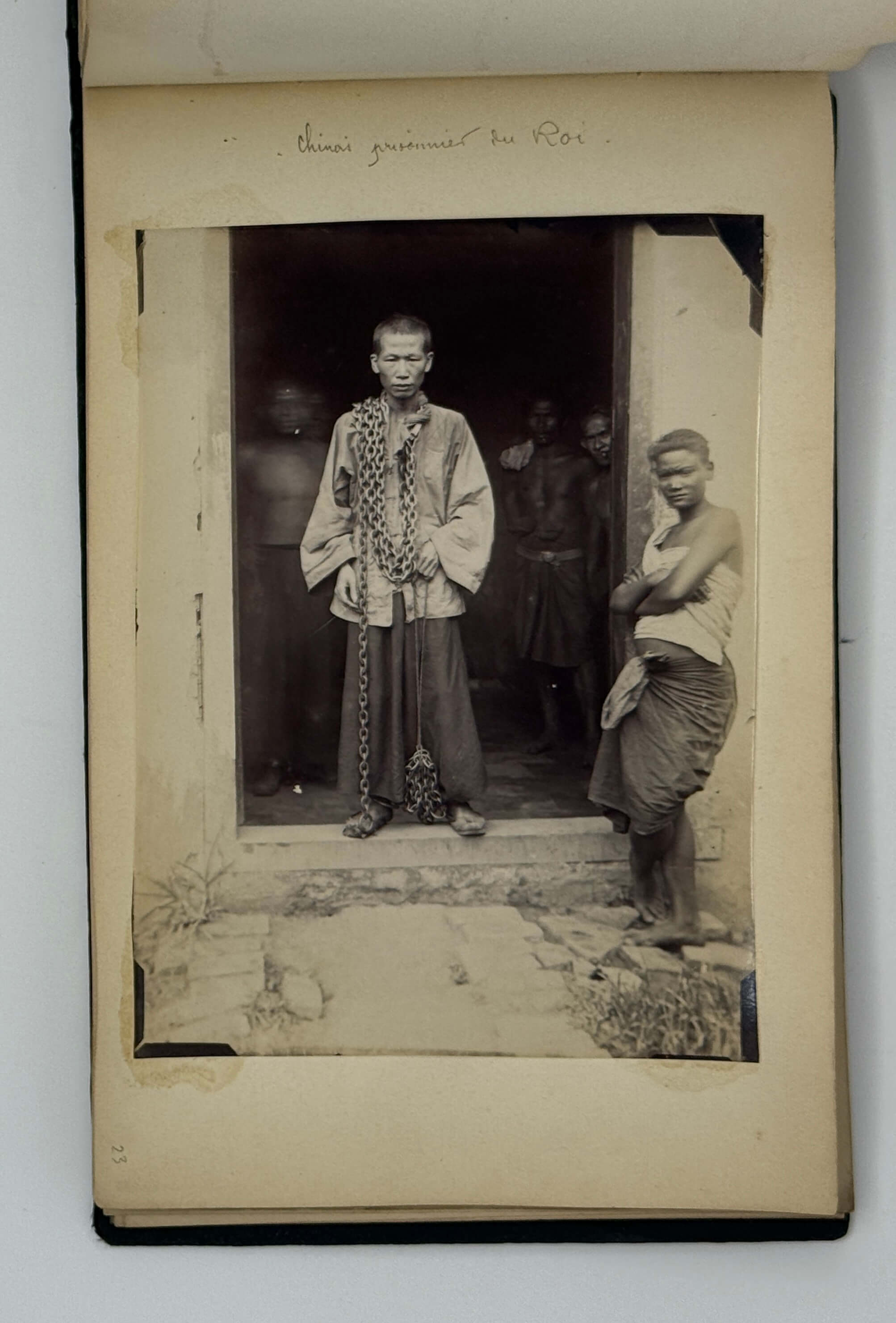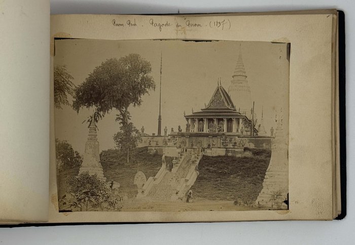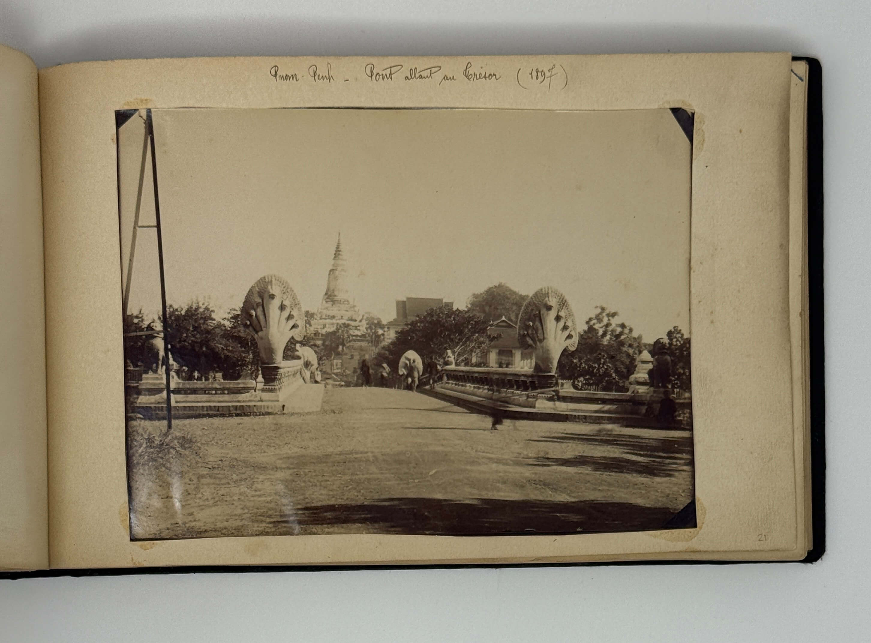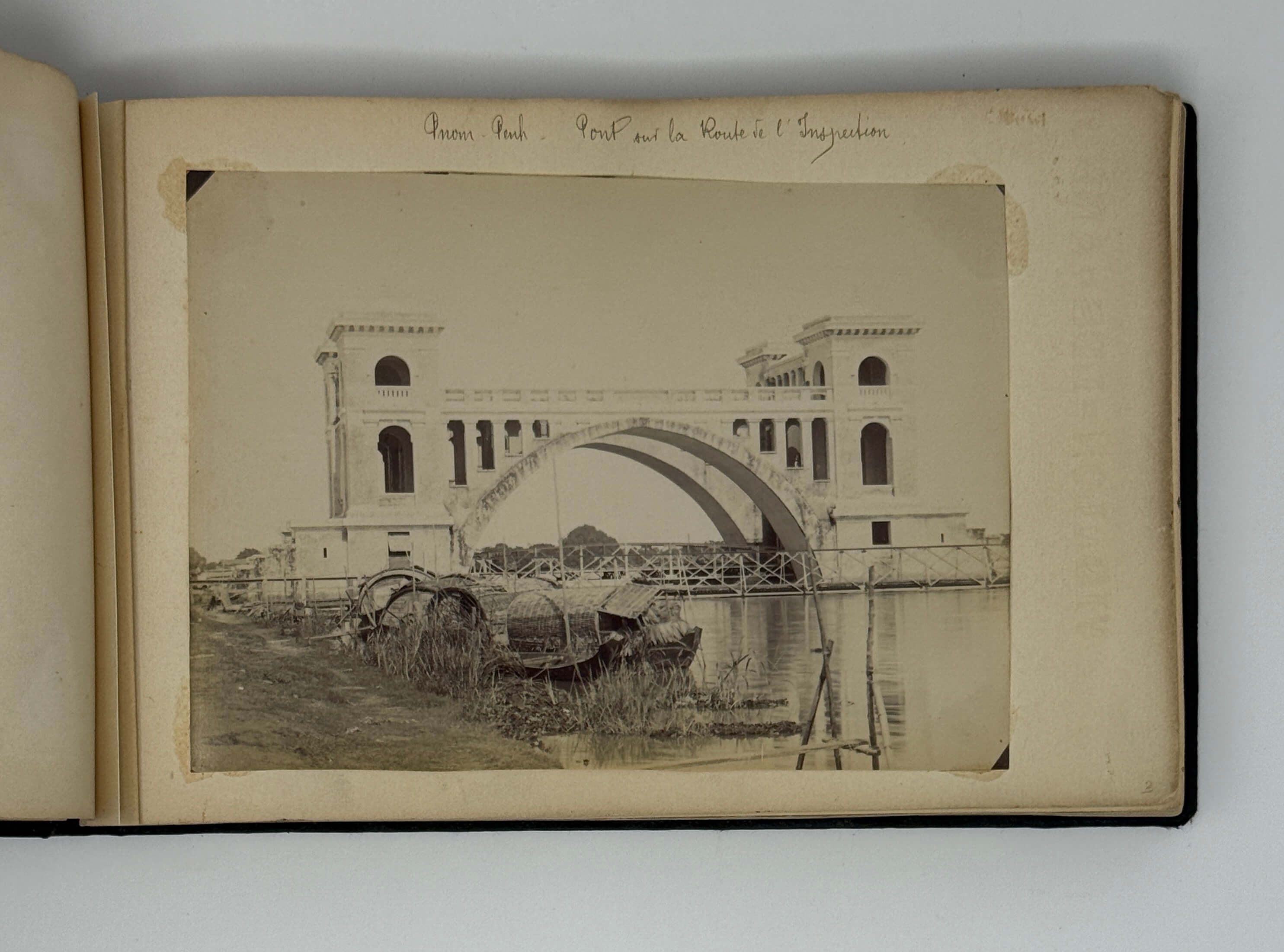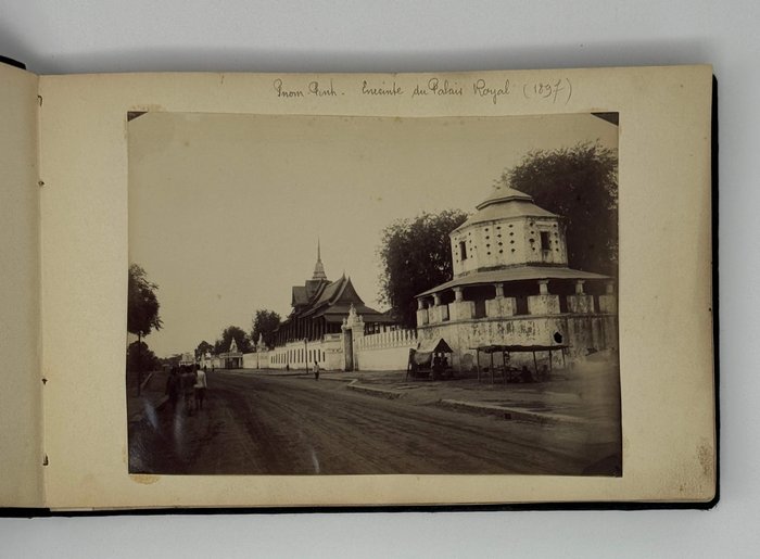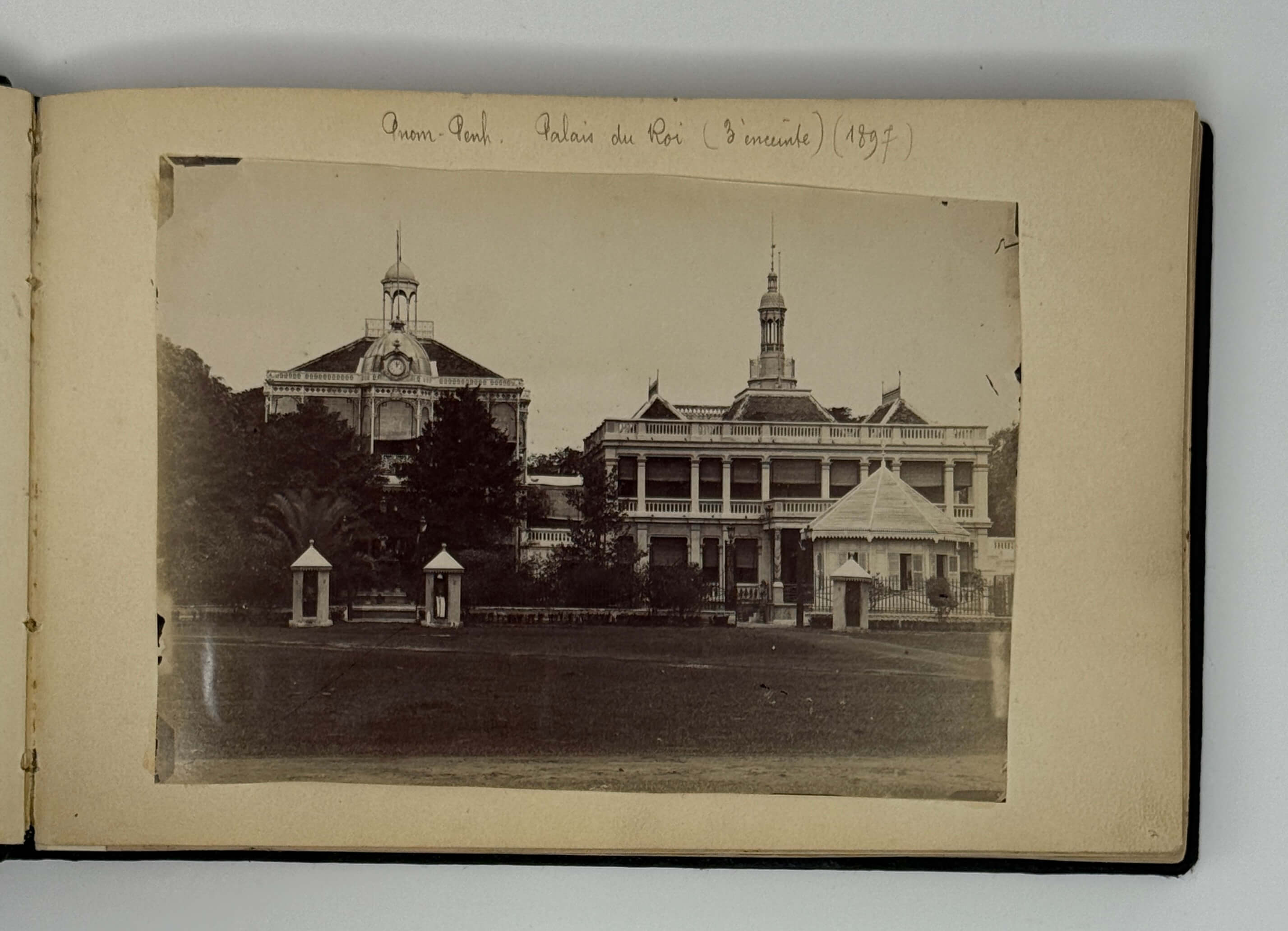Historically significant collection of early original images of Phnom Penh and French colonial Cambodia, with several important photos of the original Royal Palace compound, built during the reign of King Norodom (in 1866-1870) and largely demolished and rebuilt in 1912-1932. The Palace photos include views of the Napoleon Pavilion, King Norodom’s quarters, the Royal Pagoda, Chan Chhaya Pavilion, and a bastion of the outer wall (later removed). An interesting image shows the Palace under construction with wooden scaffolding (the same photo is on Wikipedia). There is also a photo of a procession of “enfants de Norodom” on the Palace grounds. Other images of Phnom Penh show the newly-constructed Pont de Verneville (demolished in the 1930s), the Treasury Bridge decorated with sculptures of Nagas, Wat Phnom Temple, a market near the Palace, and city mansions and pagodas. Two photos show the scenes of the regatta, which took place in Phnom Penh during the 14th of July celebration in 1897. Other images include individual and group portraits of Cambodian musicians, singers, Buddhist monks, workers, prisoners, women and children, &c. Overall an interesting collection of well-preserved early photos of Phnom Penh and French colonial Cambodia in the late 19th century.