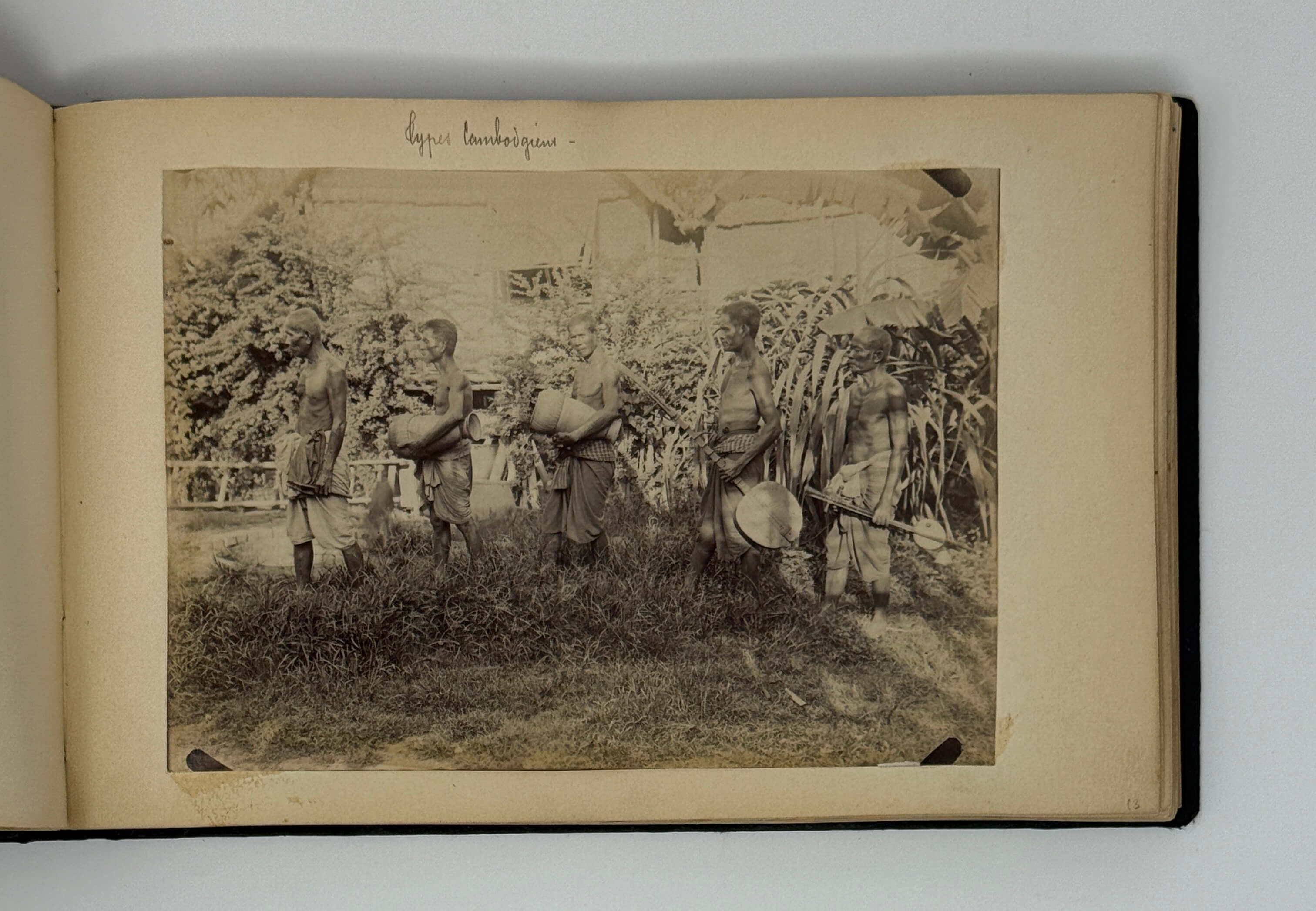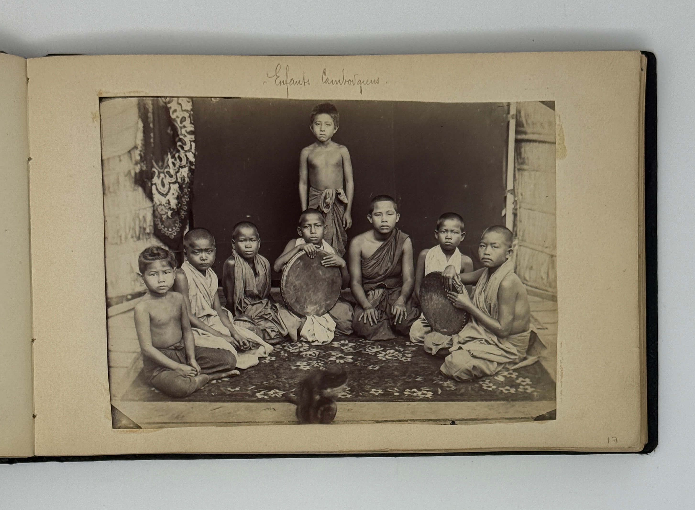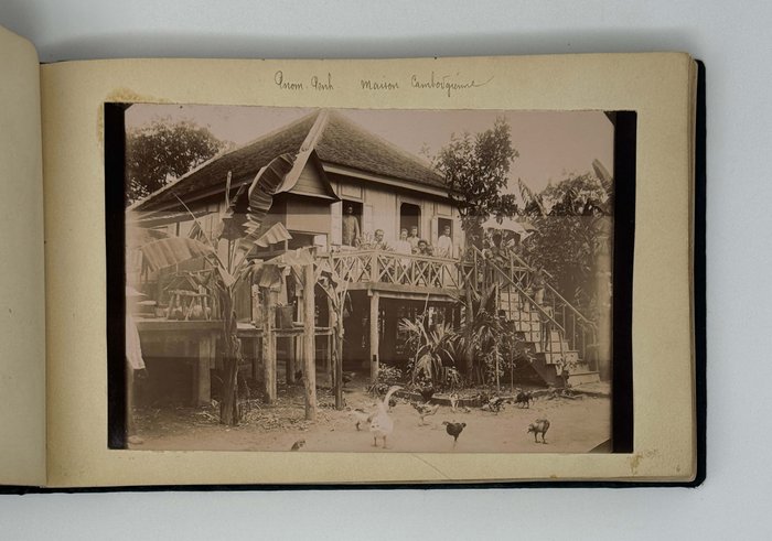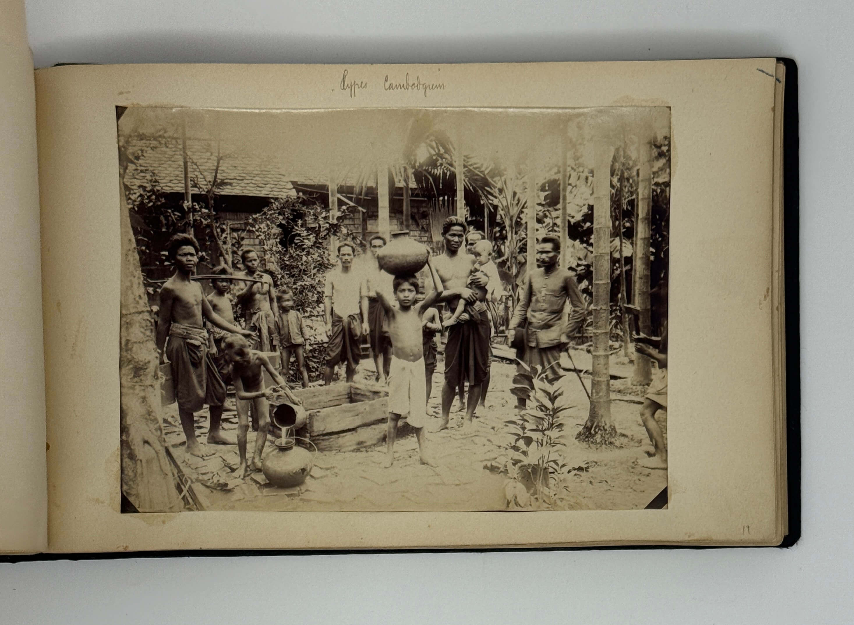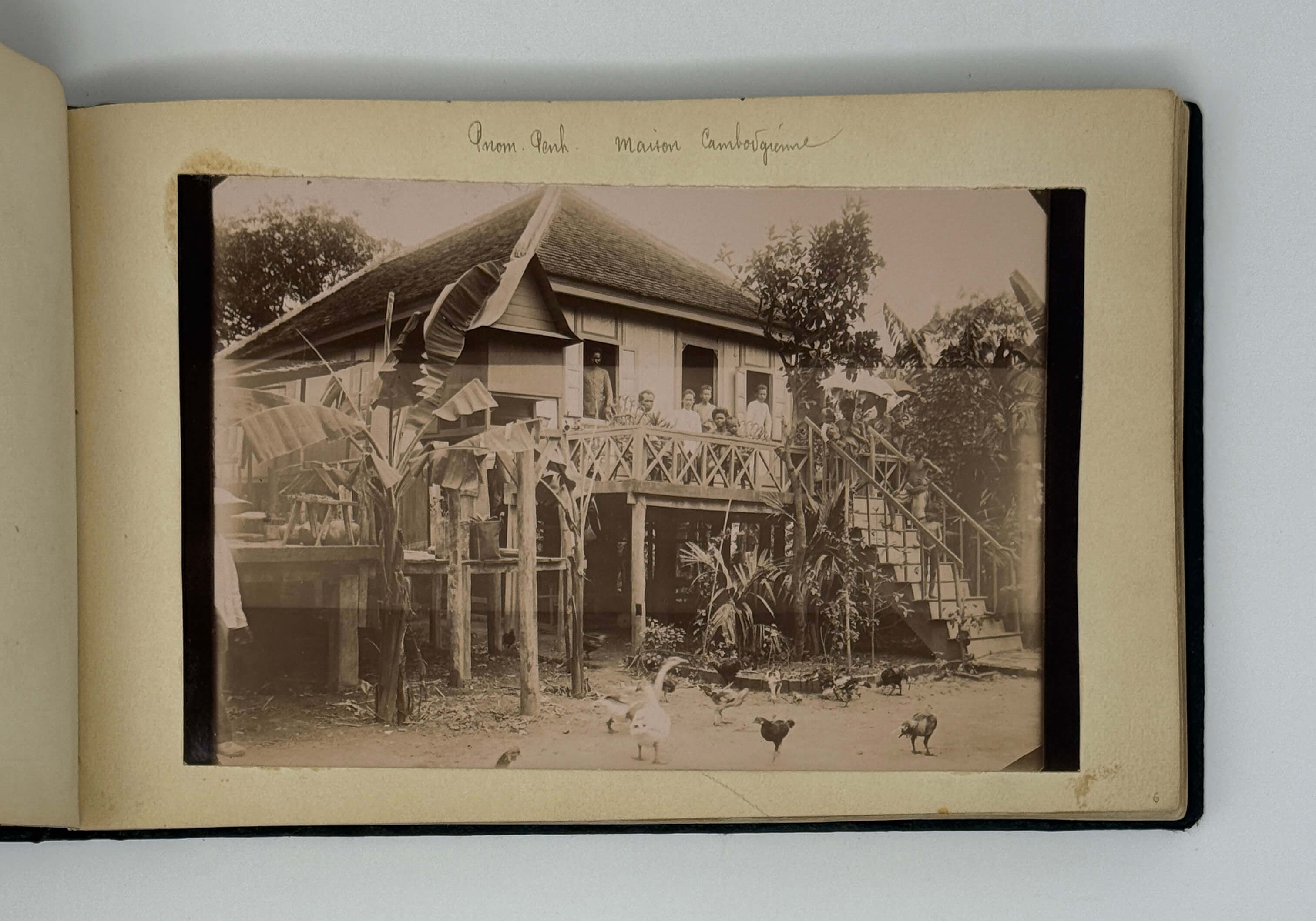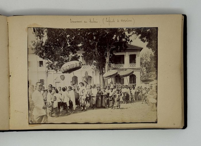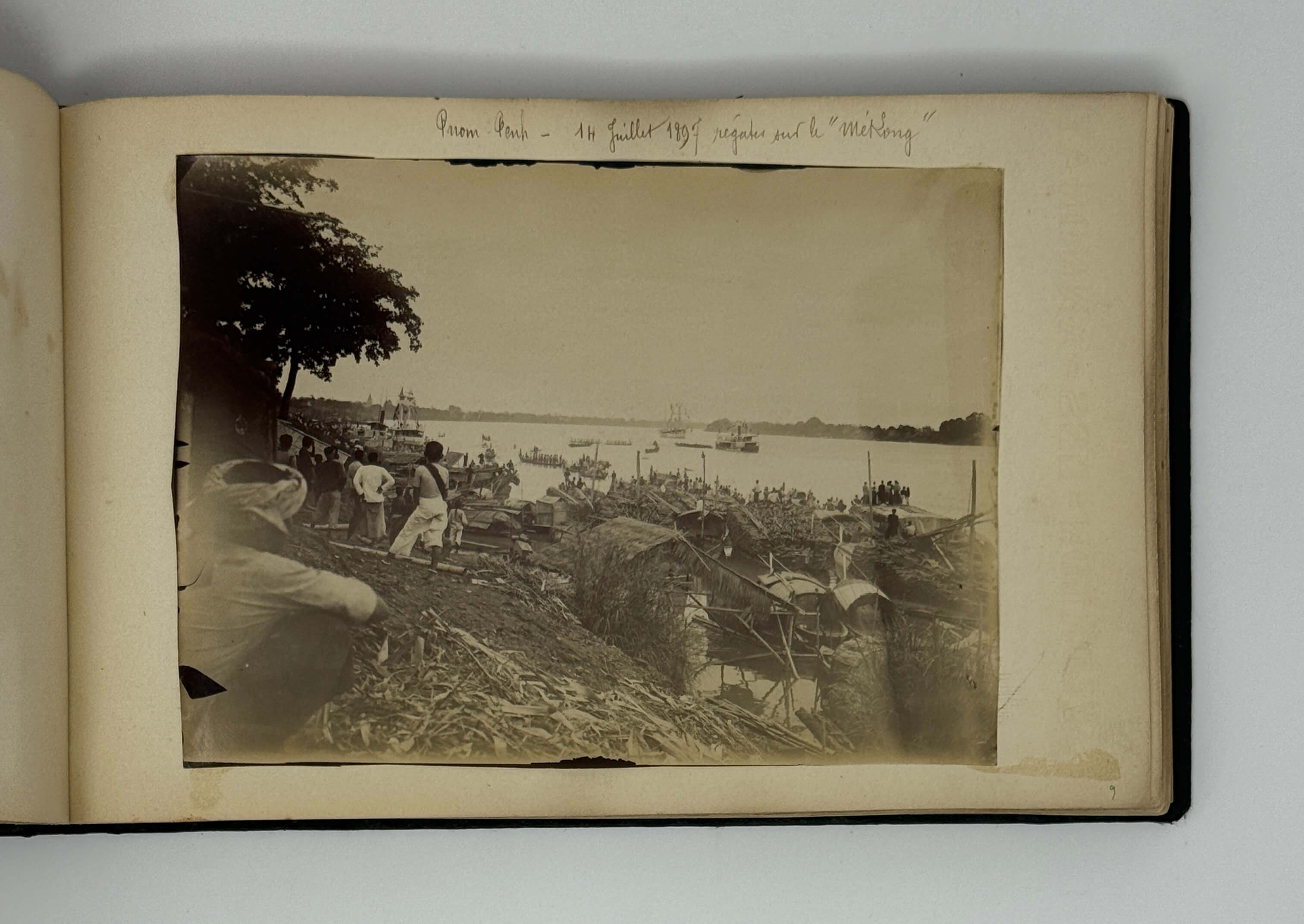 Historically significant collection of early original images of Phnom Penh and French colonial Cambodia, with several important photos of the original Royal Palace compound, built during the reign of King Norodom (in 1866-1870) and largely demolished and rebuilt in 1912-1932. The Palace photos include views of the Napoleon Pavilion, King Norodom’s quarters, the Royal Pagoda, Chan Chhaya Pavilion, and a bastion of the outer wall (later removed). An interesting image shows the Palace under construction with wooden scaffolding (the same photo is on Wikipedia). There is also a photo of a procession of “enfants de Norodom” on the Palace grounds. Other images of Phnom Penh show the newly-constructed Pont de Verneville (demolished in the 1930s), the Treasury Bridge decorated with sculptures of Nagas, Wat Phnom Temple, a market near the Palace, and city mansions and pagodas. Two photos show the scenes of the regatta, which took place in Phnom Penh during the 14th of July celebration in 1897. Other images include individual and group portraits of Cambodian musicians, singers, Buddhist monks, workers, prisoners, women and children, &c. Overall an interesting collection of well-preserved early photos of Phnom Penh and French colonial Cambodia in the late 19th century.