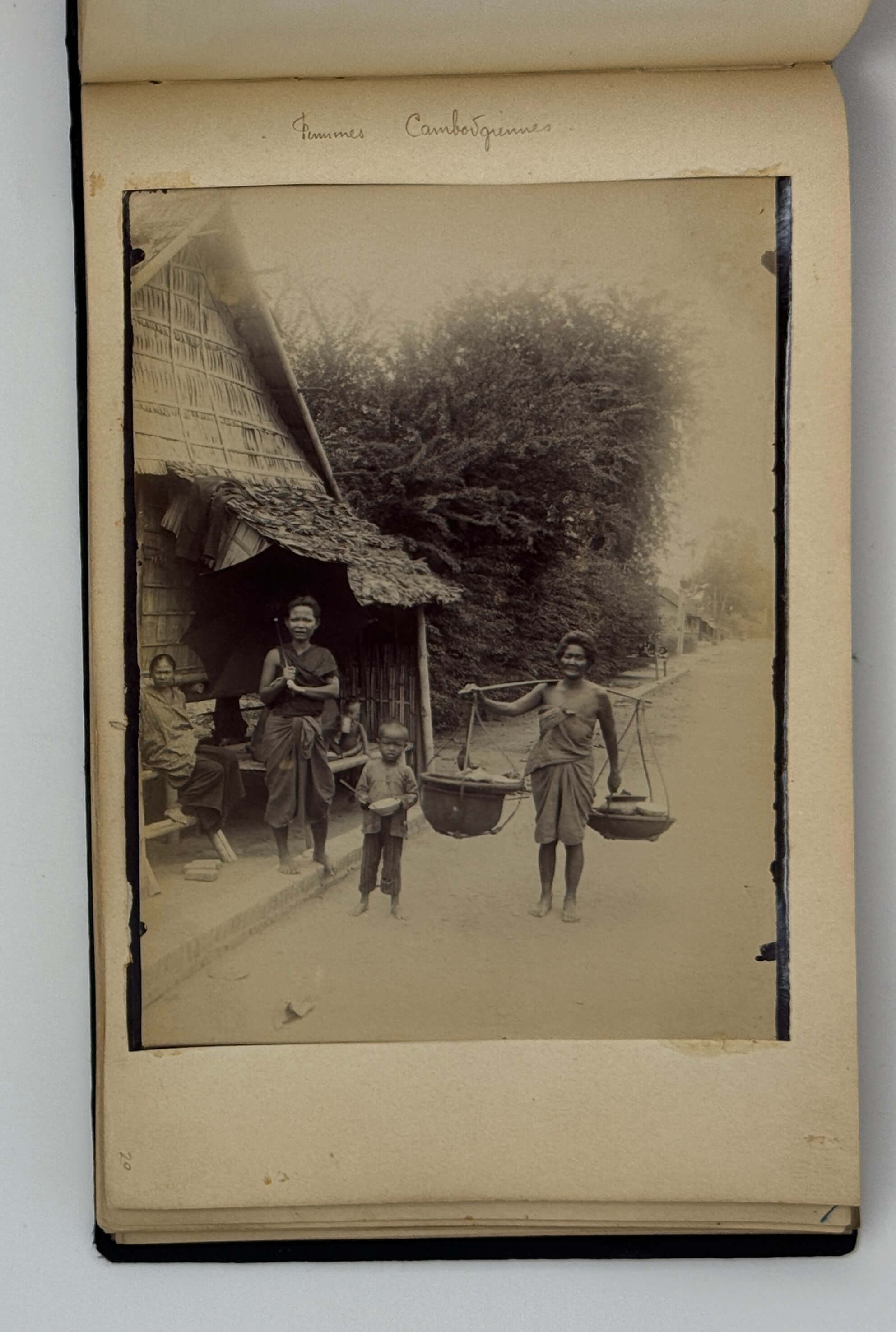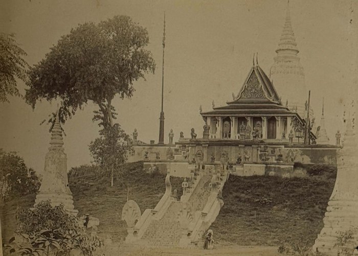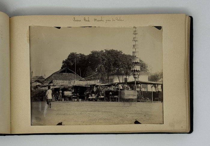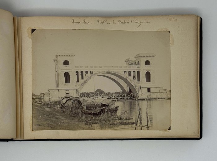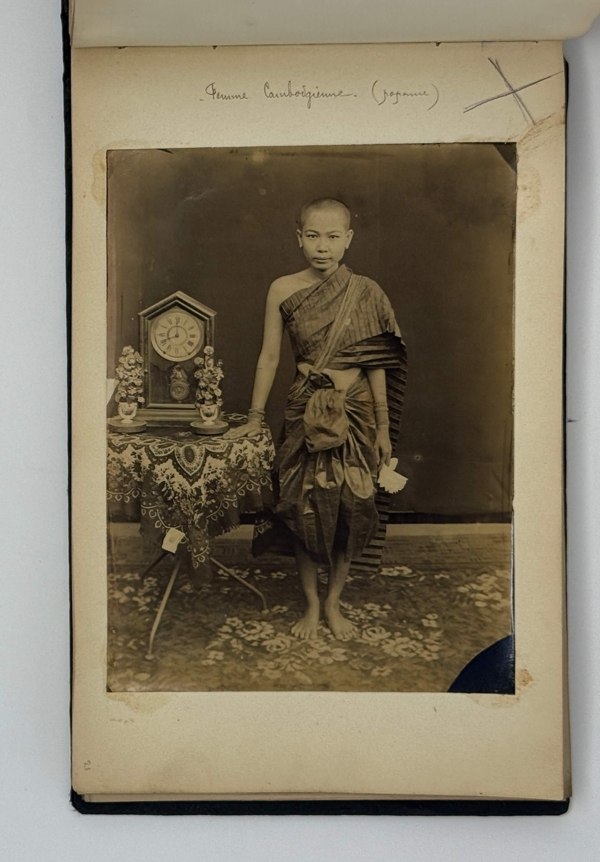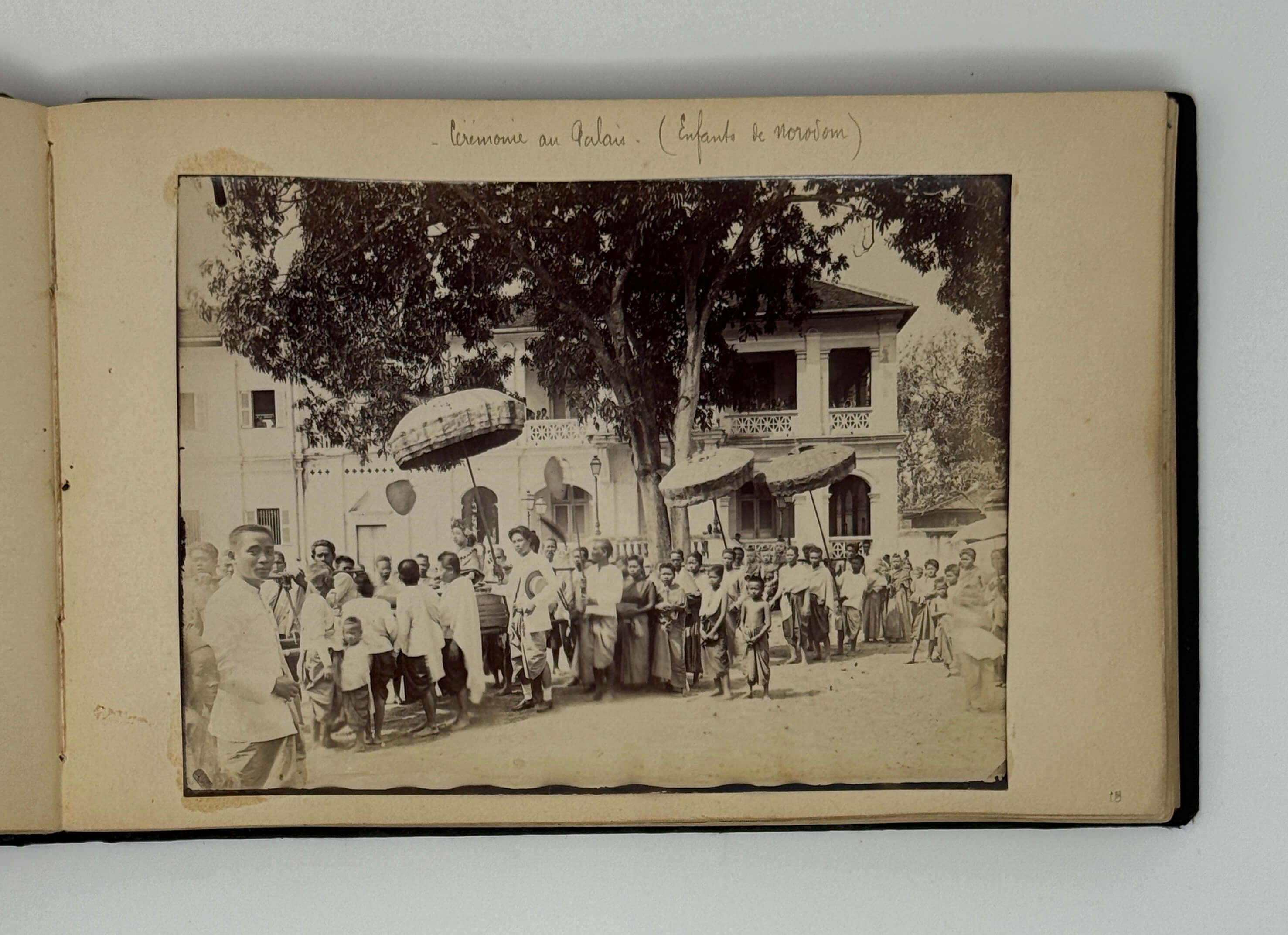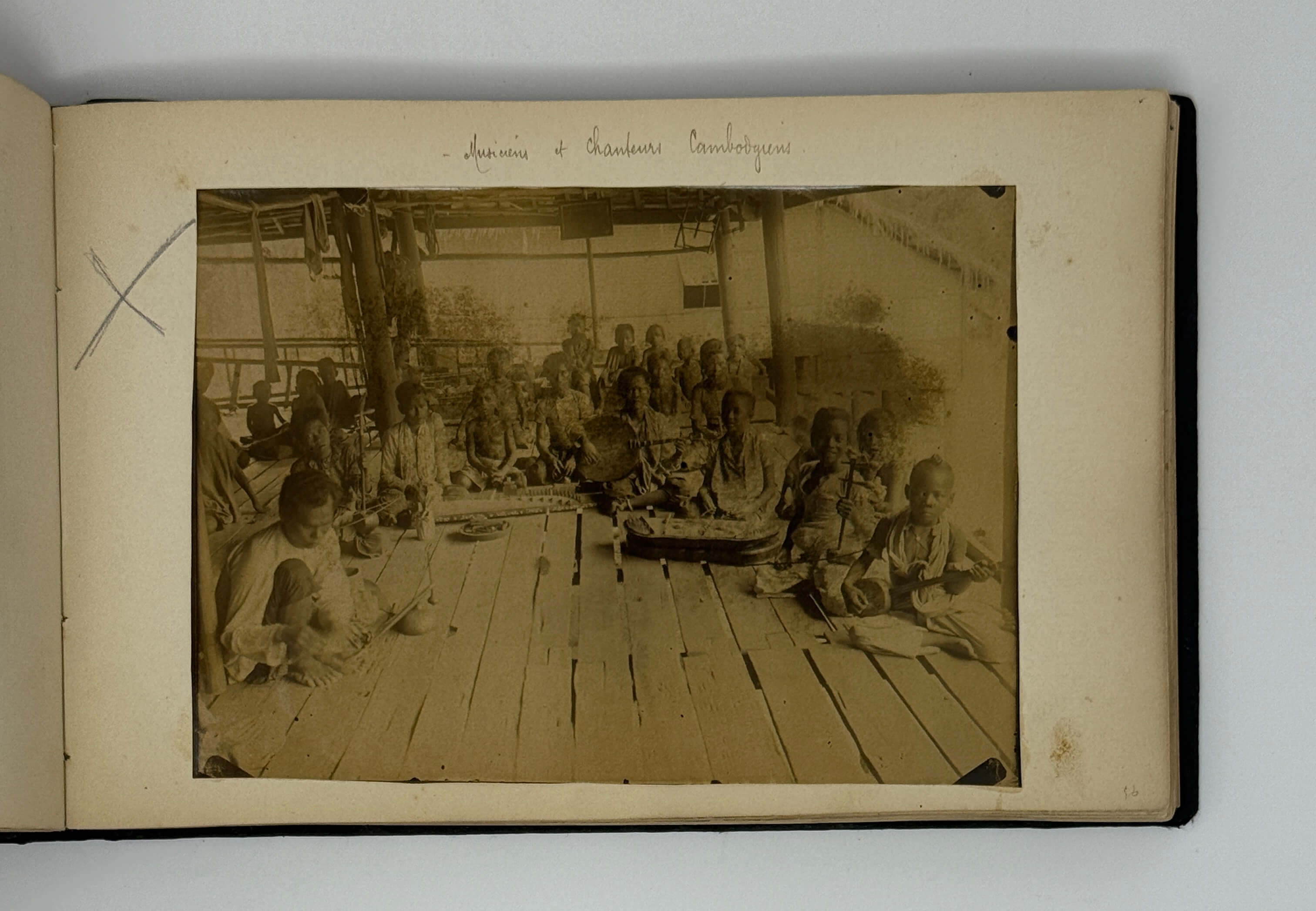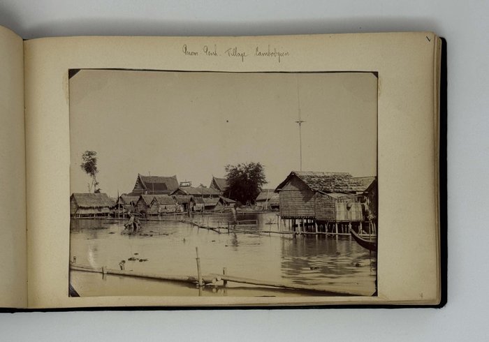 Historically significant collection of early original images of Phnom Penh and French colonial Cambodia, with several important photos of the original Royal Palace compound, built during the reign of King Norodom (in 1866-1870) and largely demolished and rebuilt in 1912-1932. The Palace photos include views of the Napoleon Pavilion, King Norodom’s quarters, the Royal Pagoda, Chan Chhaya Pavilion, and a bastion of the outer wall (later removed). An interesting image shows the Palace under construction with wooden scaffolding (the same photo is on Wikipedia). There is also a photo of a procession of “enfants de Norodom” on the Palace grounds. Other images of Phnom Penh show the newly-constructed Pont de Verneville (demolished in the 1930s), the Treasury Bridge decorated with sculptures of Nagas, Wat Phnom Temple, a market near the Palace, and city mansions and pagodas. Two photos show the scenes of the regatta, which took place in Phnom Penh during the 14th of July celebration in 1897. Other images include individual and group portraits of Cambodian musicians, singers, Buddhist monks, workers, prisoners, women and children, &c. Overall an interesting collection of well-preserved early photos of Phnom Penh and French colonial Cambodia in the late 19th century.