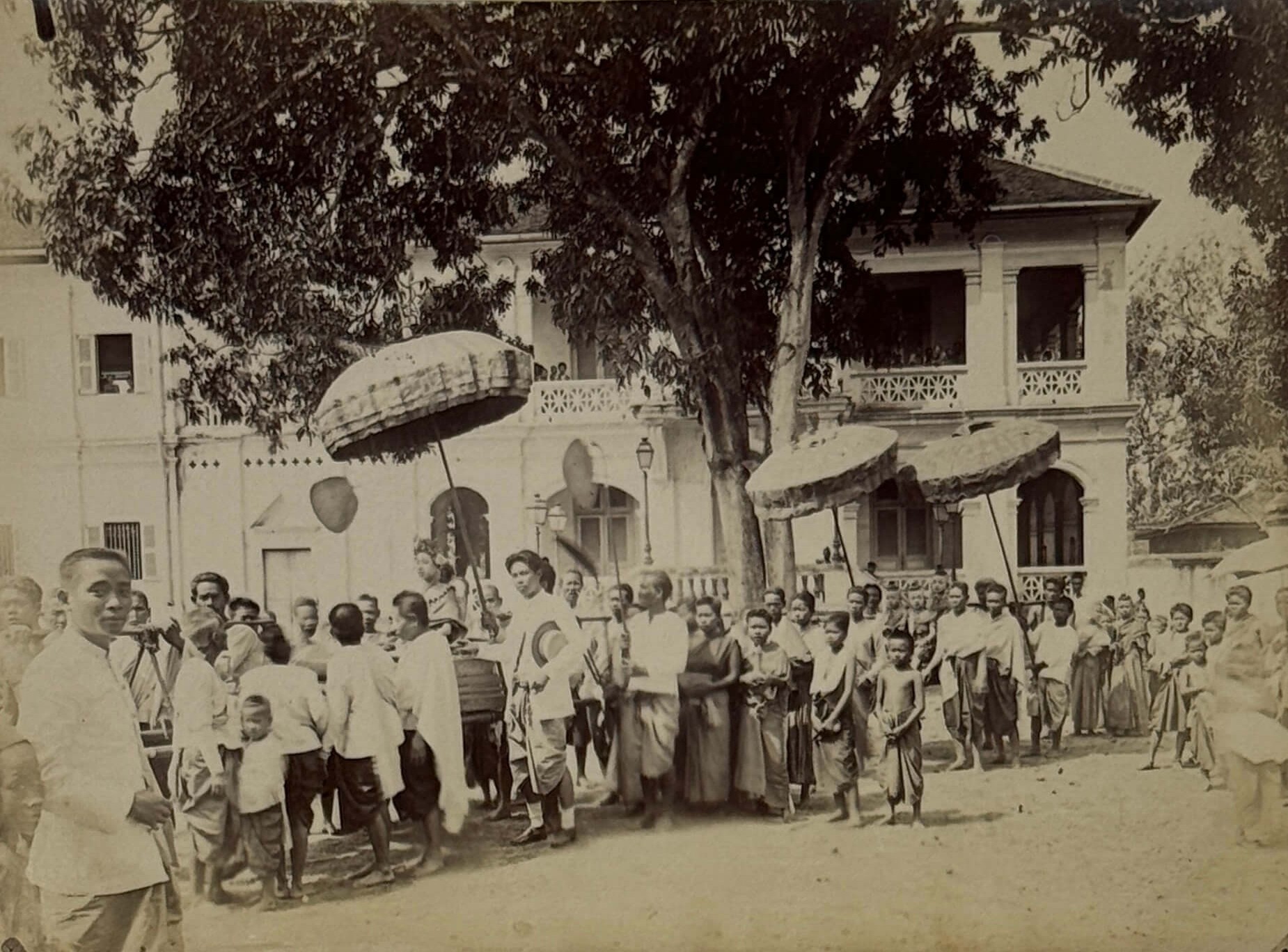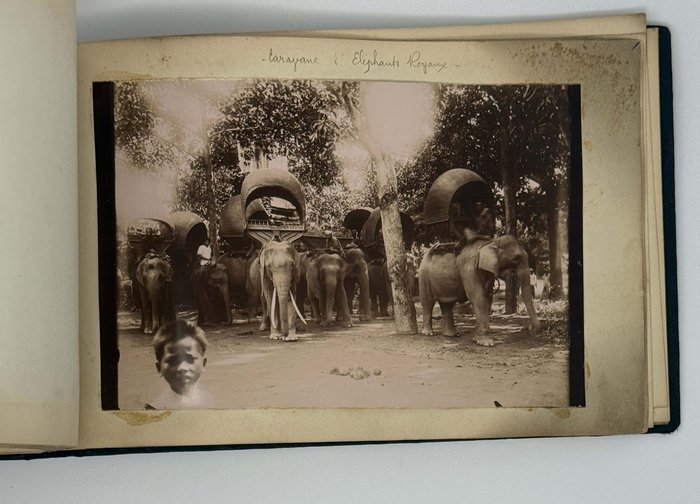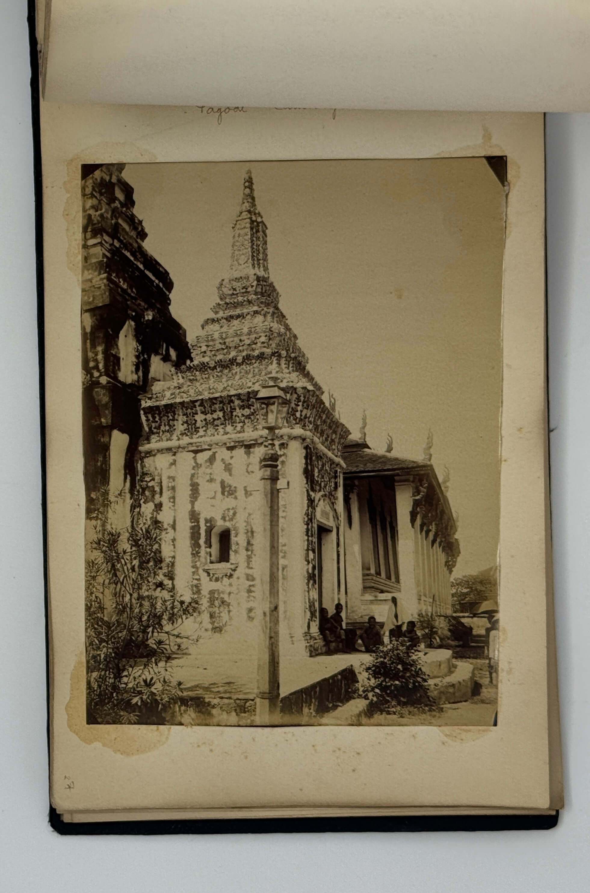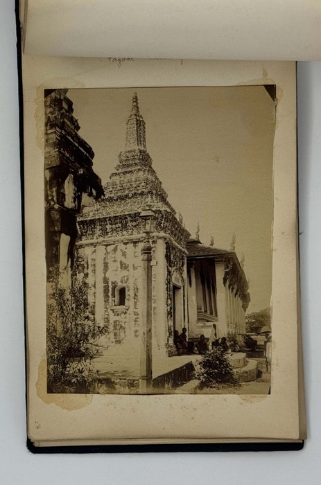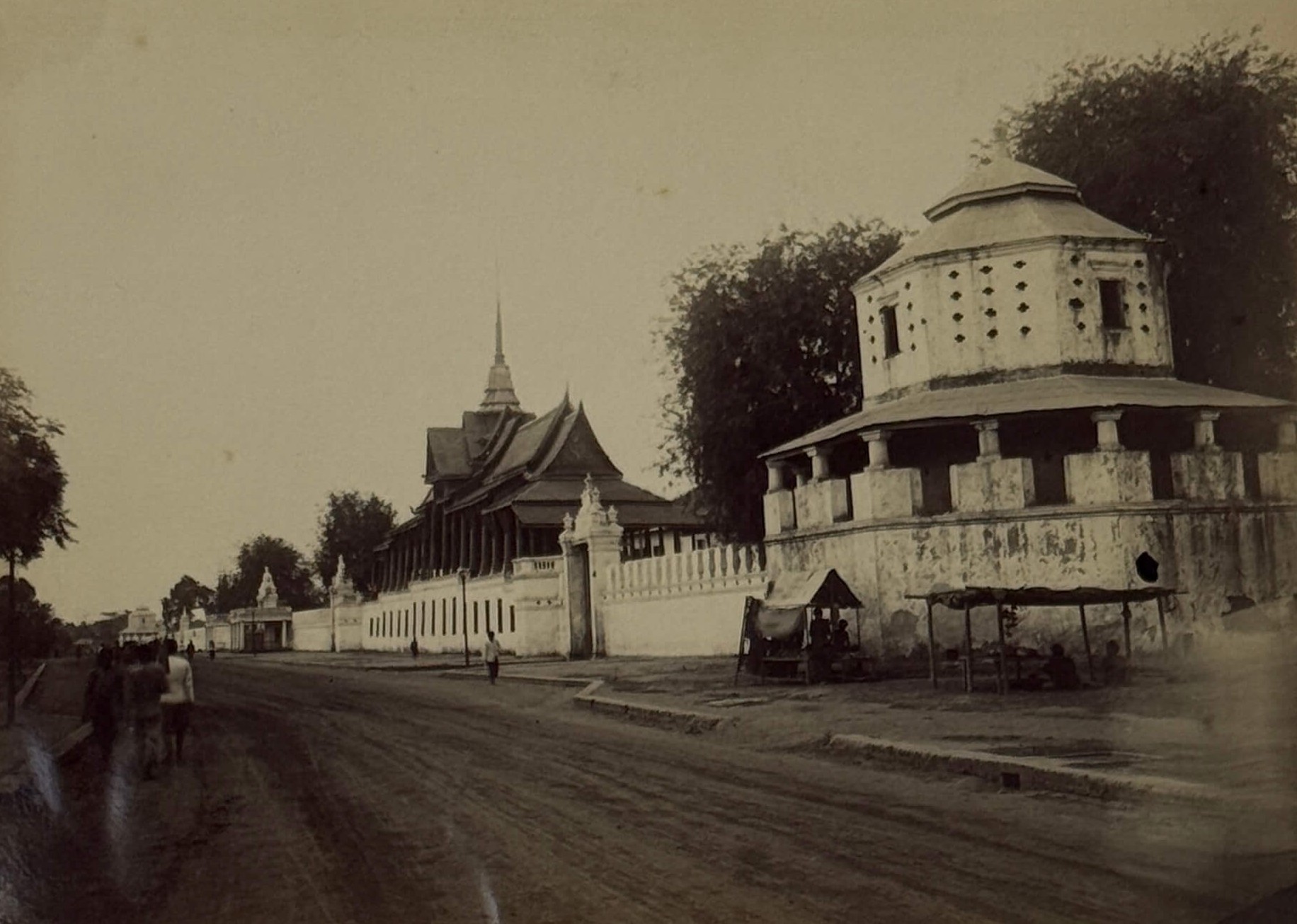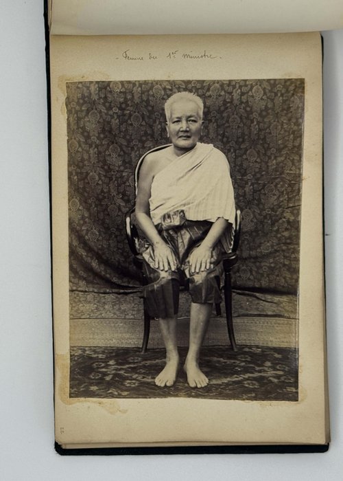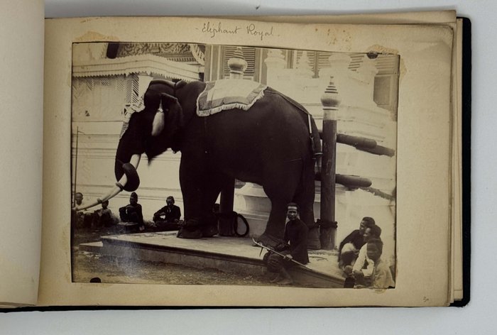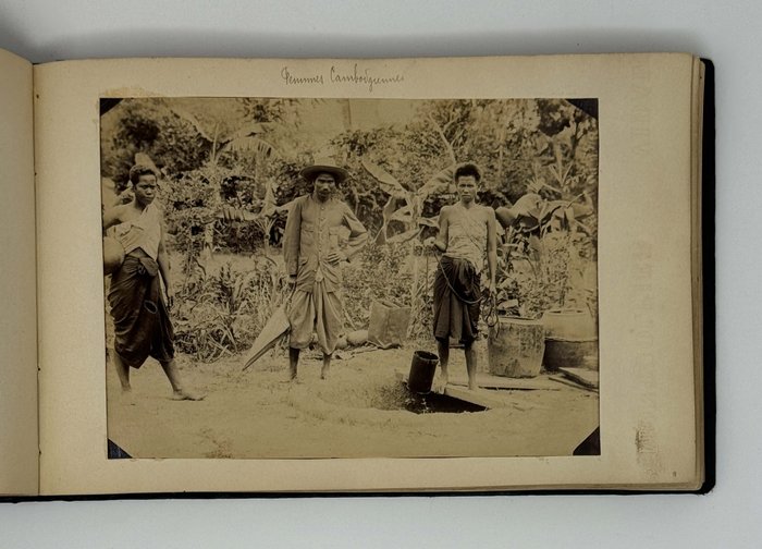 Historically significant collection of early original images of Phnom Penh and French colonial Cambodia, with several important photos of the original Royal Palace compound, built during the reign of King Norodom (in 1866-1870) and largely demolished and rebuilt in 1912-1932. The Palace photos include views of the Napoleon Pavilion, King Norodom’s quarters, the Royal Pagoda, Chan Chhaya Pavilion, and a bastion of the outer wall (later removed). An interesting image shows the Palace under construction with wooden scaffolding (the same photo is on Wikipedia). There is also a photo of a procession of “enfants de Norodom” on the Palace grounds. Other images of Phnom Penh show the newly-constructed Pont de Verneville (demolished in the 1930s), the Treasury Bridge decorated with sculptures of Nagas, Wat Phnom Temple, a market near the Palace, and city mansions and pagodas. Two photos show the scenes of the regatta, which took place in Phnom Penh during the 14th of July celebration in 1897. Other images include individual and group portraits of Cambodian musicians, singers, Buddhist monks, workers, prisoners, women and children, &c. Overall an interesting collection of well-preserved early photos of Phnom Penh and French colonial Cambodia in the late 19th century.