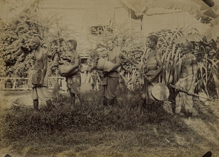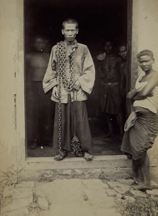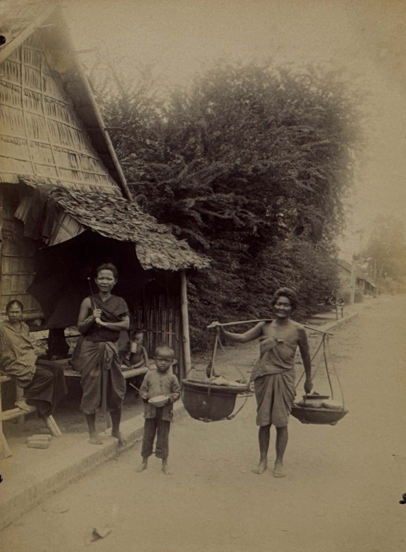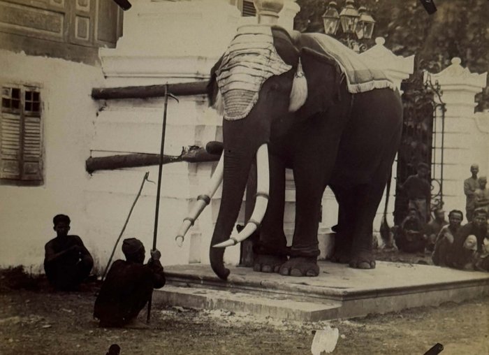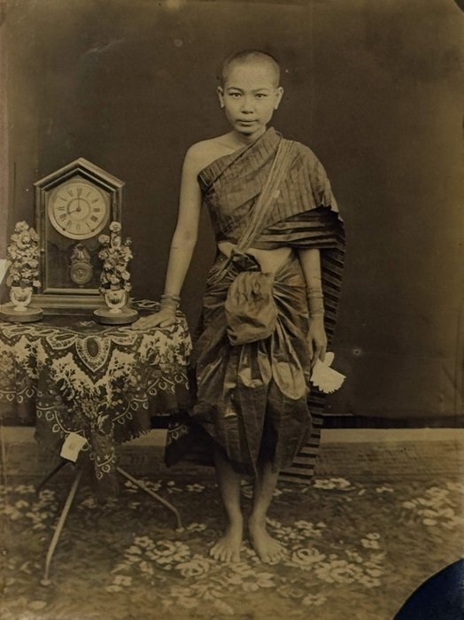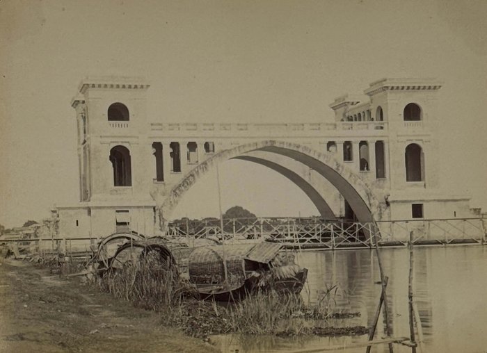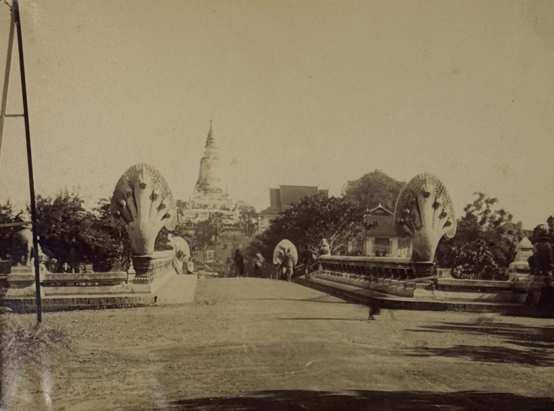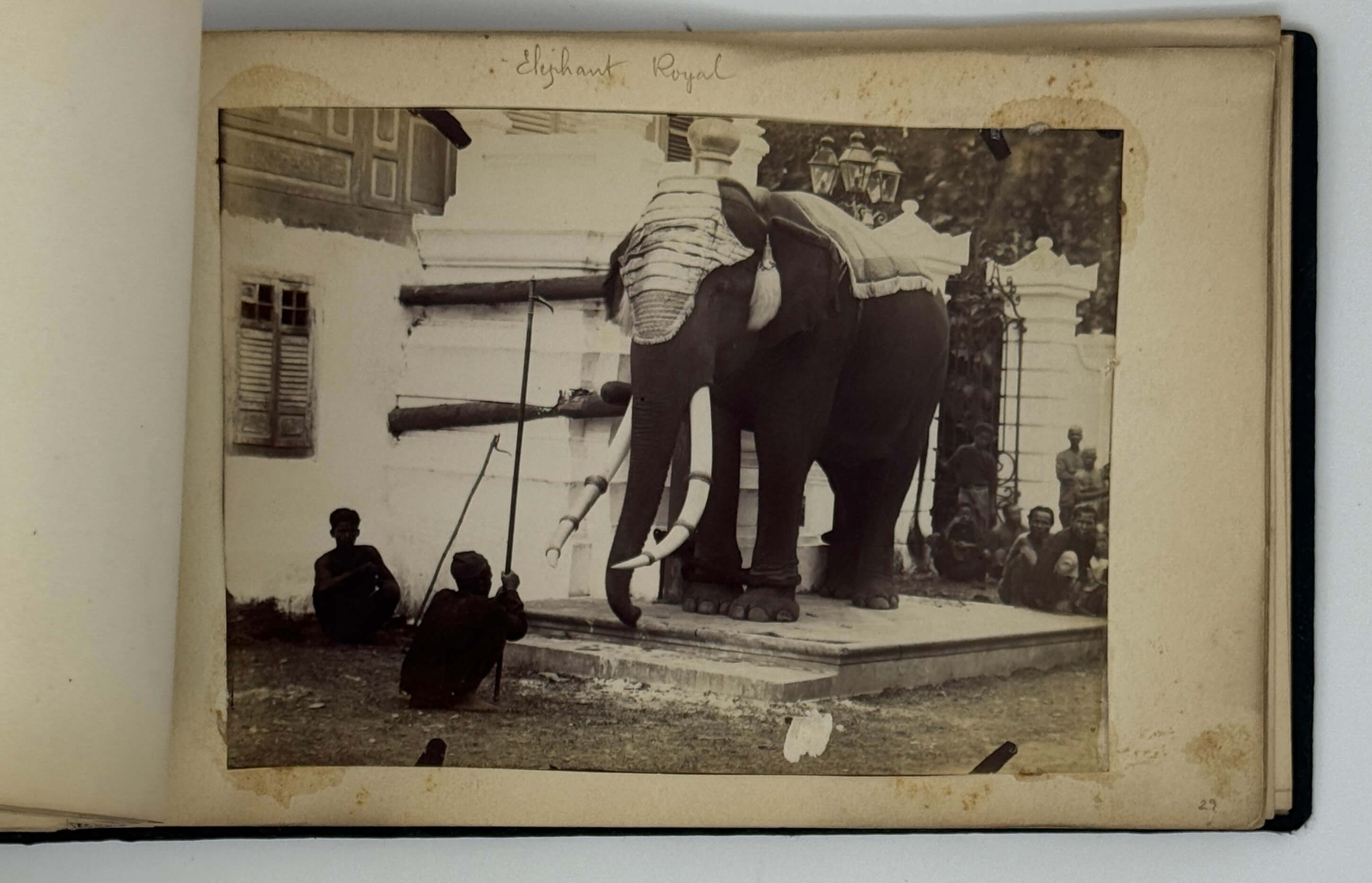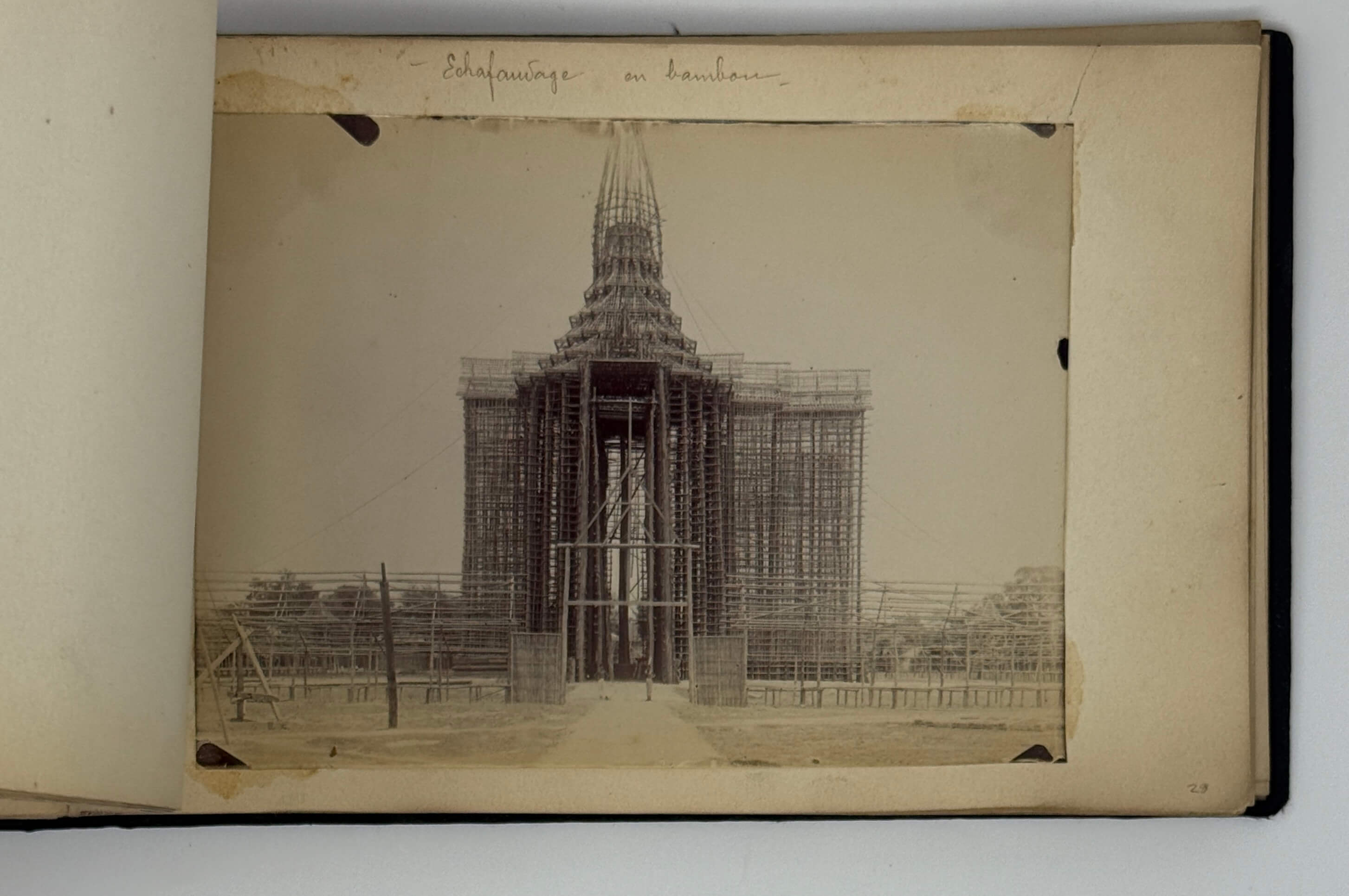 Historically significant collection of early original images of Phnom Penh and French colonial Cambodia, with several important photos of the original Royal Palace compound, built during the reign of King Norodom (in 1866-1870) and largely demolished and rebuilt in 1912-1932. The Palace photos include views of the Napoleon Pavilion, King Norodom’s quarters, the Royal Pagoda, Chan Chhaya Pavilion, and a bastion of the outer wall (later removed). An interesting image shows the Palace under construction with wooden scaffolding (the same photo is on Wikipedia). There is also a photo of a procession of “enfants de Norodom” on the Palace grounds. Other images of Phnom Penh show the newly-constructed Pont de Verneville (demolished in the 1930s), the Treasury Bridge decorated with sculptures of Nagas, Wat Phnom Temple, a market near the Palace, and city mansions and pagodas. Two photos show the scenes of the regatta, which took place in Phnom Penh during the 14th of July celebration in 1897. Other images include individual and group portraits of Cambodian musicians, singers, Buddhist monks, workers, prisoners, women and children, &c. Overall an interesting collection of well-preserved early photos of Phnom Penh and French colonial Cambodia in the late 19th century.