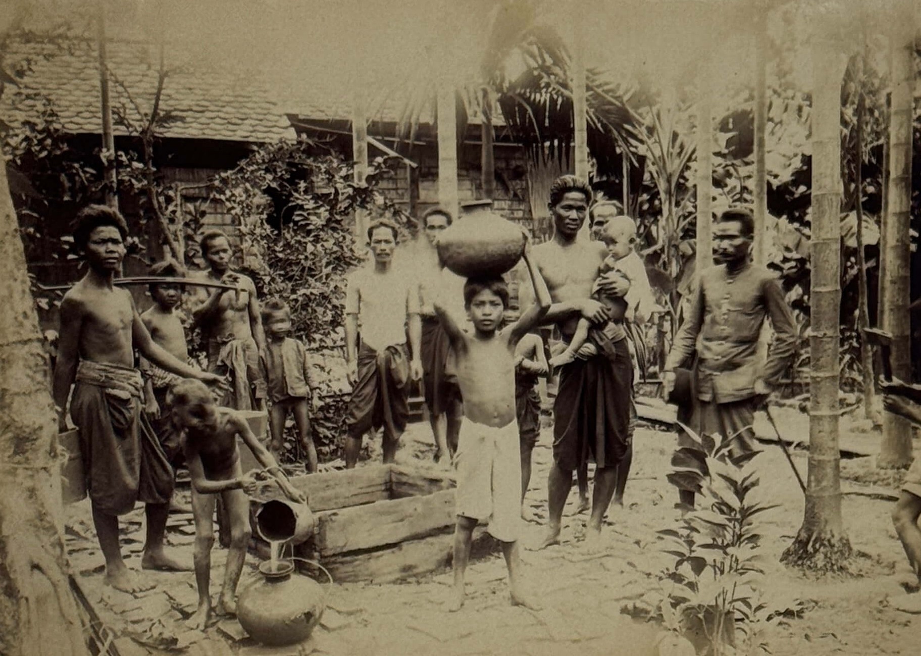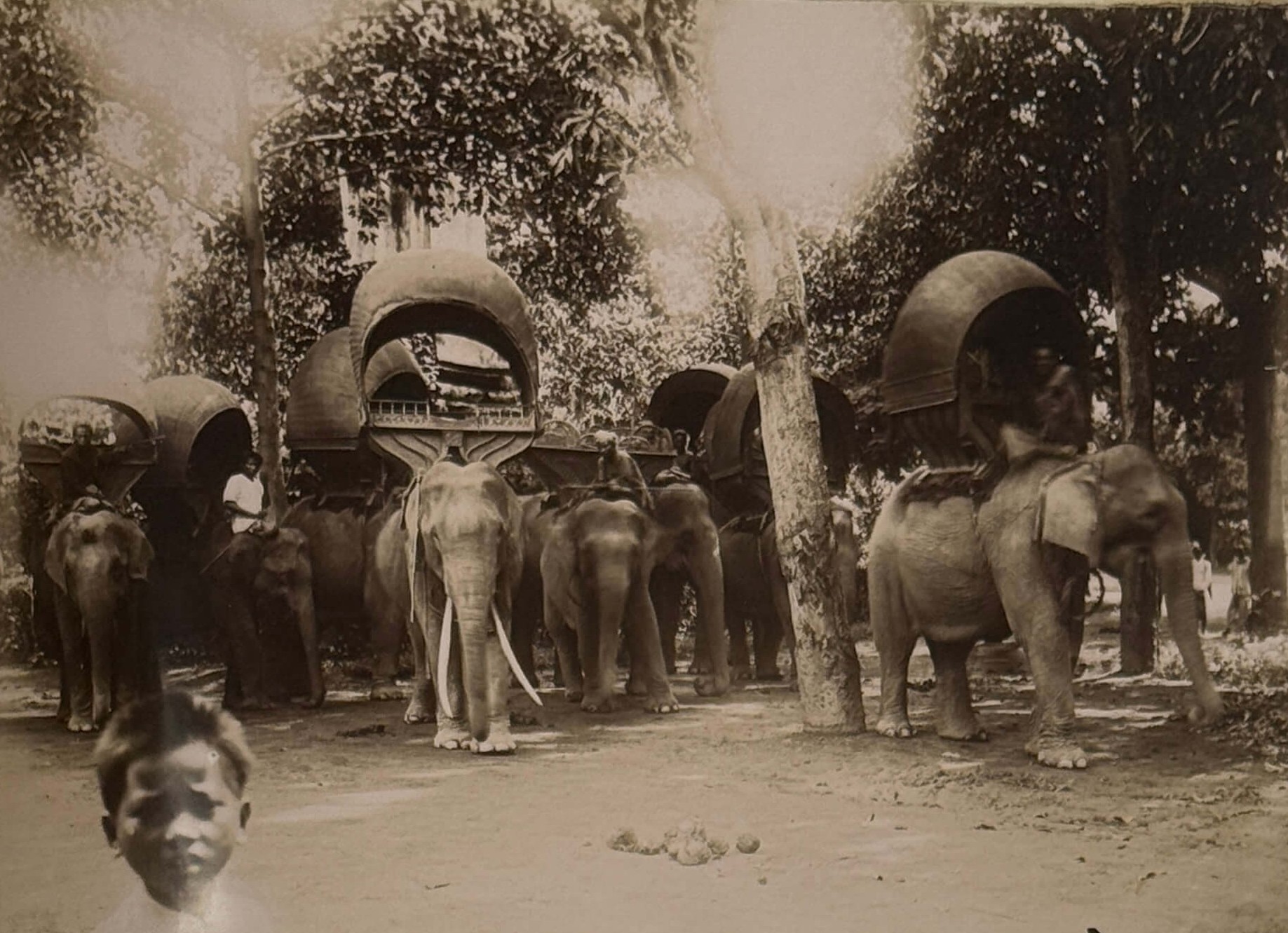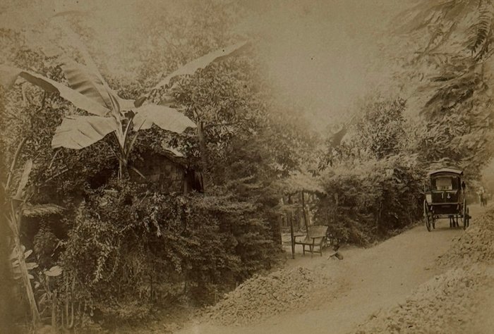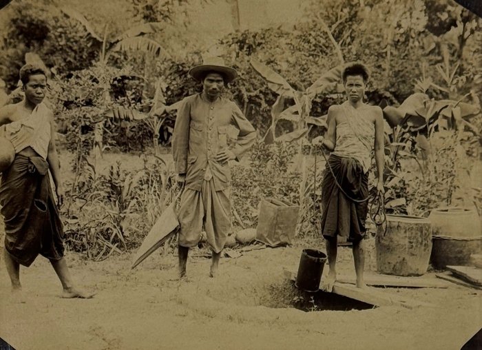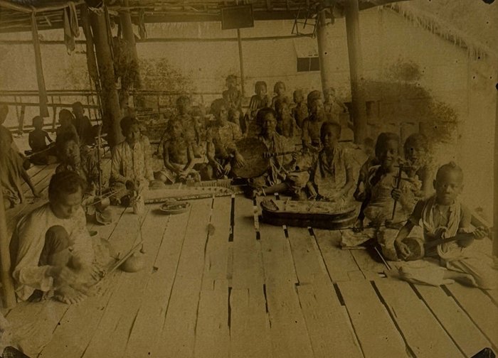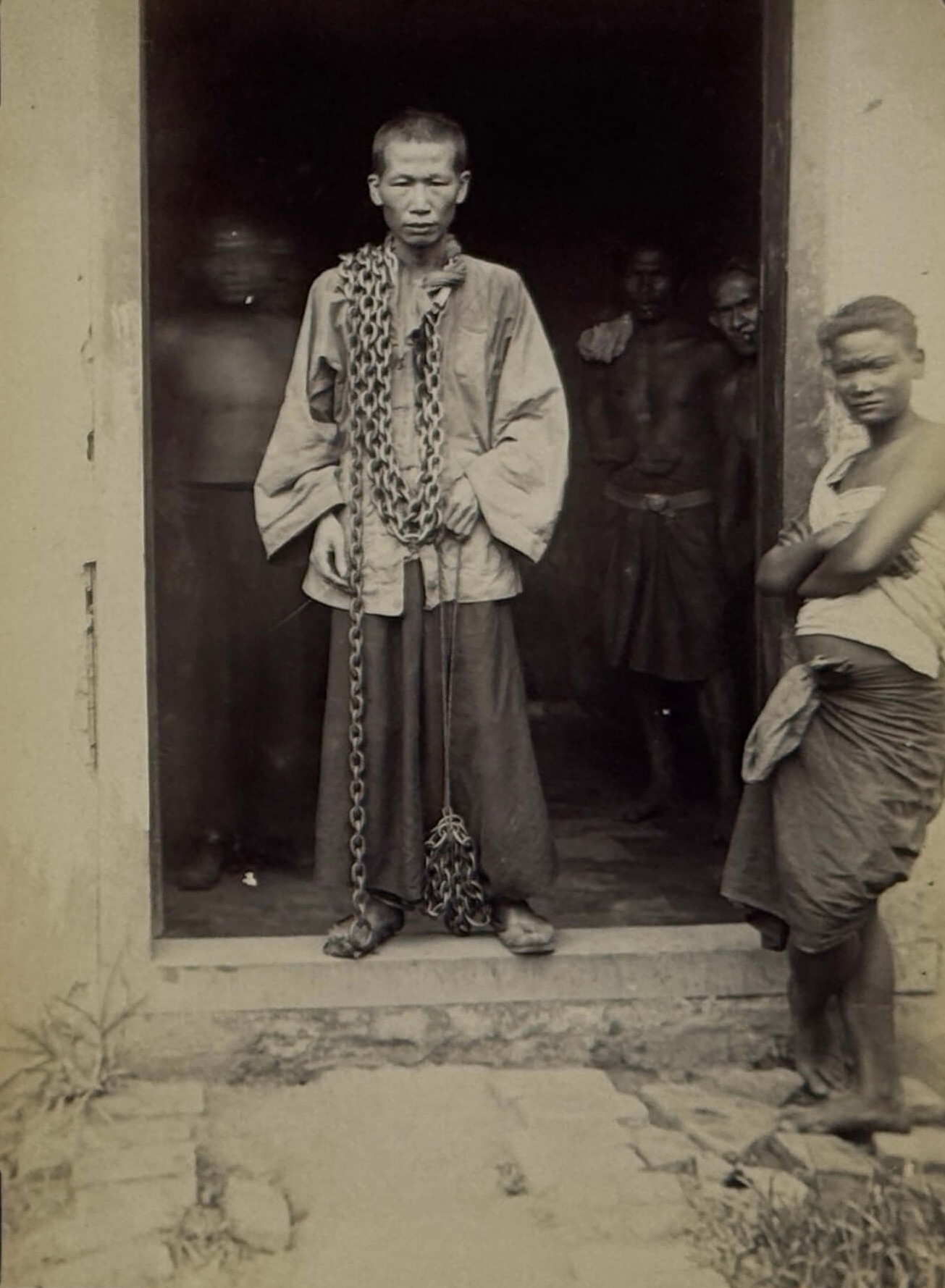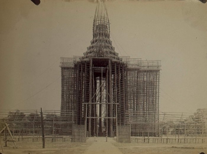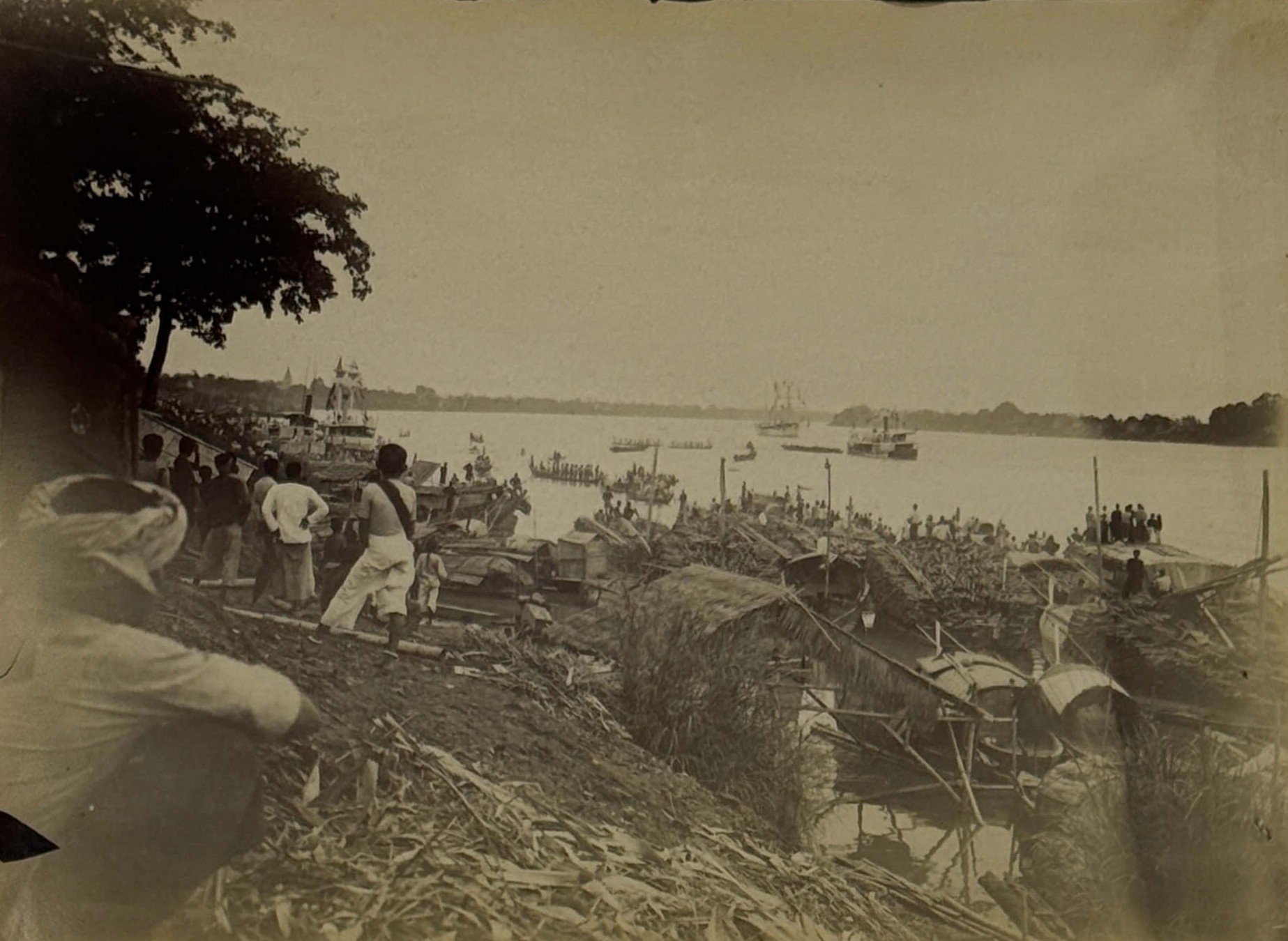 Historically significant collection of early original images of Phnom Penh and French colonial Cambodia, with several important photos of the original Royal Palace compound, built during the reign of King Norodom (in 1866-1870) and largely demolished and rebuilt in 1912-1932. The Palace photos include views of the Napoleon Pavilion, King Norodom’s quarters, the Royal Pagoda, Chan Chhaya Pavilion, and a bastion of the outer wall (later removed). An interesting image shows the Palace under construction with wooden scaffolding (the same photo is on Wikipedia). There is also a photo of a procession of “enfants de Norodom” on the Palace grounds. Other images of Phnom Penh show the newly-constructed Pont de Verneville (demolished in the 1930s), the Treasury Bridge decorated with sculptures of Nagas, Wat Phnom Temple, a market near the Palace, and city mansions and pagodas. Two photos show the scenes of the regatta, which took place in Phnom Penh during the 14th of July celebration in 1897. Other images include individual and group portraits of Cambodian musicians, singers, Buddhist monks, workers, prisoners, women and children, &c. Overall an interesting collection of well-preserved early photos of Phnom Penh and French colonial Cambodia in the late 19th century.