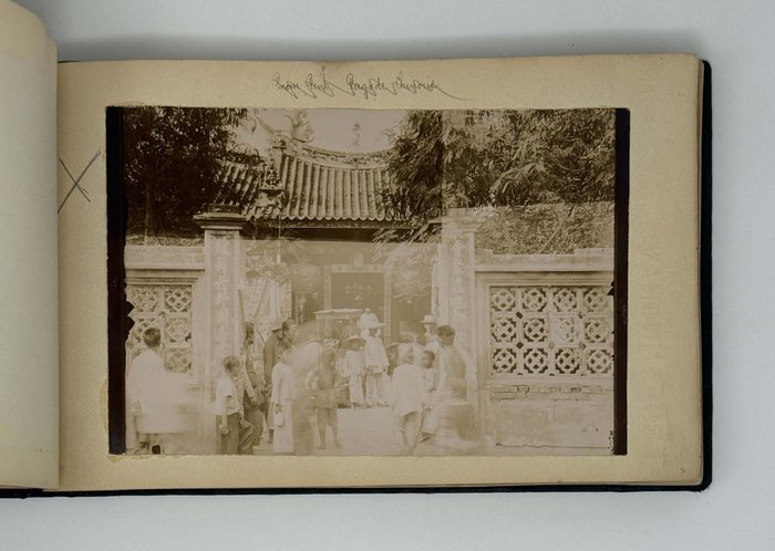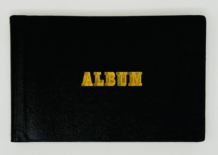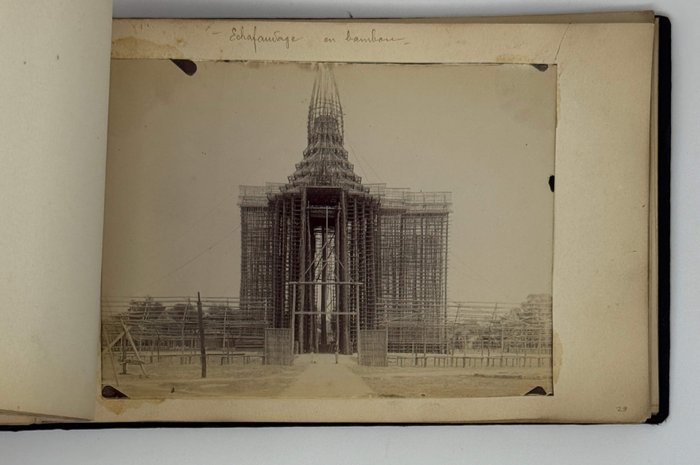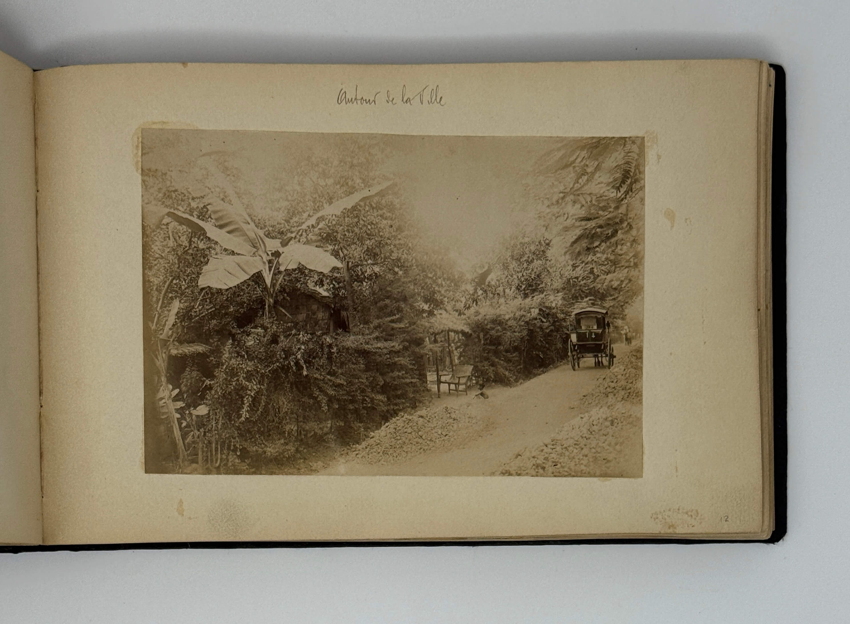 Oblong Quarto album (ca. 24,5 x 15,7 cm or 9 ¾x 6¼ in). 34 paper leaves. With 34 mounted and one loosely inserted original gelatin silver photos, all ca. 13 x 17,5 cm (5 x 7 in). All but one mounted photos with period ink captions in French on the mounts; manuscript ink title, date and the owner’s name on the first leaf. Period black quarter morocco album with black pebbled papered boards; gilt-lettered title “Album” on the front board. Binding rubbed and with minor tears or losses on extremities, rear board with some losses of the paper, spine restored on hinges, a few photos mildly faded, but overall a very good album of interesting photos.