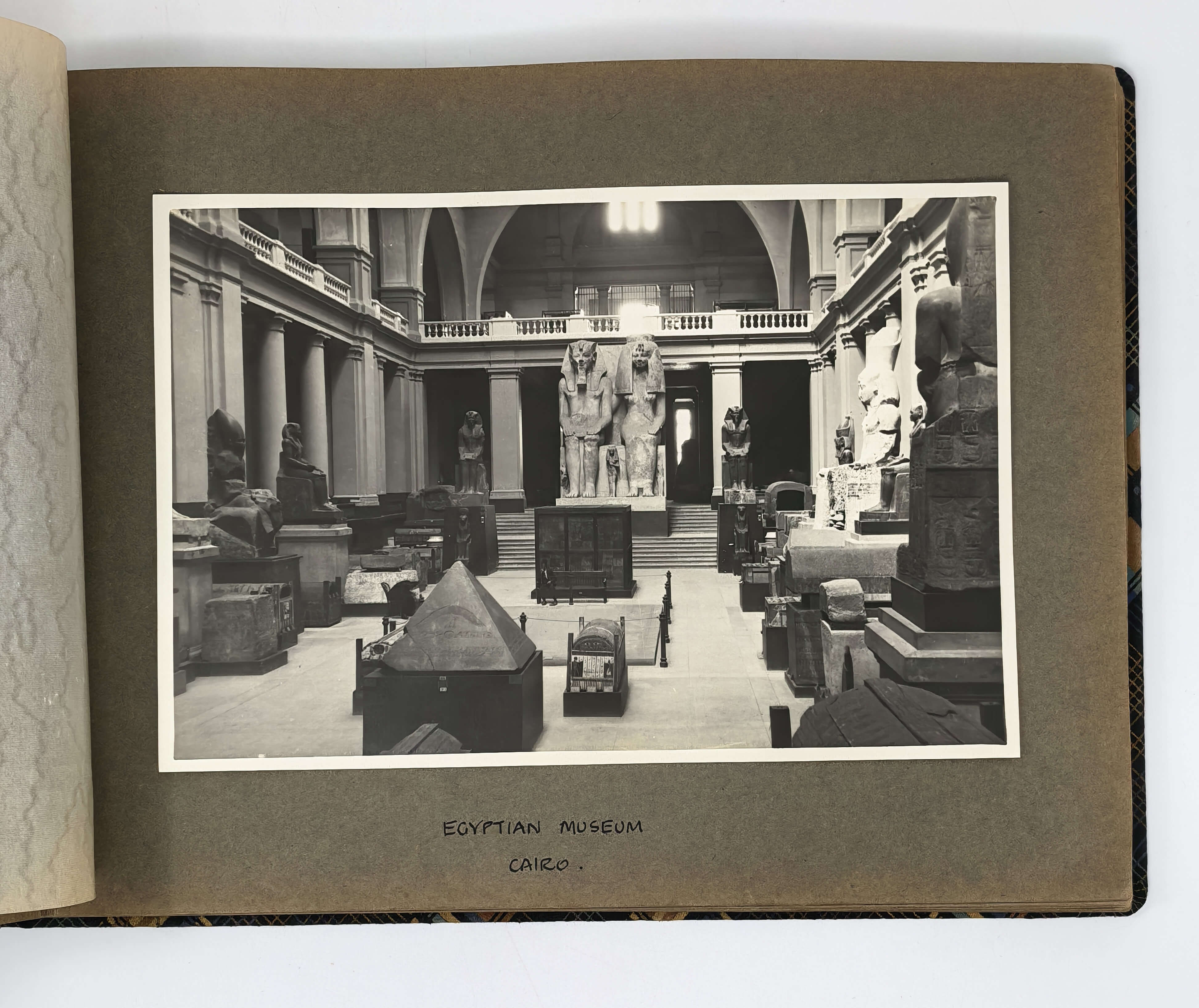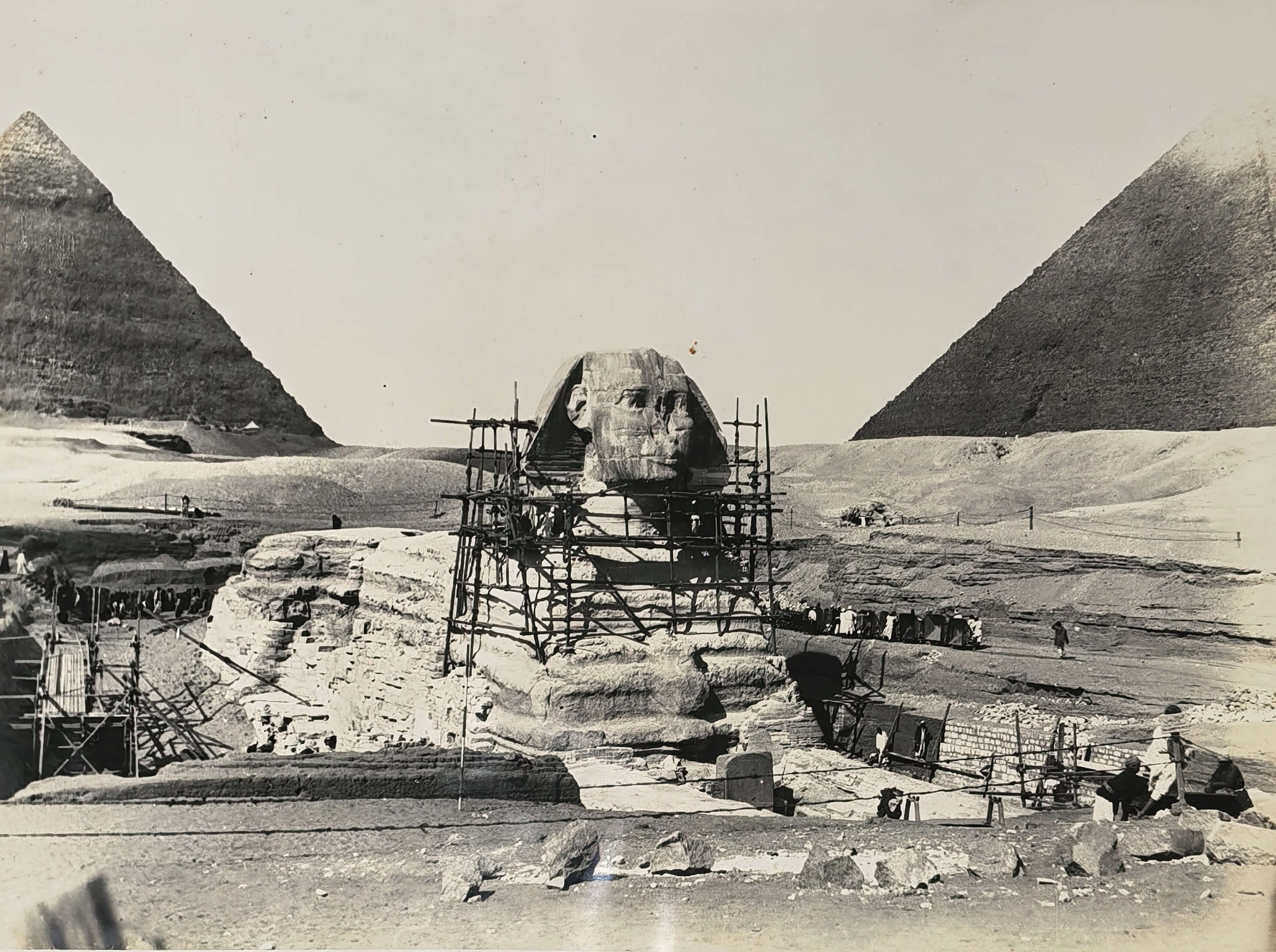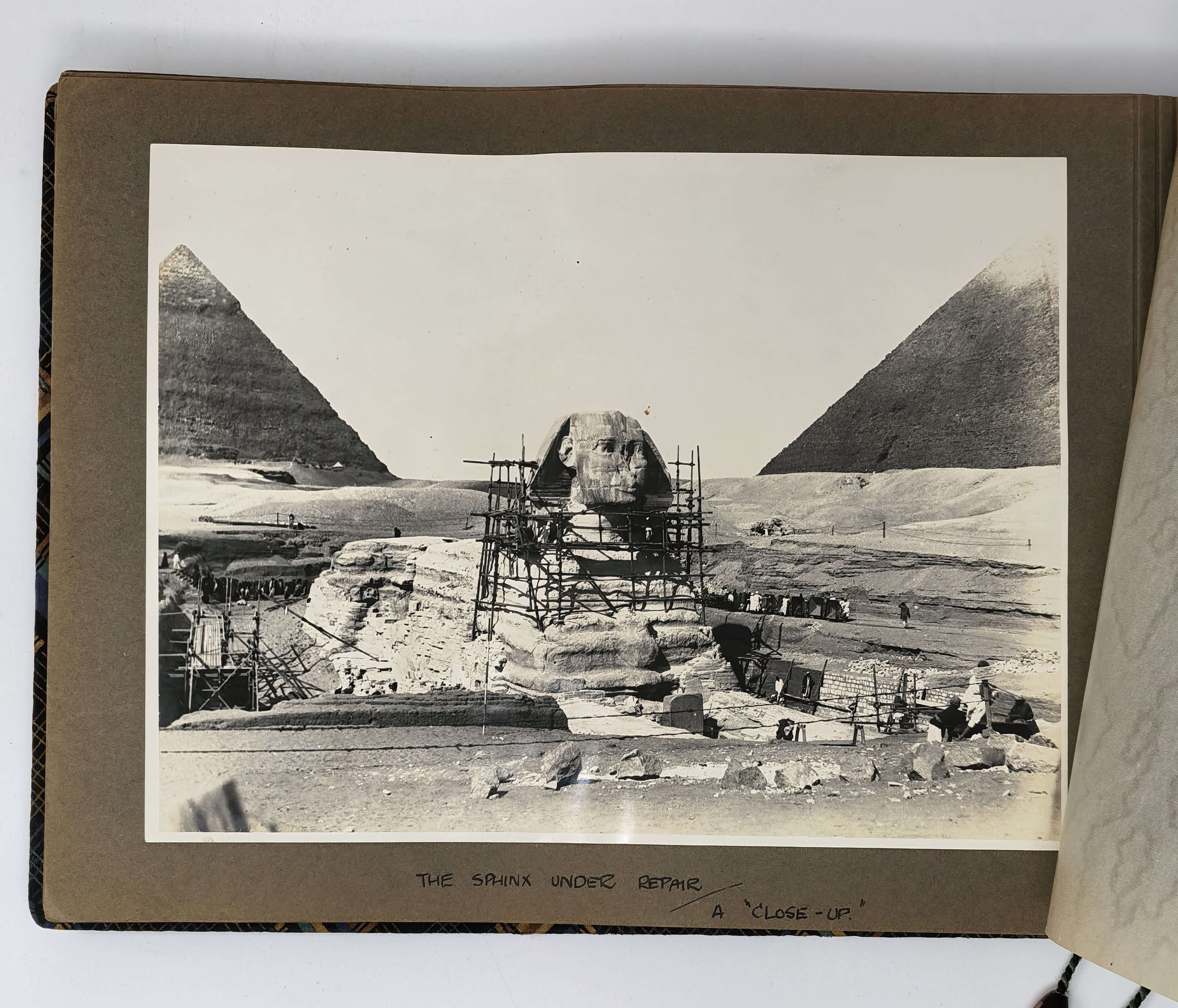 The rest of the photos show Port Said (port and customs house), Cairo (interiors of Muhammad Ali mosque and of the Egyptian Museum, rooftop panorama of “old Cairo”), Alexandria (an aerial view of “Alexandria sporting club ground & race course,” two views of the “Municipal gardens,” “native quarter”), a scene with Muslims praying at a “native temple,” portraits of Bedouins, Nubian women, a native cook near an outdoor fire, &c. There are also four interesting photos showing the Great Sphinx of Giza during the excavation and restoration under the supervision of Emile Baraize (lasted from 1925 to 1936). The images show the Sphinx before the excavations and under repair – with scaffolding around the head and on the side.