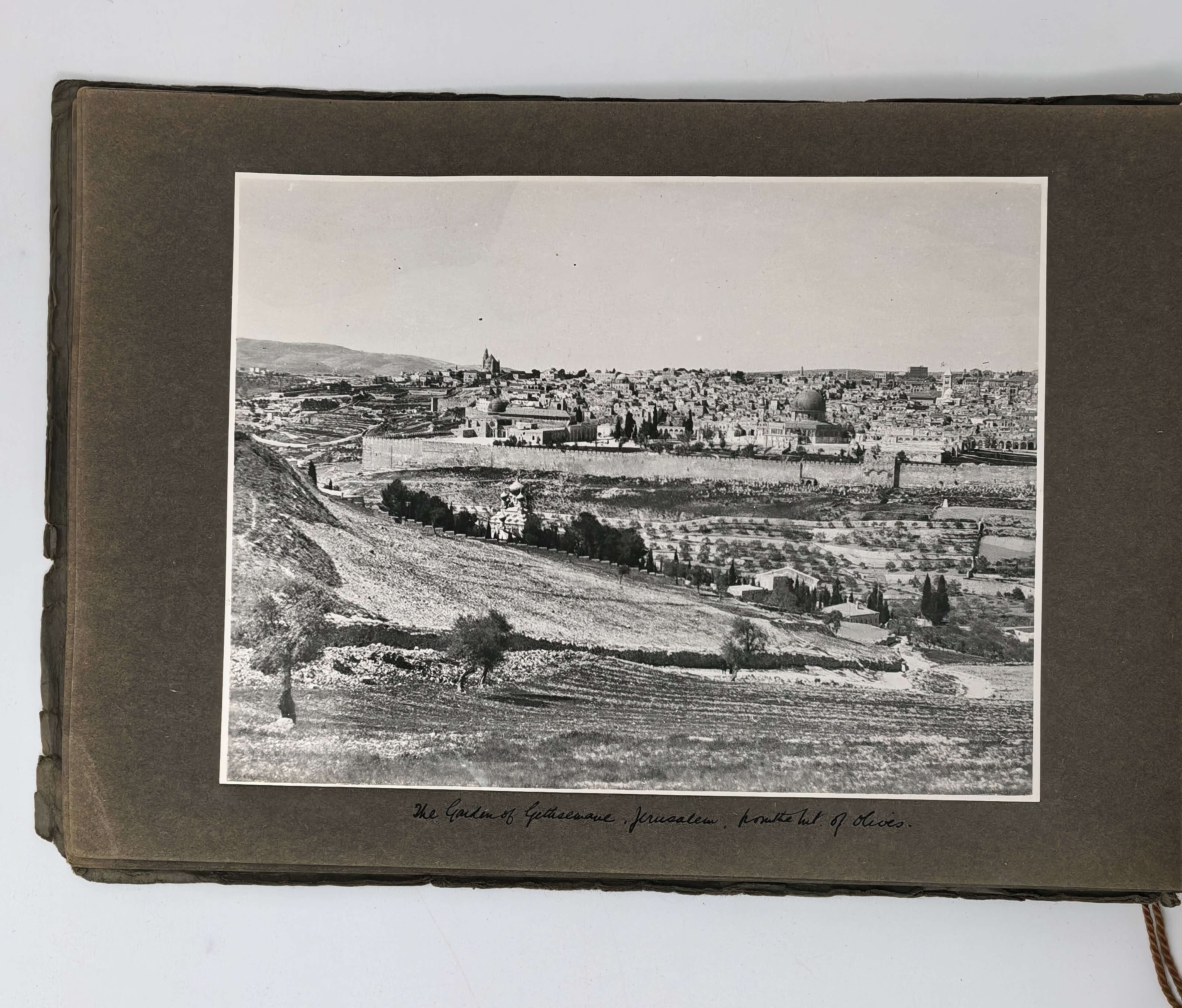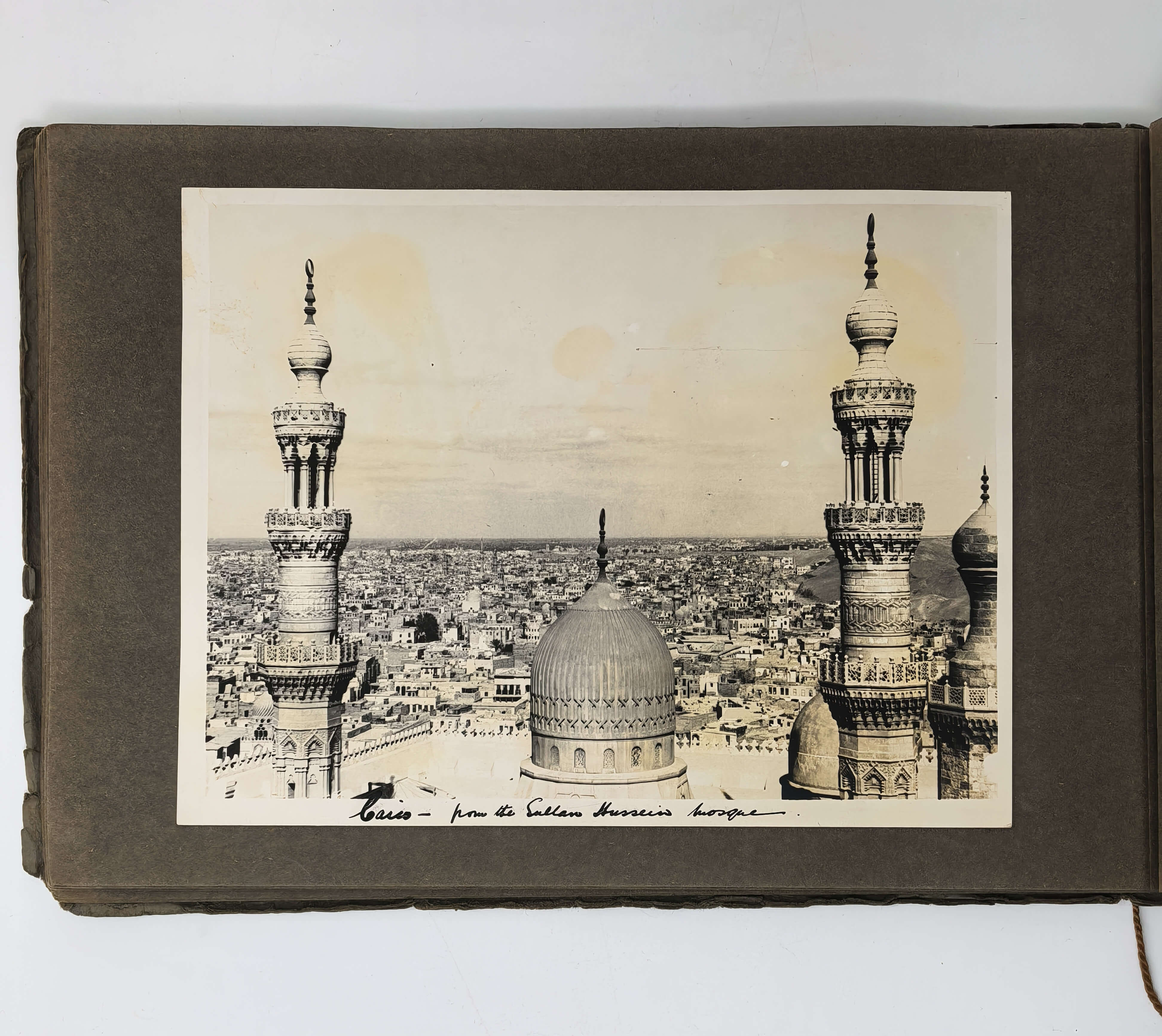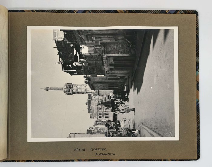 There are also interesting photos of British military aircraft (Vickers Victoria freighter and troop transport plane, “a Fairey III D” in flight over Malta, “a Fairey “Flycatcher” over Malta harbour”), two scenes of “A.O.C.’s inspection” in 1927 (likely, Air Officer Commanding) and a photo of “H.M.S. “Malaya” at Alexandria.” Other images show illumination on Alexandria streets “on the return of King Fuad from England” (likely, after the state visit in July 1927), “Cairo from the Sultan Hussein’s mosque,” “one of the exhibits at Cairo museum (models found while excavating),” “The Collussii [sic!] of Memnon at Thebes (the Luxor),” and “a photograph taken from the top of the largest Pyramid.” The album also contains three views of Jerusalem (“the Garden of Gethsemane,” the interior of “the Church of the Agony in the Garden of Gethsemane,” and the Garden Tomb). Overall a nice collection of large original photos of RAF aircraft and bases, as well as aerial photographs of Egypt in the 1920s.
