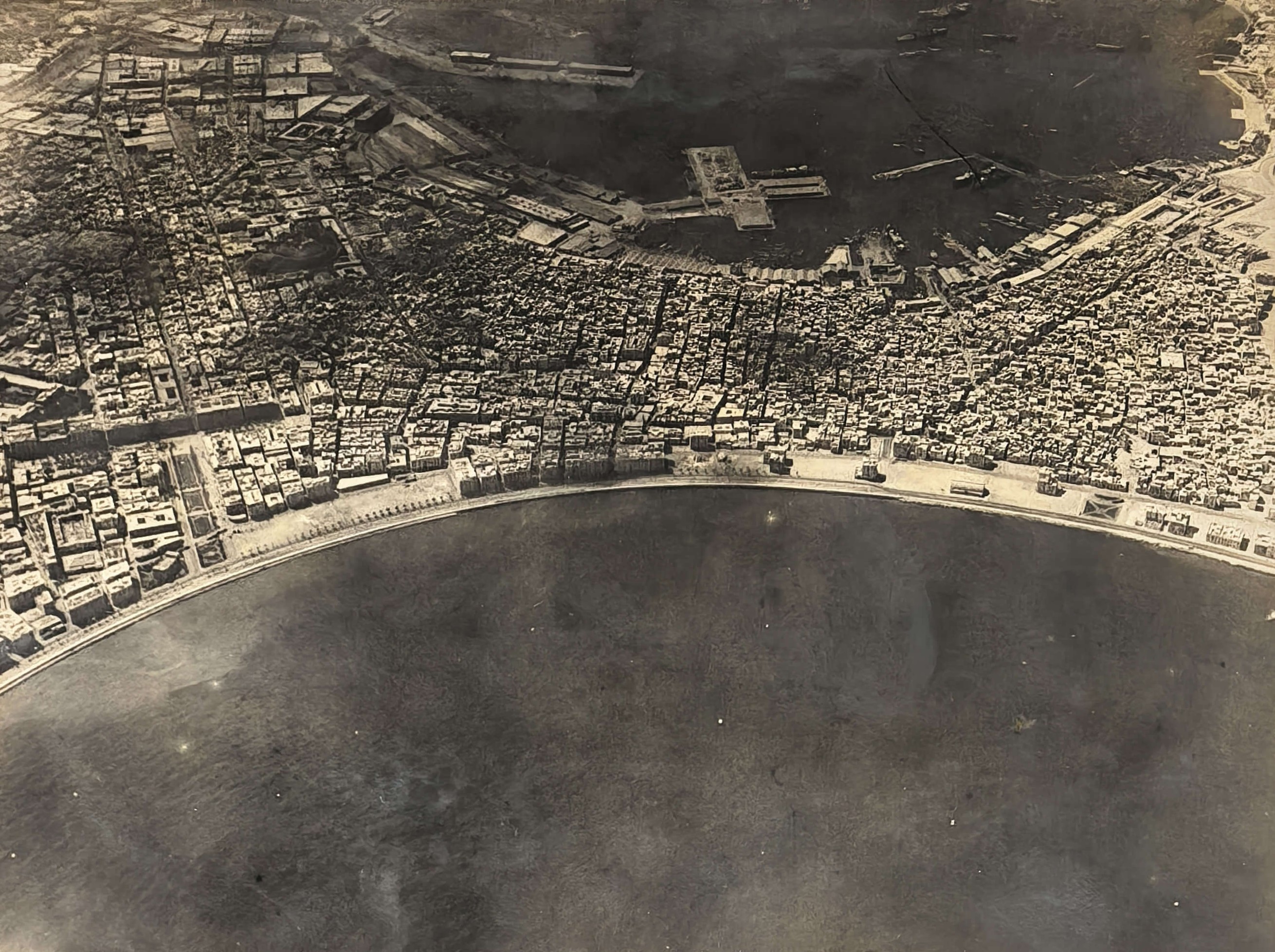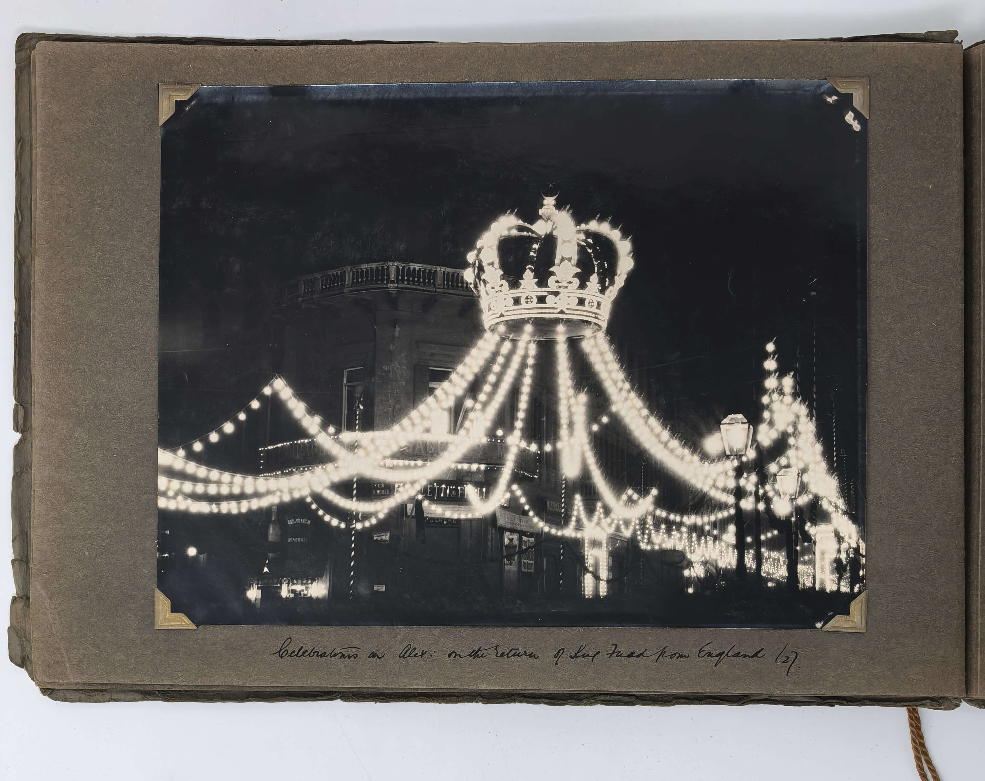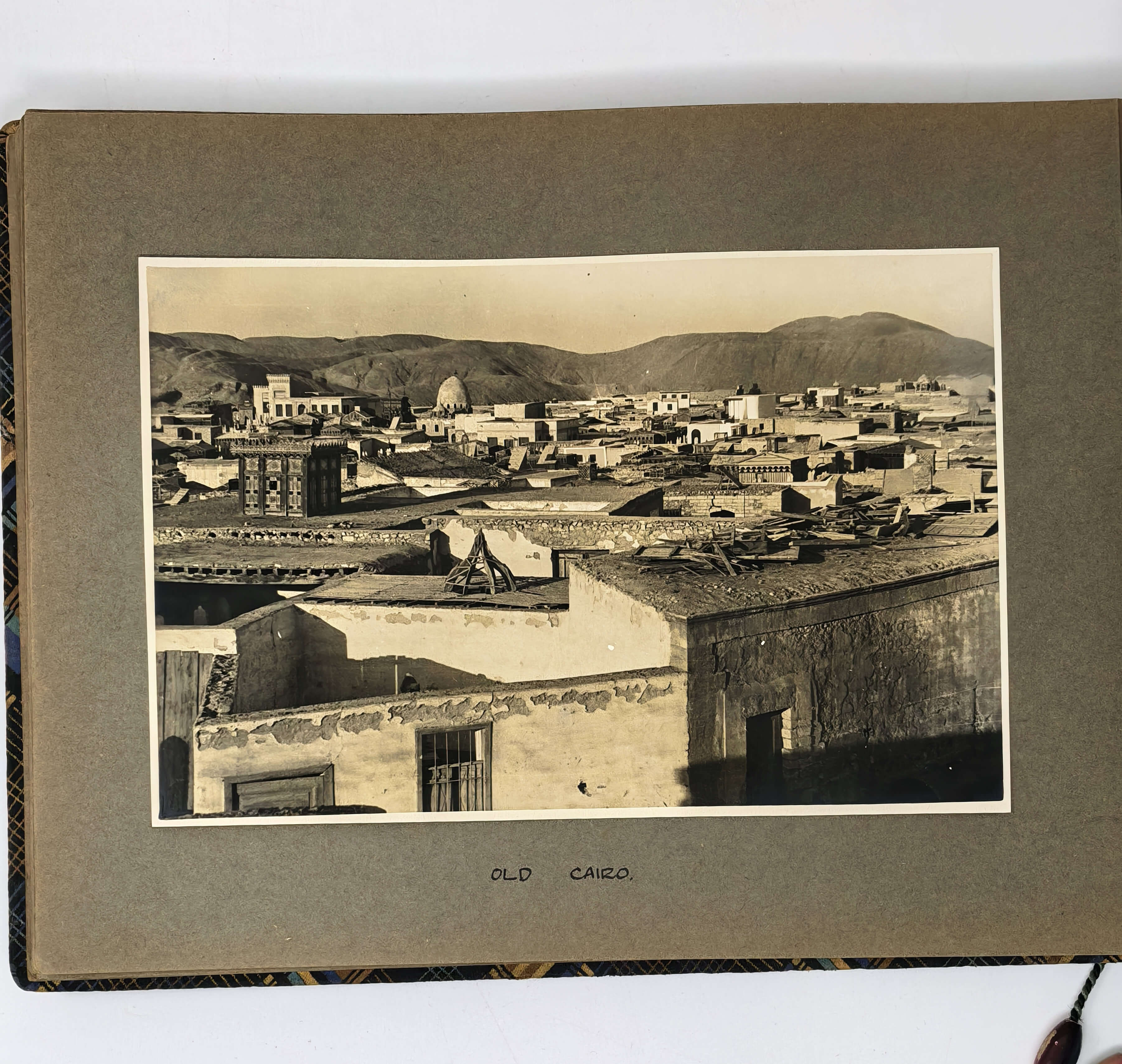 There are also interesting photos of British military aircraft (Vickers Victoria freighter and troop transport plane, “a Fairey III D” in flight over Malta, “a Fairey “Flycatcher” over Malta harbour”), two scenes of “A.O.C.’s inspection” in 1927 (likely, Air Officer Commanding) and a photo of “H.M.S. “Malaya” at Alexandria.” Other images show illumination on Alexandria streets “on the return of King Fuad from England” (likely, after the state visit in July 1927), “Cairo from the Sultan Hussein’s mosque,” “one of the exhibits at Cairo museum (models found while excavating),” “The Collussii [sic!] of Memnon at Thebes (the Luxor),” and “a photograph taken from the top of the largest Pyramid.” The album also contains three views of Jerusalem (“the Garden of Gethsemane,” the interior of “the Church of the Agony in the Garden of Gethsemane,” and the Garden Tomb). Overall a nice collection of large original photos of RAF aircraft and bases, as well as aerial photographs of Egypt in the 1920s.