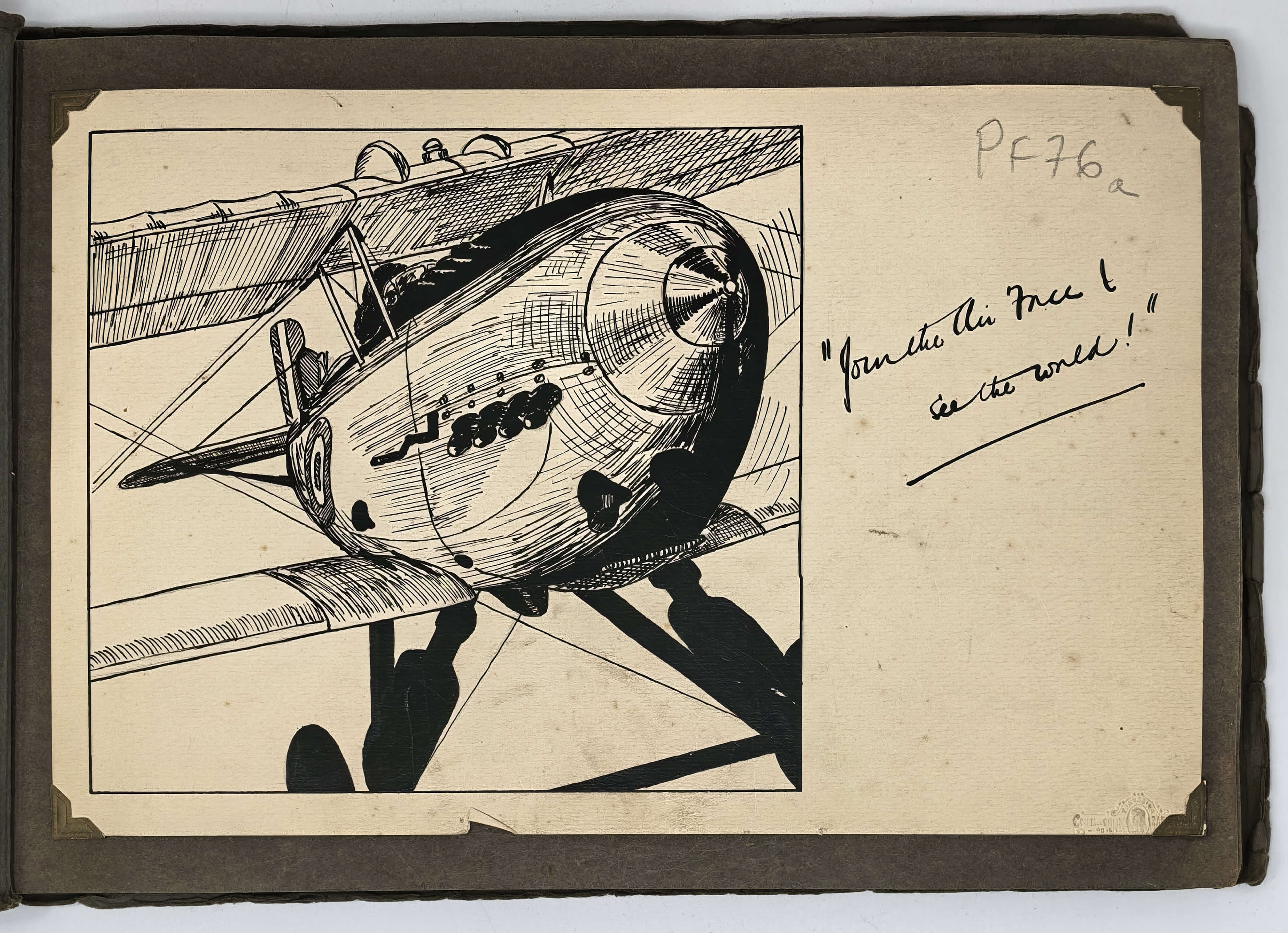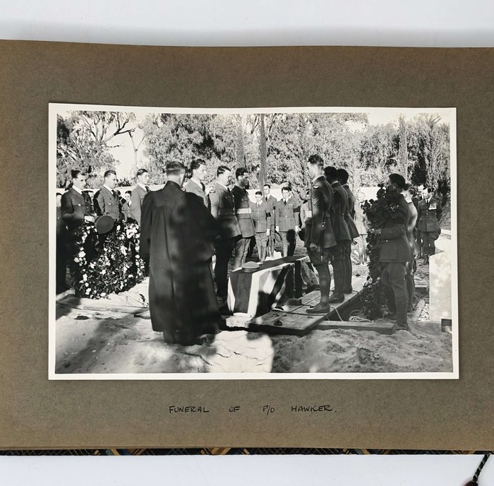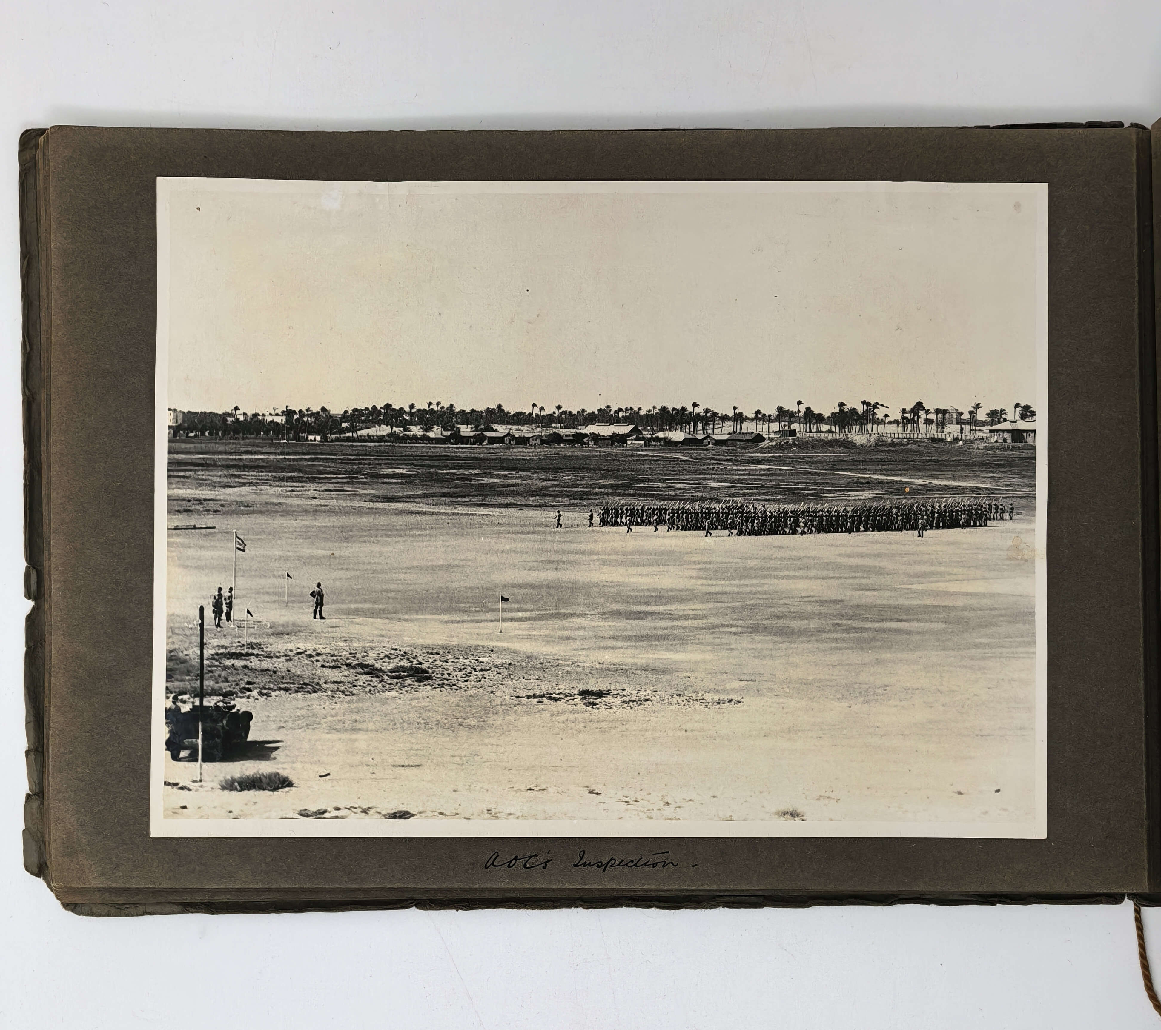 The slightly larger album contains about a dozen photos of military and civil aircraft: “the Air Mail landing at Abu-Sueir,” “a patrol returning,” “208 (A.C.) squadron, Ismailia,” “’C’ flight in formation,” “one of the Fairey III Ds (1926 Cape Flight) at Abu Sueir,” “a French “Breguet XIX” at Abu-Sueir,” “the first Imperial Airways “Hercules” to fly from London to Baghdad passing over near Abu Sueir,” “the renowned “Ninak,” a D.H.9 A. with full desert equipment.” Three images depict crashed planes: (“an ‘F’ flight performance,” “Abou-Sueir/ Nov. ’26,” “a pupil’s effort, Abu Sueir.” There are also two scenes of “funeral of P/o Hawker” in “Abu Sueir, 1926” and a photo of “the Air Vice-Marshal’s inspection, Aboukir, May 1927.”