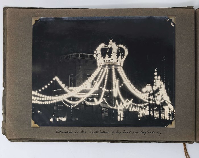 Album 2: Oblong Folio (ca. 21x30,5 cm or 8 ¼ x 12 in). 14 card stock leaves. With 27 mounted original large gelatin silver photos, from ca. 18x24 cm (7 x 9 ½ in) to ca. 16x21,5 cm (6 ¼ x 8 ½ in). Four images are captioned in negative (three – on the lower margin); twenty-three with period ink captions on the mounts. With a mounted ink drawing, paper size ca. 17x26,5 cm (6 ¾ x 10 ½ in). Period grey card album fastened with a string; blind-stamped decorative vignette on the front cover. Covers with creases and minor tears on extremities, two photos with minor creases or folds on the corners, but overall a very good album with interesting strong photos.