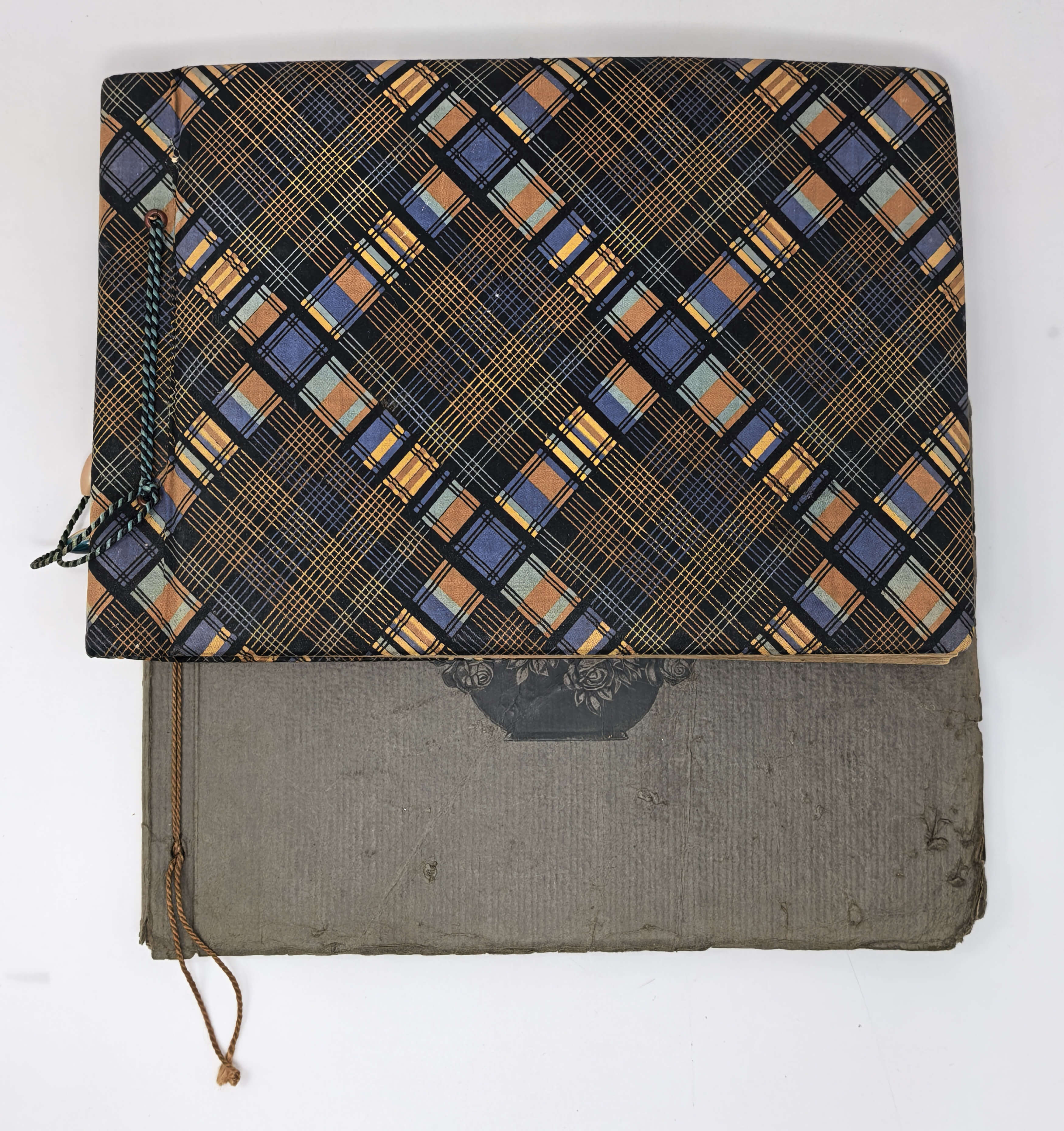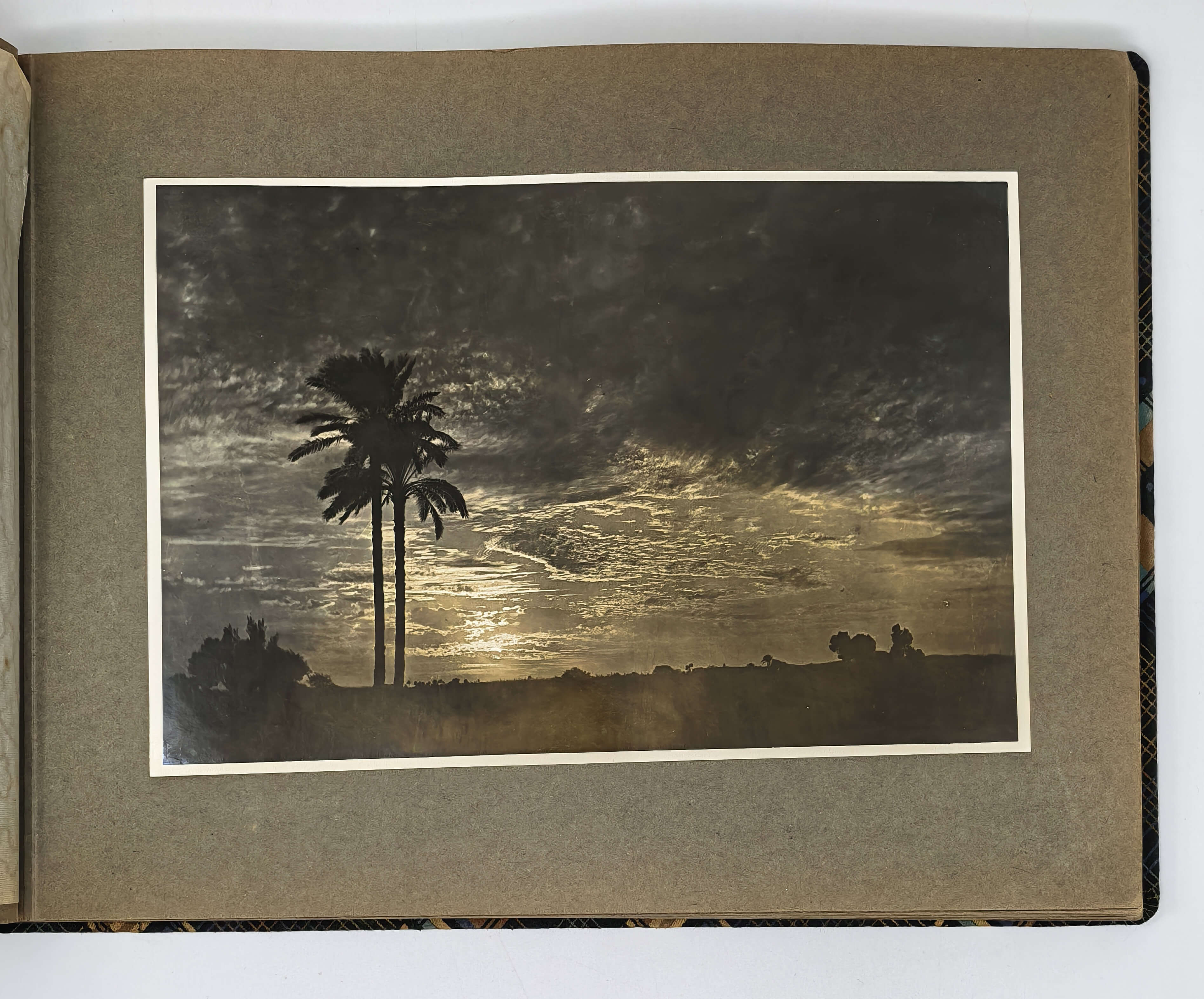 Album 1: Oblong Folio (ca. 22x31,5 cm or 8 ¾ x 12 ¼ in). 24 card stock leaves with tissue guards. With 50 mounted original gelatin silver photos, including 46 large images from ca. 16,5x23 cm (6 ½ x 9 in) to ca. 14x21 cm (5 ½ x 8 ¼ in), and four smaller photos ca. 7x13,5 cm (2 ¾ x 5 ¼ in). All but six photo with period ink captions on the mounts; three images are also dated “Nov. 26,” “1926” or “May 1927.” Period full patterned cloth album fastened with a string with two decorative beads. Front cover slightly waved, several tissued guards with minor creases, one with a small loss on the bottom, but overall a very good album with strong interesting photos.