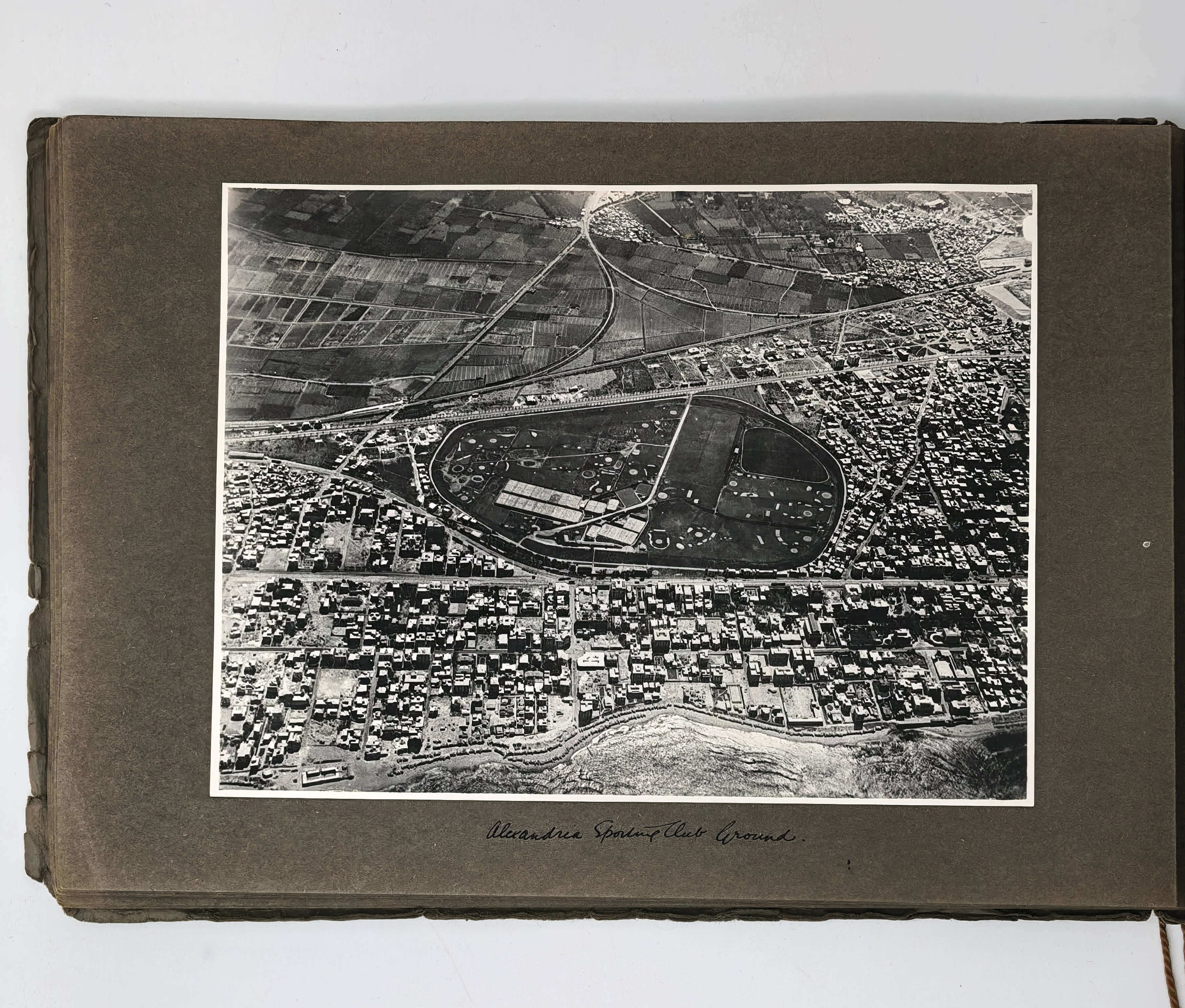 The smaller album contains twelve excellent aerial views: “the Nile barrage,” “Bulkeley – the English colony of Alexandria,” “King Fuad’s Palace at Montaza (nr. Aboukir),” “Church of St. Sophia – Cairo,” “the Mauretania in Alexandria harbour,” “Aboukir from the north,” “Aboukir village from the south,” “a Vickers Vernon over Damanhour,” “Alexandria sporting club ground,” “Ras-el-Tin hospital barracks, Alexandria,” “Mena and the Sphinx from the air,” “a general view of Alexandria.”