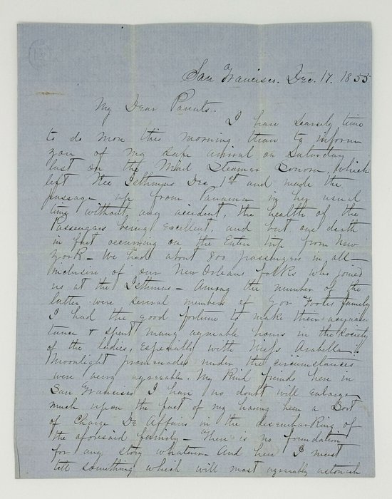 Excerpts from the letter: “We had about 800 passengers in all inclusive of our New Orleans folks who joined us at the Isthmus. Among the number of the latter were several members of the Gov. Foote’s family. I had the good fortune to make their acquaintance & spent many agreeable hours in the society of the ladies, especially with Miss Arabella. Moonlight promenades under the circumstances were verry [sic!] agreeable. My kind friends here in San Francisco I have no doubt will enlarge much upon the fact of my having been a sort of charge de affairs in the disembarking of the aforesaid family. There is no foundation for any story whatever.