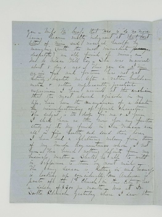 And here I must tell something which will most agreeably astonish you. Miss [M. Cross?] that was is so no more having become vastly indignated at that last letter of mine and revenged herself by marrying (with the most immediate despatch) an old friend of mine, [Mr. le Wilson Hill?] Esq. She was married about 8 days ago. Thus you see I am again free and fortune has not yet entirely deserted me. After a rather melodramatic & rather unpleasantly practical experience I have arrived at the conclusion that the most absurd episodes in my life have been the consequence of a lamentable misunderstanding of female character. The subject is too deep for me & I fear I shall have no time now for any further duty of it.