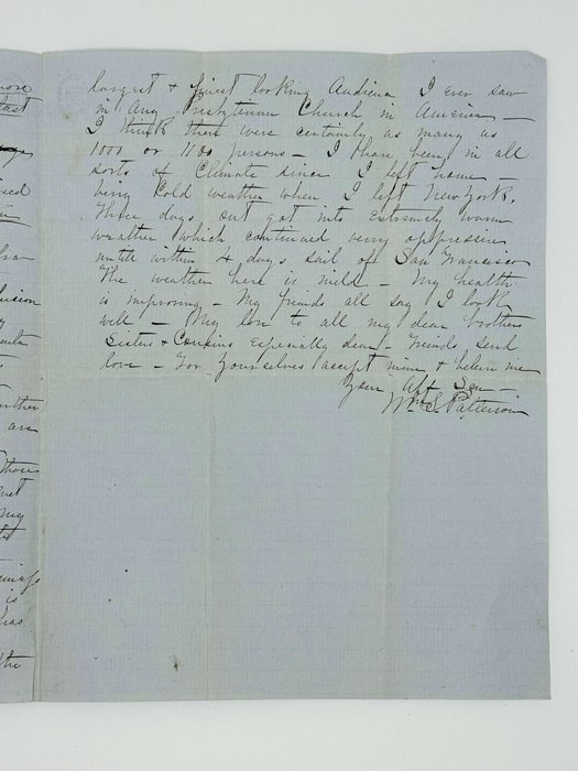 My friends in San Francisco are all in fine health and send their love. I have had a flattering welcome from my Nevada acquaintances whom I met here. Have heard nothing definite from my business matters. Shall be able to write in refference [sic!] to them by next mail. The rainy season is setting in and business is looking up considerably. Mr. Anderson is pastor of the 1st Church in the city & has a salary of $300 pr. month. Was at Dr. Scott’s Church yesterday where I saw the largest & finest looking audience I ever saw in any Presbyterian Church in America. I think there were certainly as many as 1000 or 1100 persons. <…>”