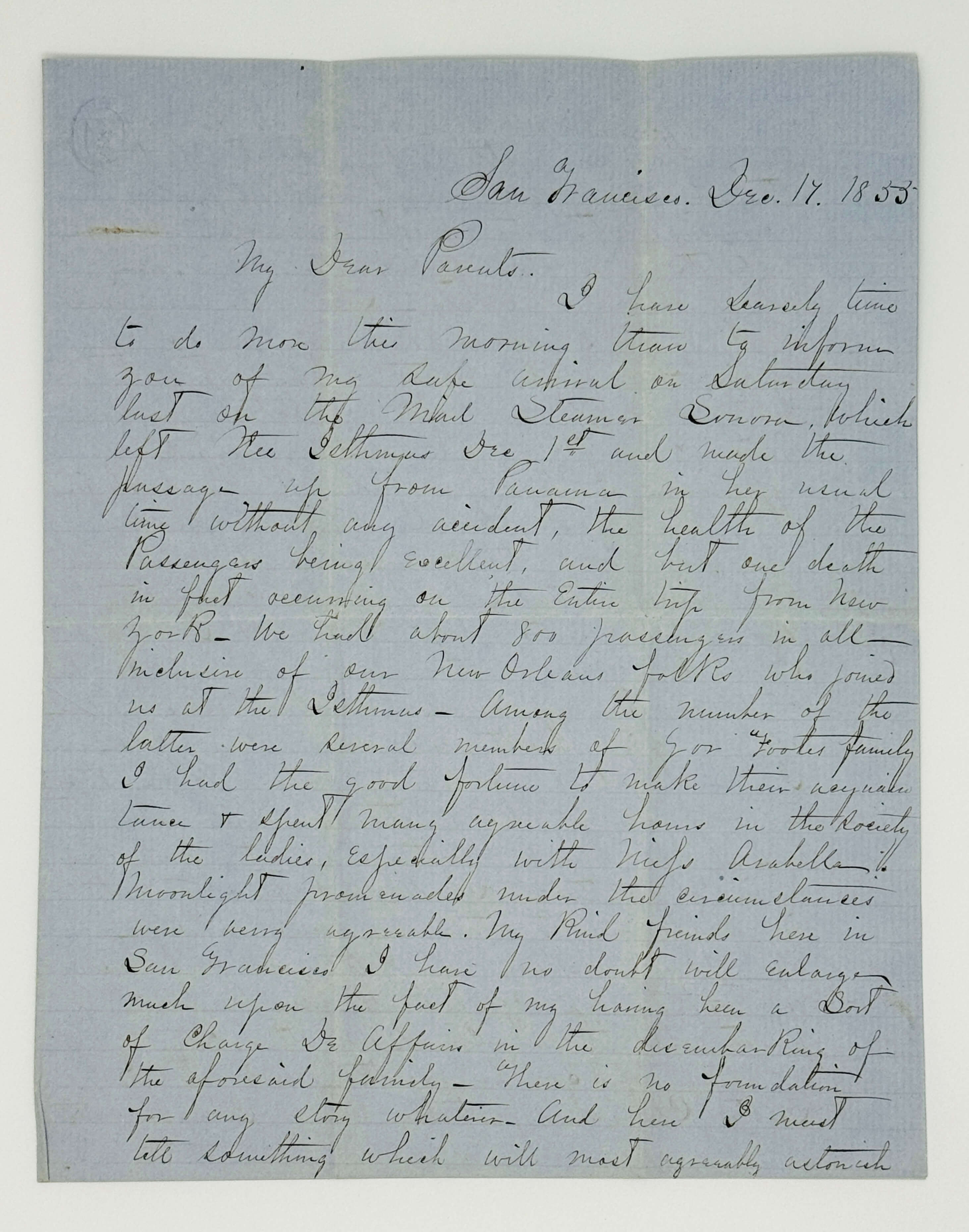 Excerpts from the letter: “We had about 800 passengers in all inclusive of our New Orleans folks who joined us at the Isthmus. Among the number of the latter were several members of the Gov. Foote’s family. I had the good fortune to make their acquaintance & spent many agreeable hours in the society of the ladies, especially with Miss Arabella. Moonlight promenades under the circumstances were verry [sic!] agreeable. My kind friends here in San Francisco I have no doubt will enlarge much upon the fact of my having been a sort of charge de affairs in the disembarking of the aforesaid family. There is no foundation for any story whatever.
