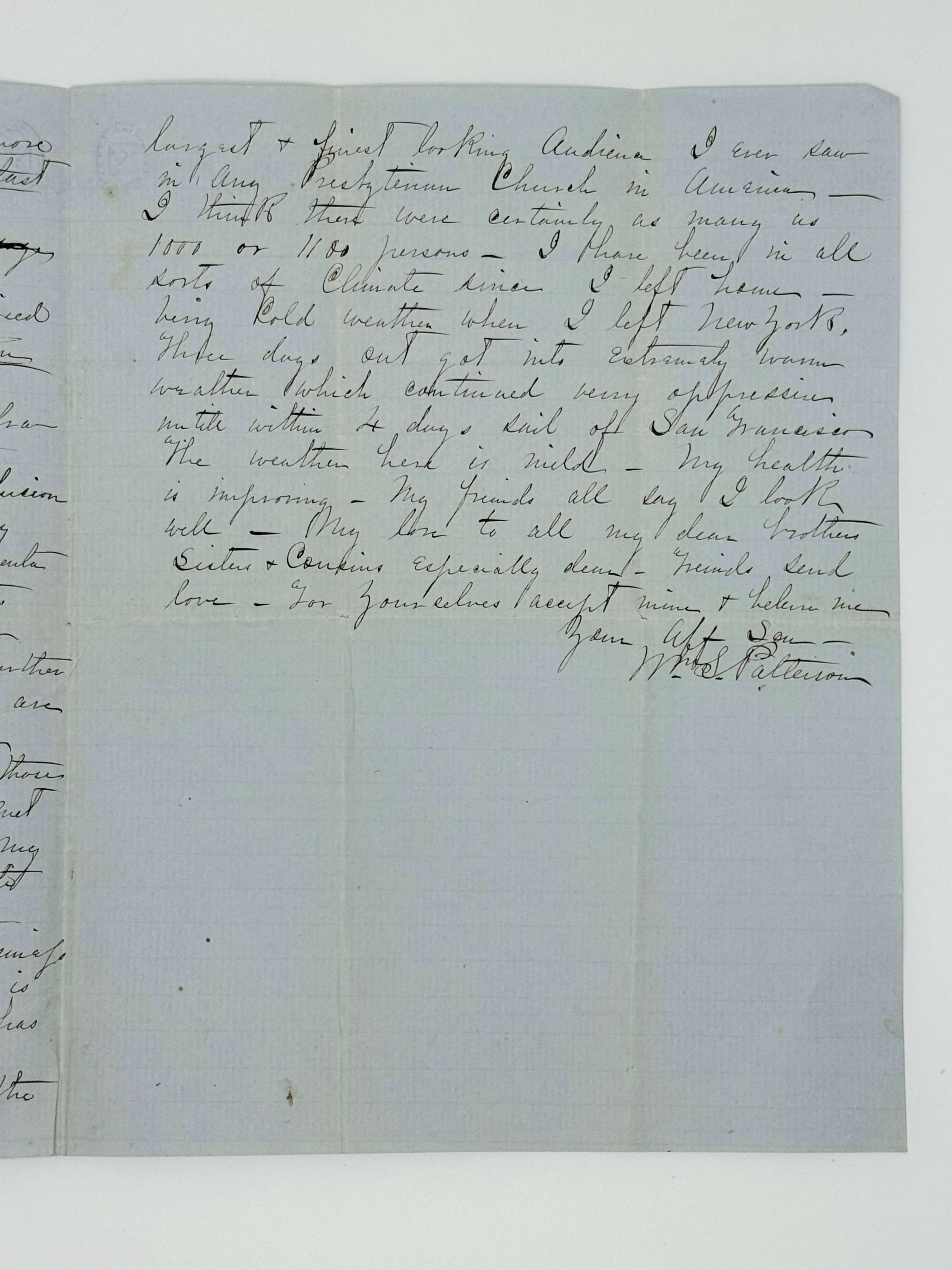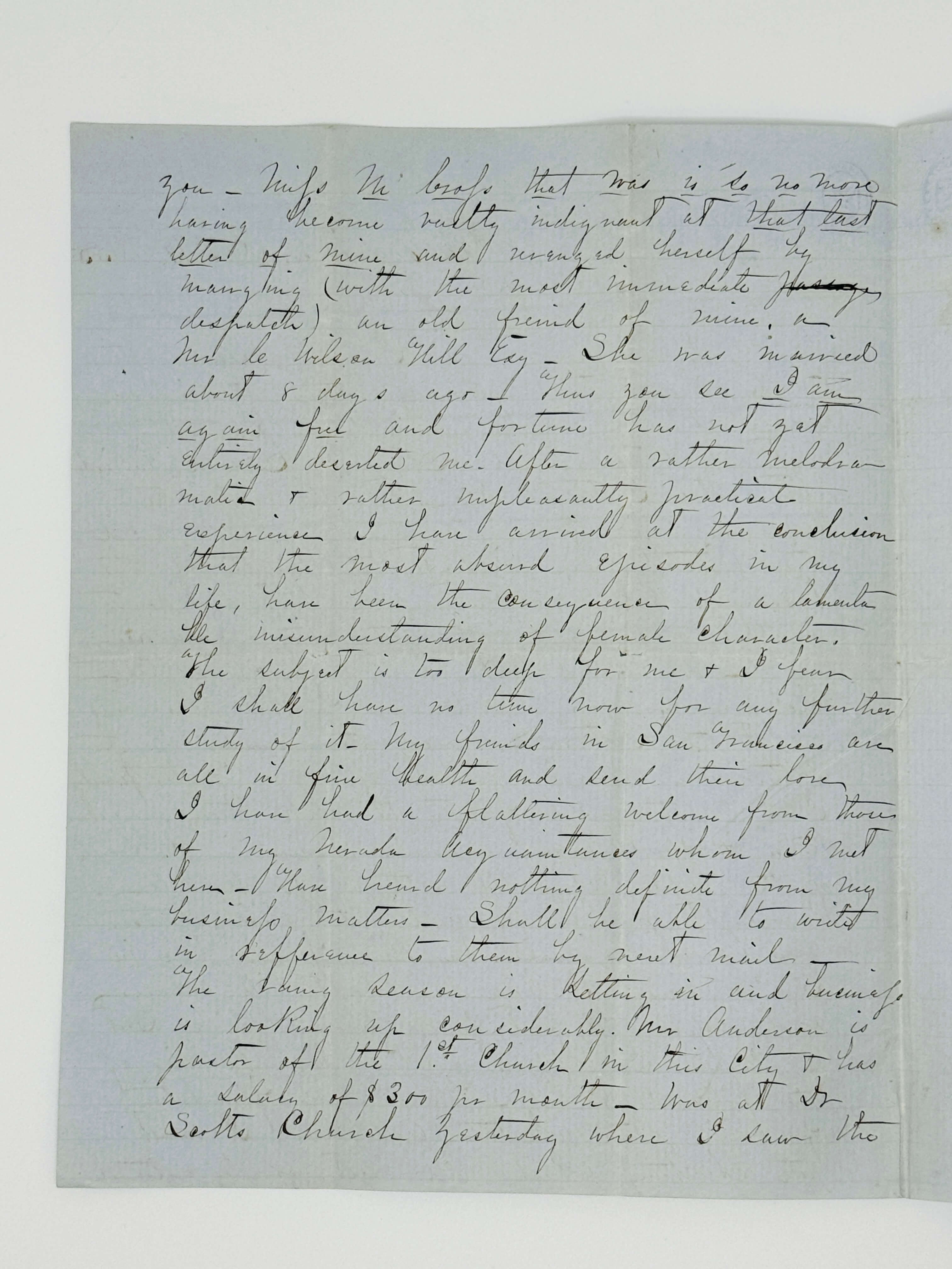 My friends in San Francisco are all in fine health and send their love. I have had a flattering welcome from my Nevada acquaintances whom I met here. Have heard nothing definite from my business matters. Shall be able to write in refference [sic!] to them by next mail. The rainy season is setting in and business is looking up considerably. Mr. Anderson is pastor of the 1st Church in the city & has a salary of $300 pr. month. Was at Dr. Scott’s Church yesterday where I saw the largest & finest looking audience I ever saw in any Presbyterian Church in America. I think there were certainly as many as 1000 or 1100 persons. <…>”