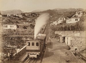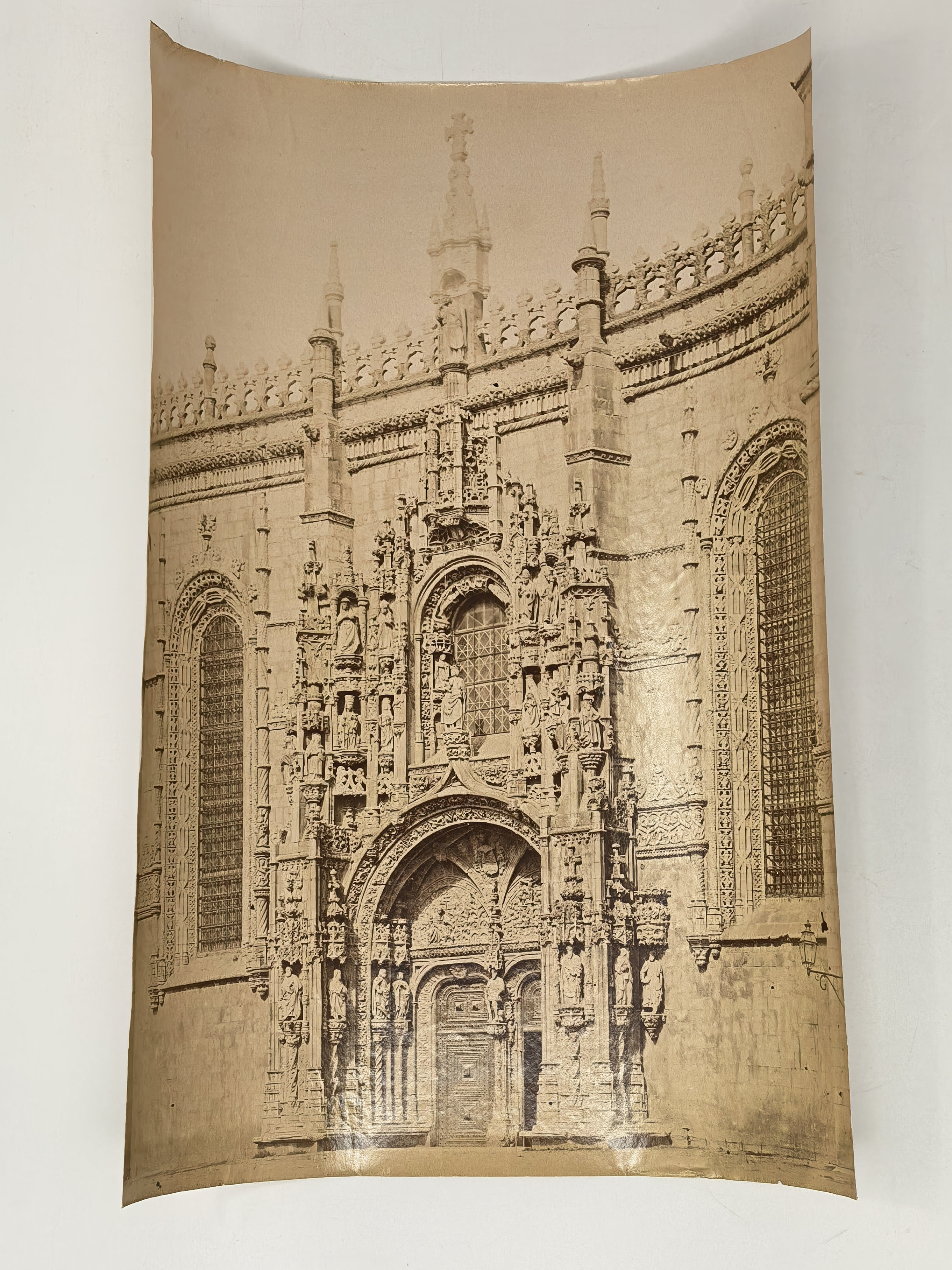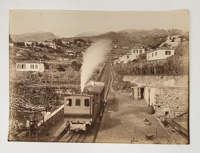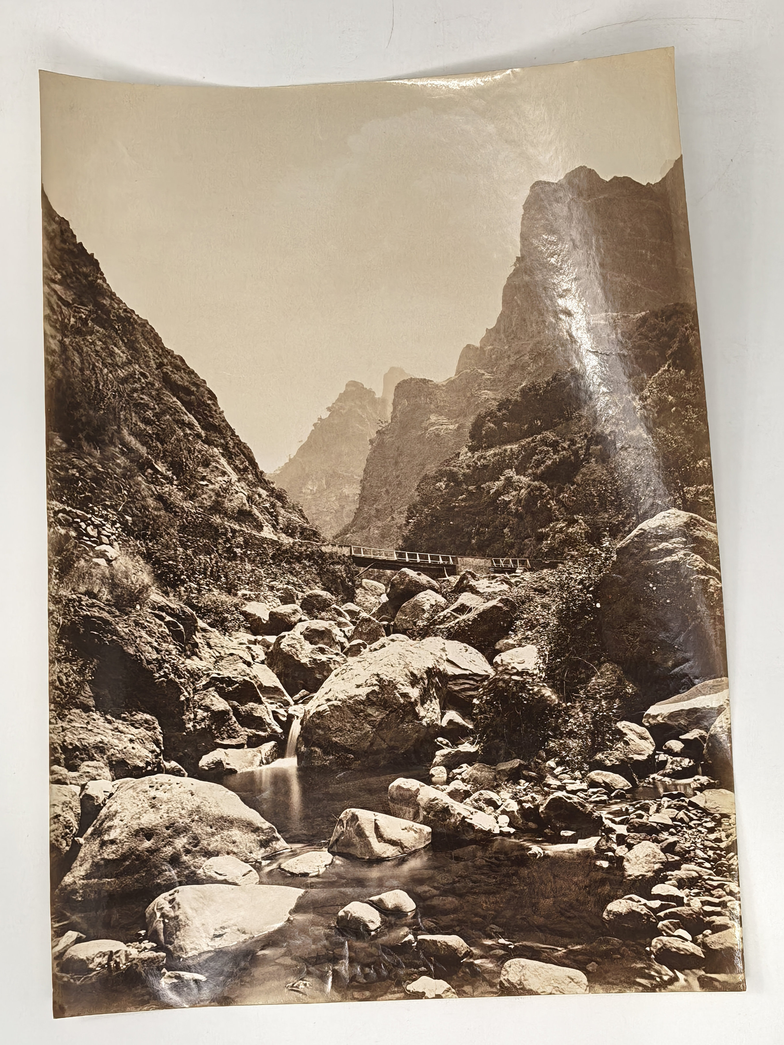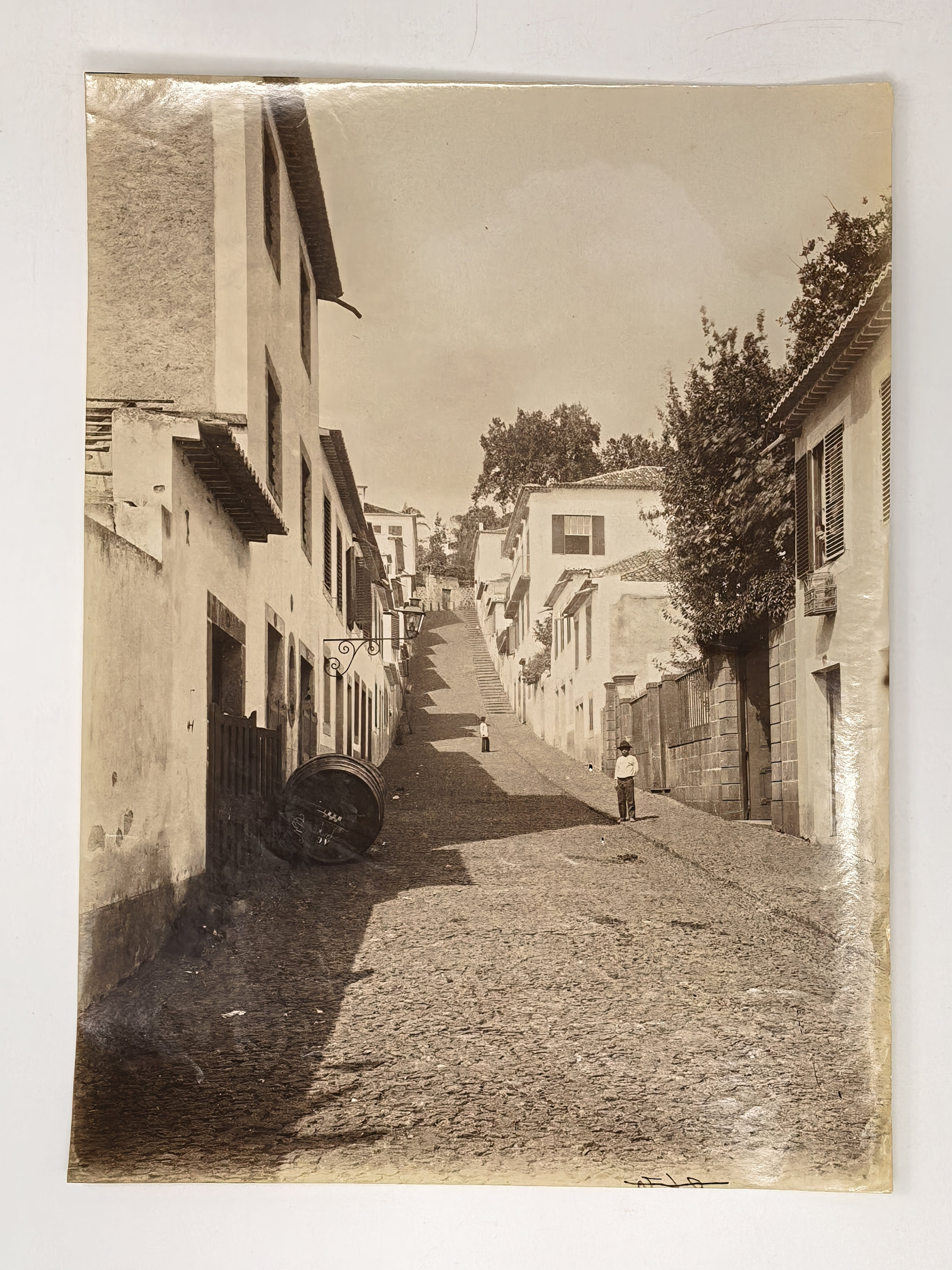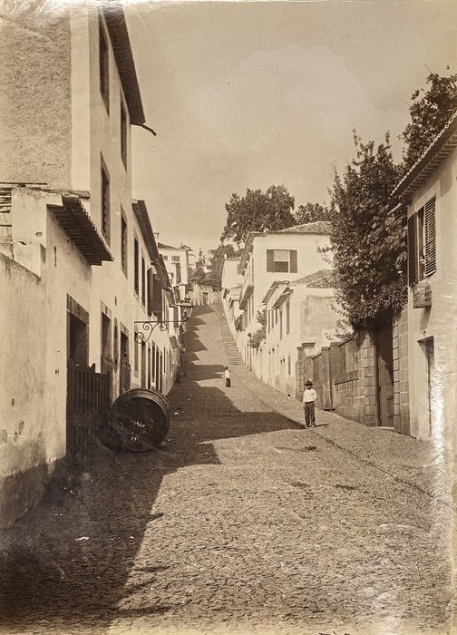 Interesting collection of fifteen early, well-preserved original albumen and gelatin silver studio photos of Portugal and Madeira in the late 19th century. Nine images of Madeira (including three gelatin silver photos by A.C. Santos and one albumen photo by M.d. O. Perestrello) show Funchal (general views with the harbour, Monte Railway with a steam engine, “Grand Hotel,” “Rua Bella Vista”), Camara de Lobos village, Cruzinhas viewpoint, and Ribeirado Cidrao canyon. There is also a lively scene with a traveller posing in a traditional carro do Monte sled, driven by two oxen. Five albumen photos by Francesco Rocchini show Sintra (Pena Palace, Montserrate Palace, general view with the Town Palace) and Jerónimos Monastery in Belem (South Portal, the cloister). The collection also includes an albumen view of St. John’s Co-Cathedral in Valetta, Malta. Overall, a nice collection of early, well-preserved original photographs of Portugal and Madeira.