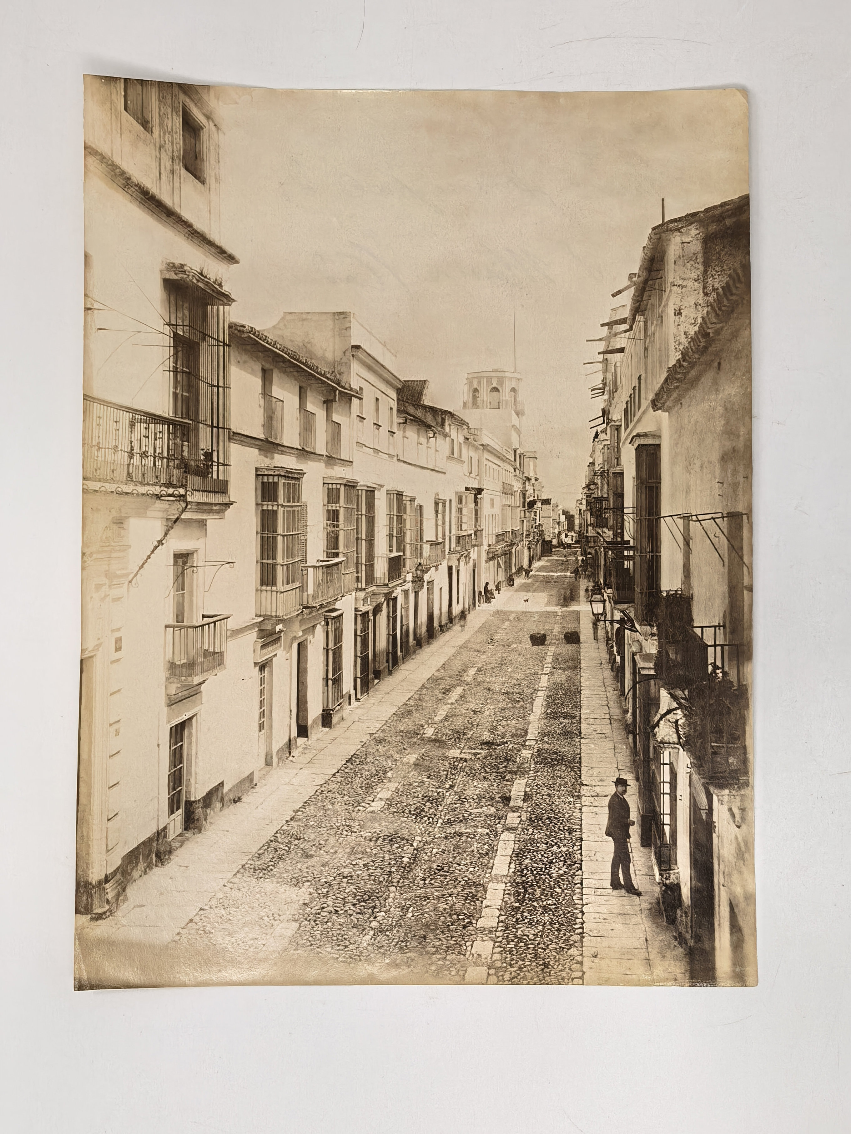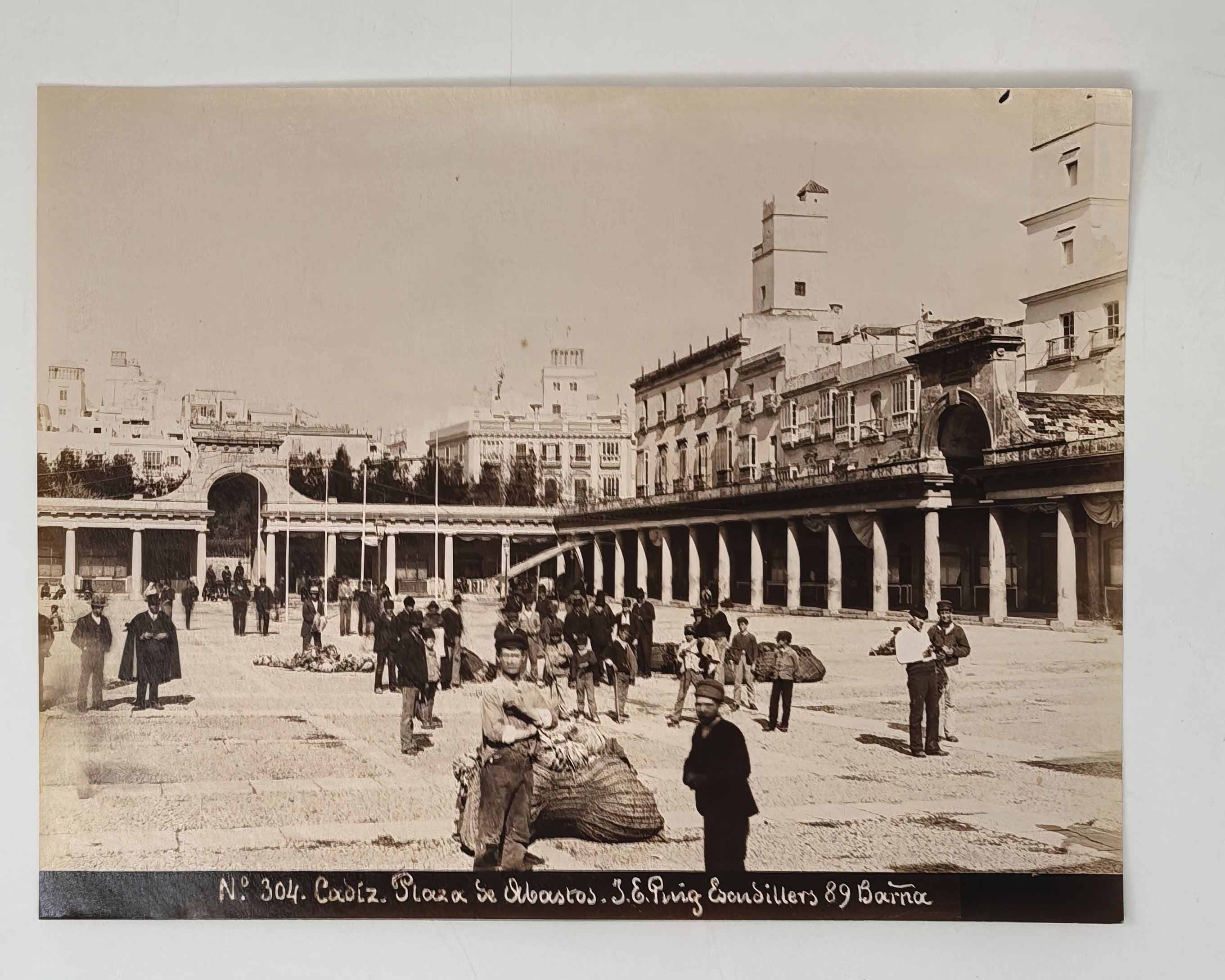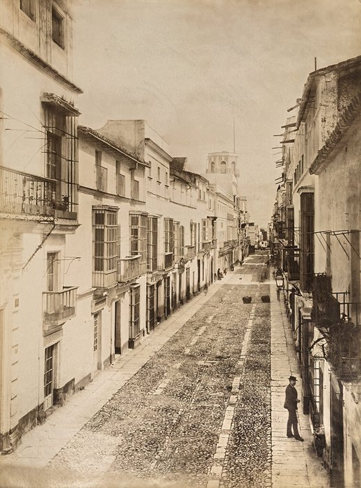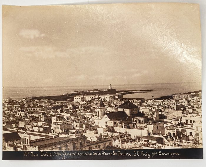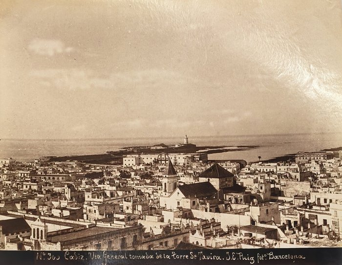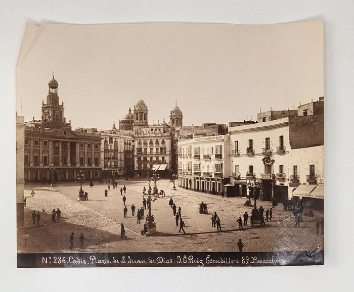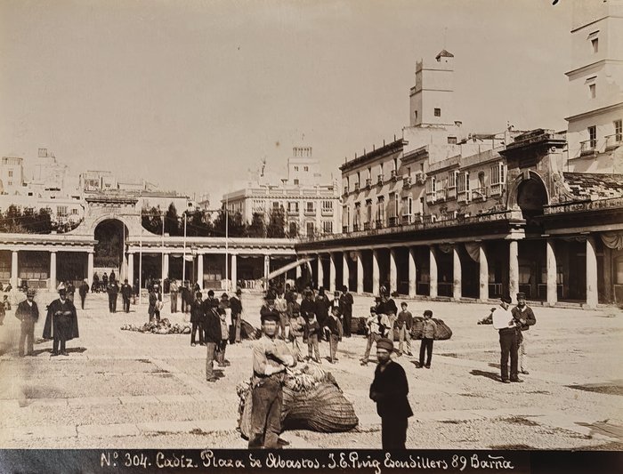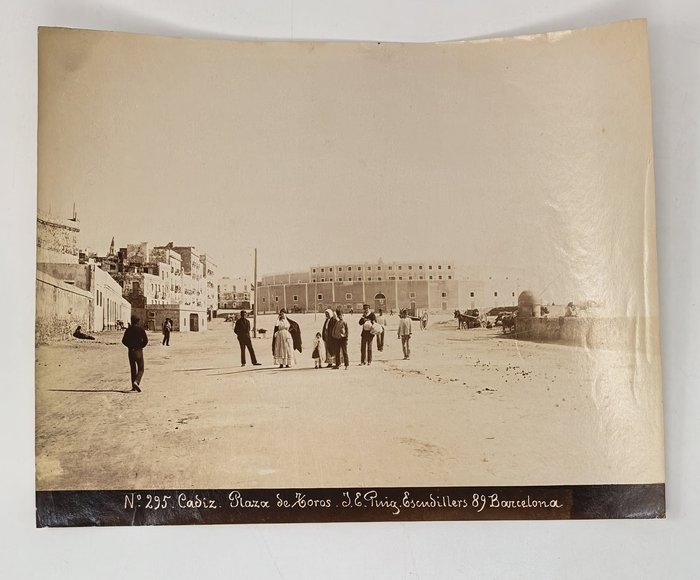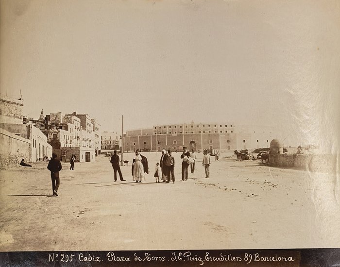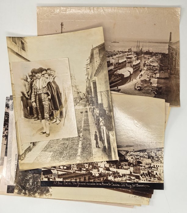 Interesting collection of thirteen early, well-preserved original albumen studio photos of Gibraltar and Spain in the late 19th century. Five views of Gibraltar include three images of the Rock (east side looking north with British barracks in the centre, Signal Hill battery, the summit taken from the sea), Europa Point battery and the Eastern enclosure of the Moorish Castle. Four views of Cadiz, with the credentials of Jose E. Puig, show Plaza de San Juan de Dios, Plaza de Toros, Plaza de Abastos (Central Market), and a general view of the city from Torre Tavira looking towards the sea. An interesting image with the ink stamp of Rafael Rocafull y Monfort on the verso shows a public park in the nearby town of El Puerto de Santa Maria. An unsigned photo is an attractive view of “strada principale di Porto S. Maria (Cadice).” There is also a view of a port with several boats in a dock, piles of logs and local workers, most likely, in Spain. The smallest photo portrays a young Spanish torero (bullfighter) wearing a traditional traje de luces outfit and a montera hat.