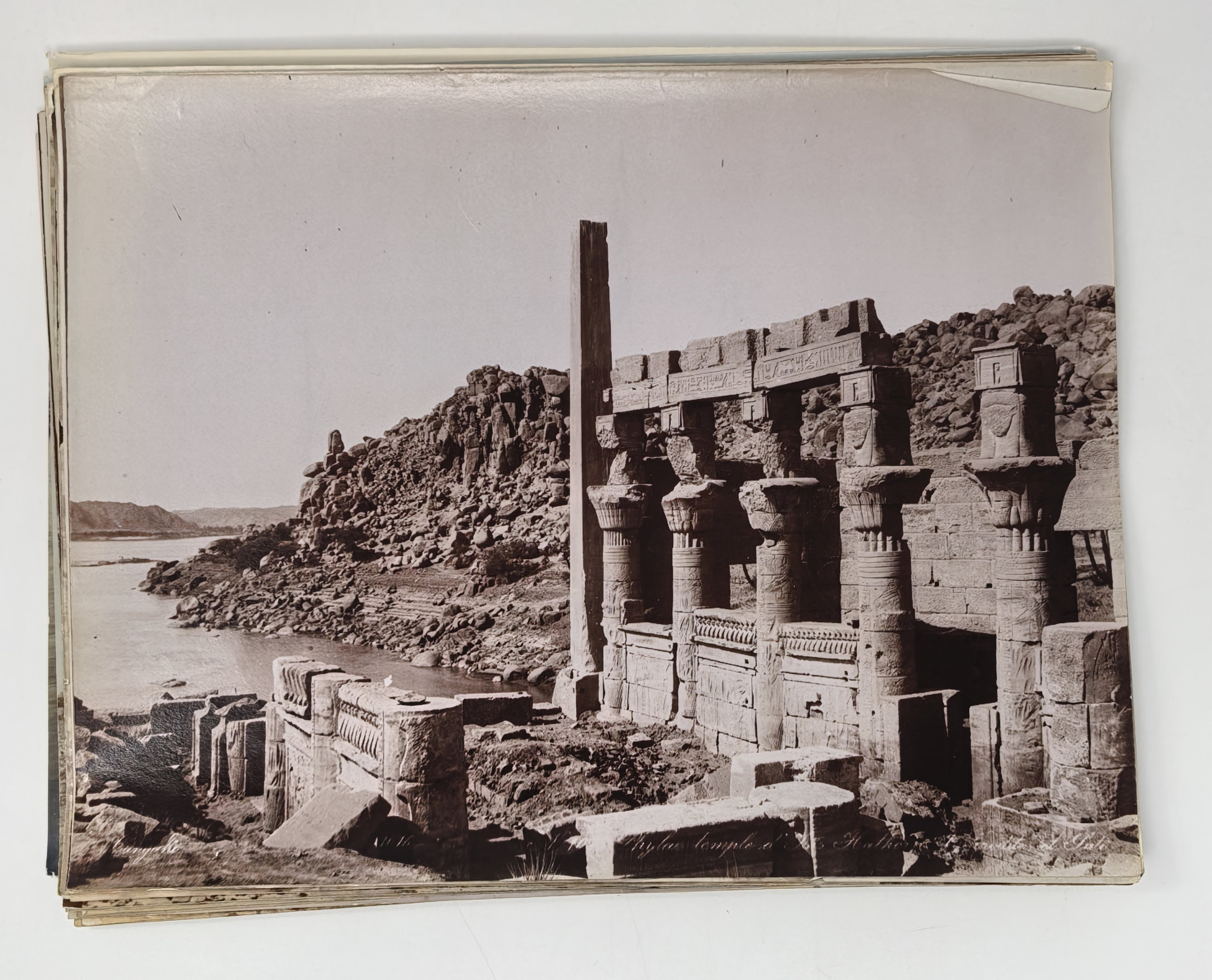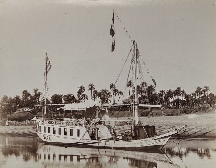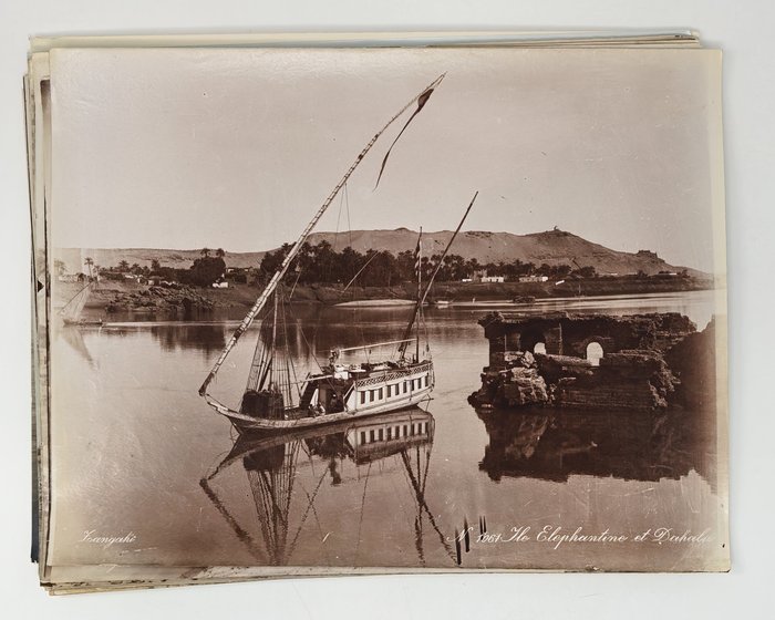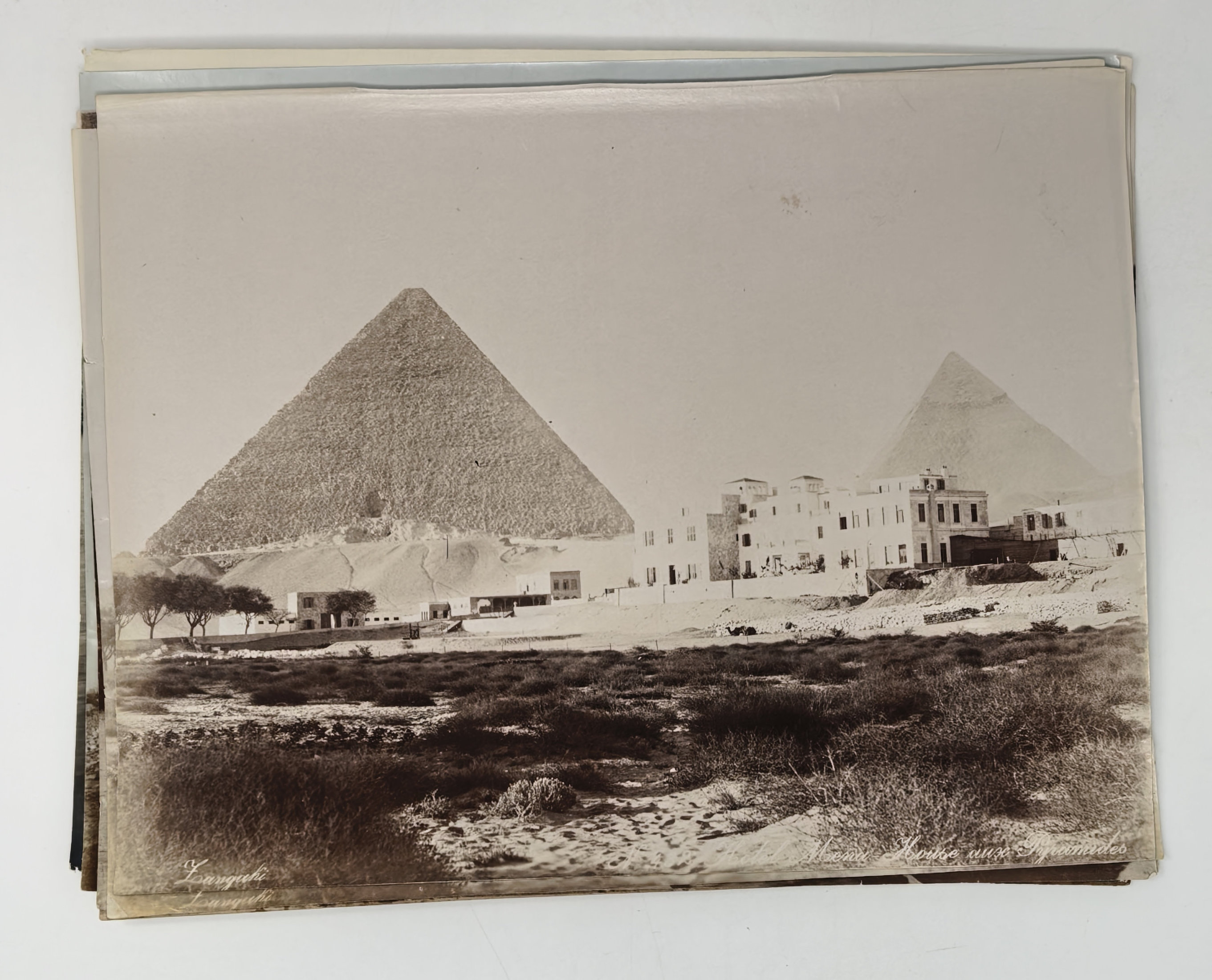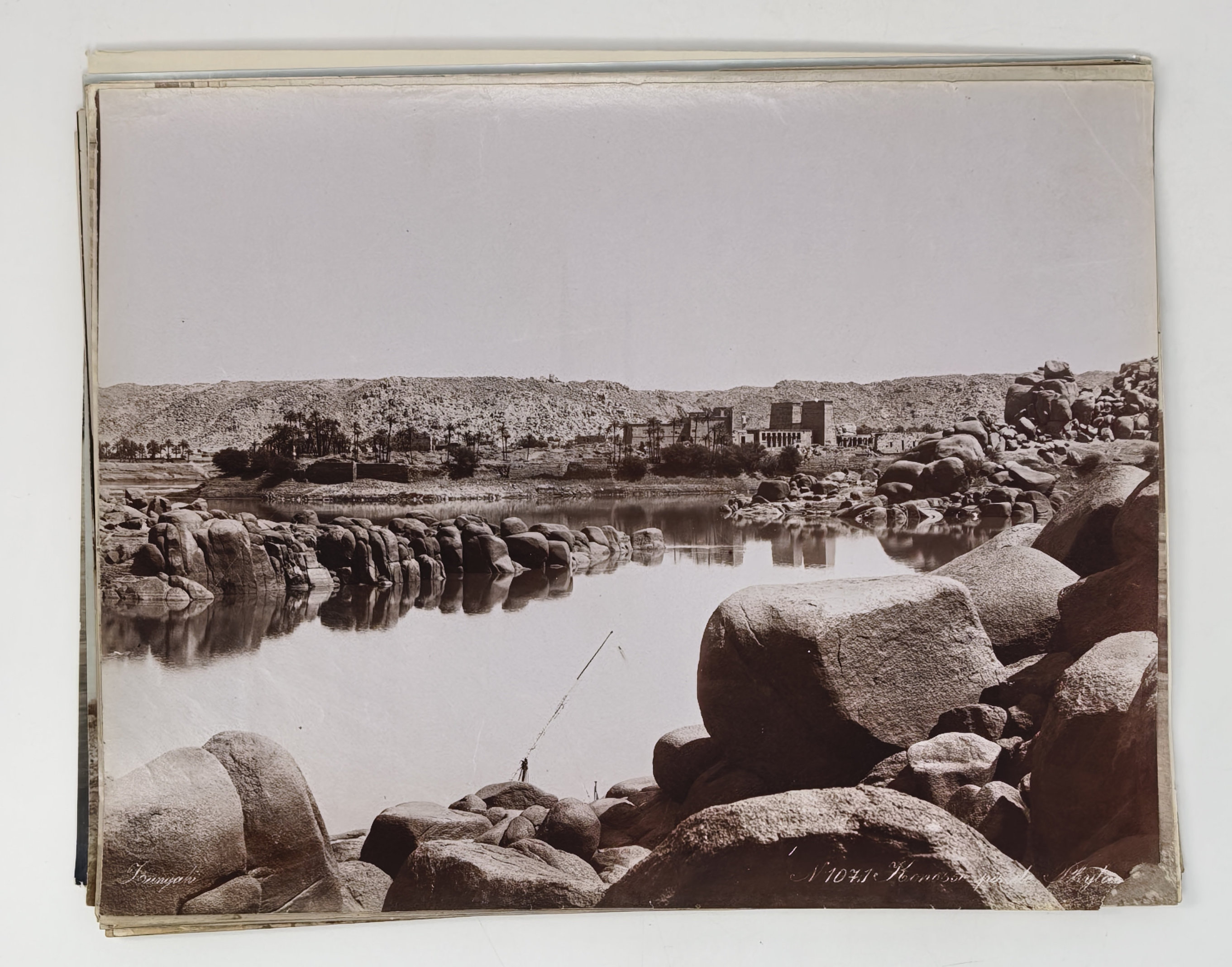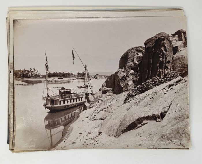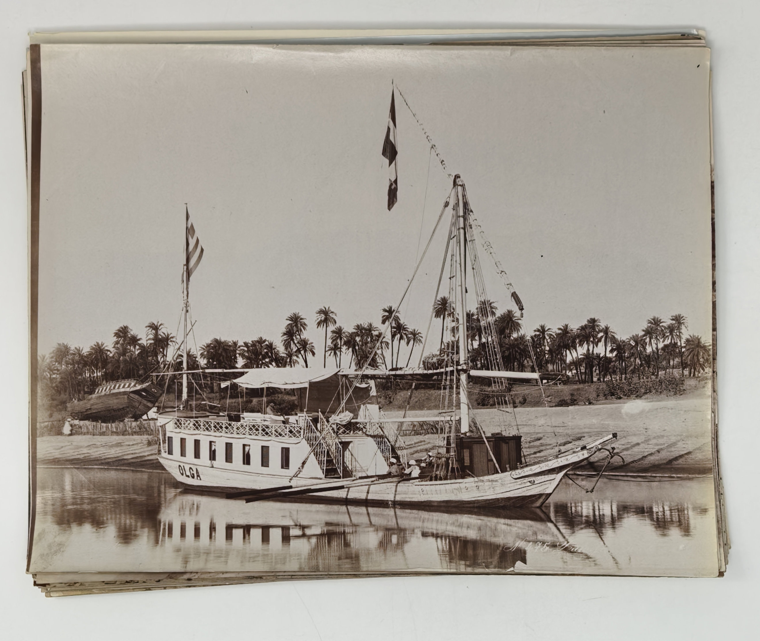 Interesting collection of early original albumen and gelatin silver photographs of Egypt from the late 19th–early 20th century, taken by the prominent local studios of Zangaki Brothers, Pappa Peridis, and Luigi Fiorillo. Twenty-two photos by the studio of Zangaki Brothers show Cairo (Citadel and Muhammad Ali Mosque, Citadel and nearby Arab village, the Nile at Bulaq, a street view), Aswan (the Nile and railway tracks with various machinery), Pyramids of Giza (general views with Mena House hotel, the Nile and palm groves or a small dam, a close-up view of the Great Pyramid), Philae Temple (general views taken from the north, Temple of Hathor), Karnak Temple (Great Hypostyle Hall), the First Cataract at Aswan, three views of the “Olga” dahabiya boat on the Nile (Swedish flag is visible, two locations are captioned – the Elephantine Island and Aswan), &c.
