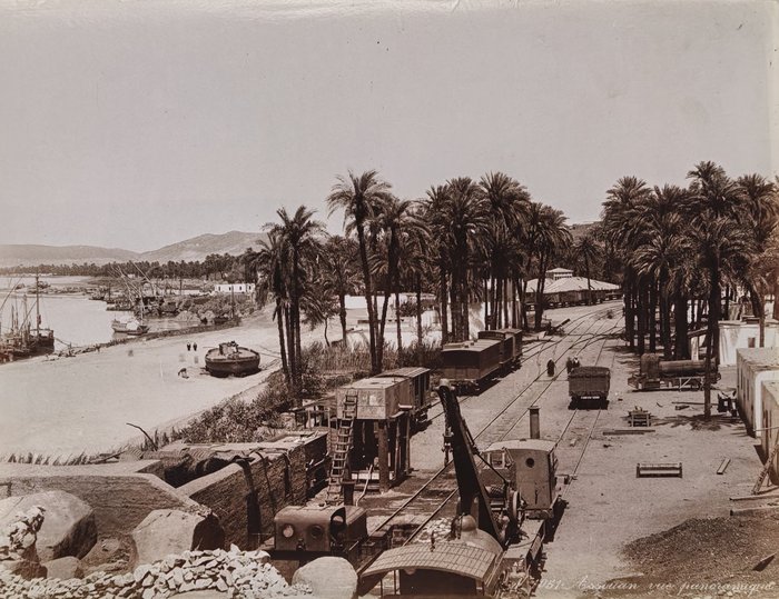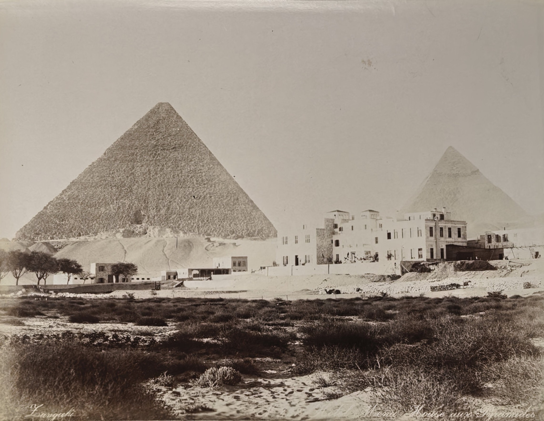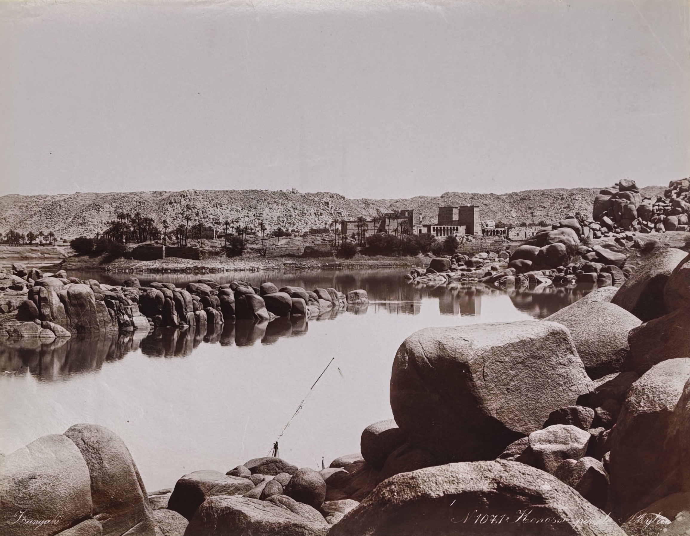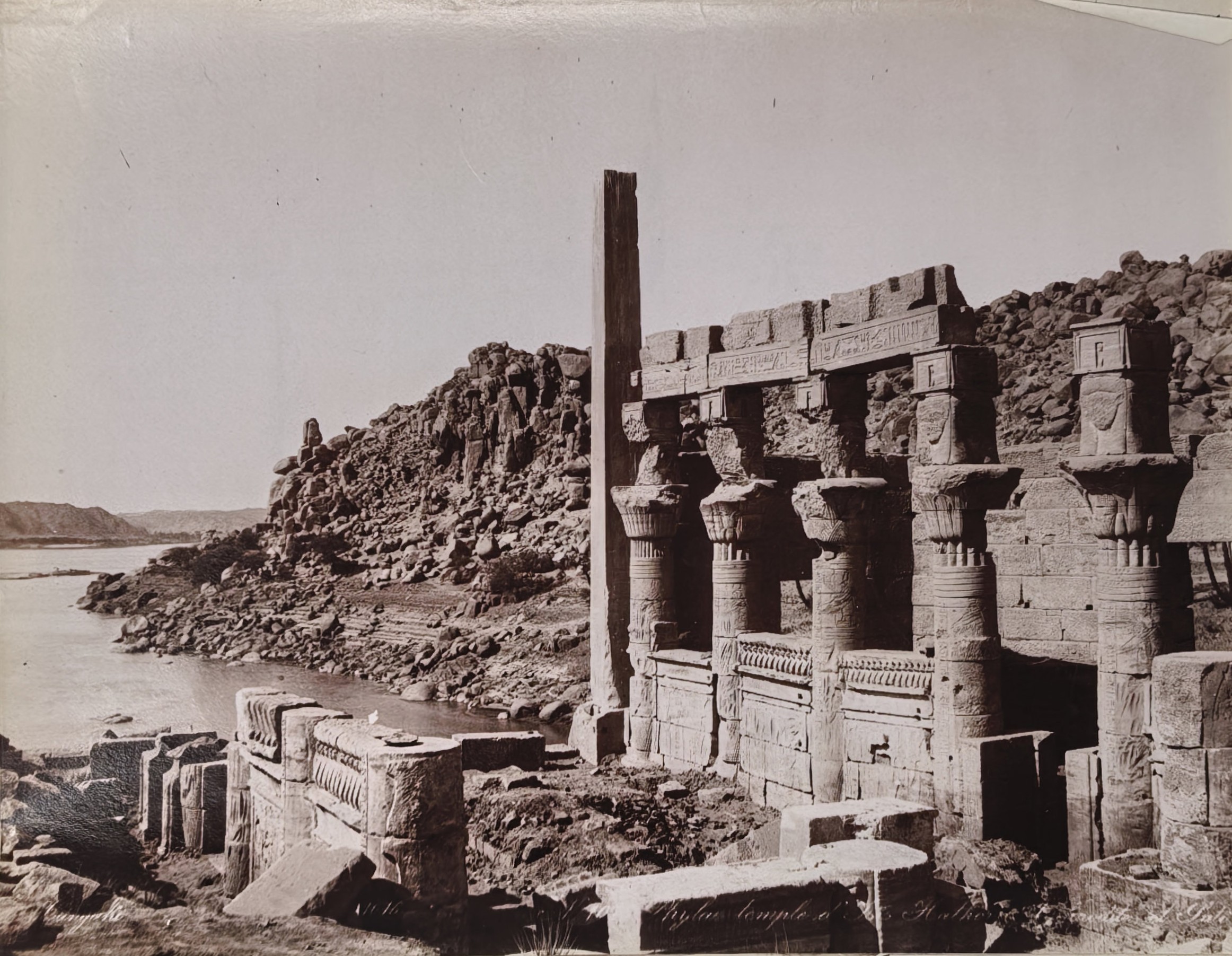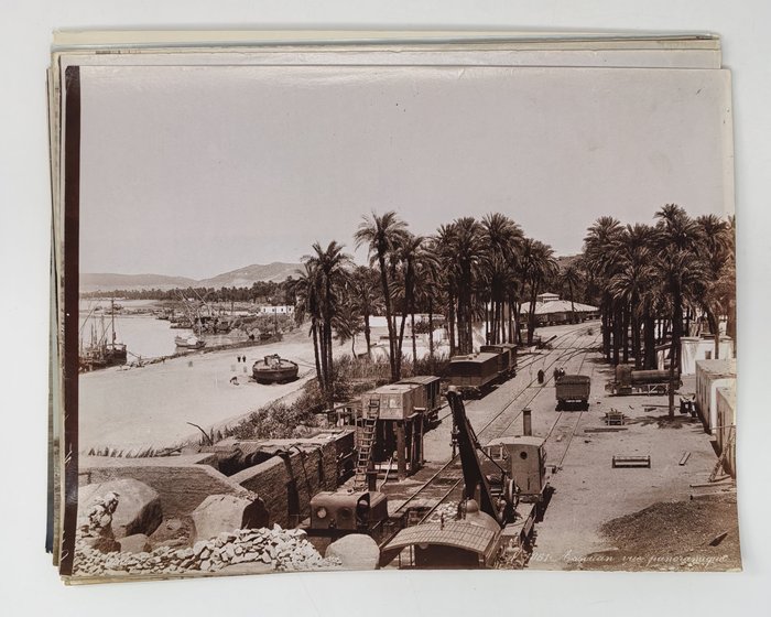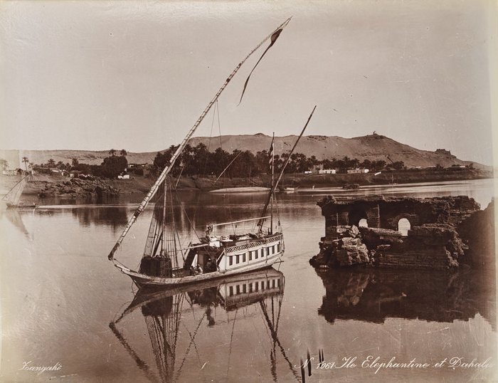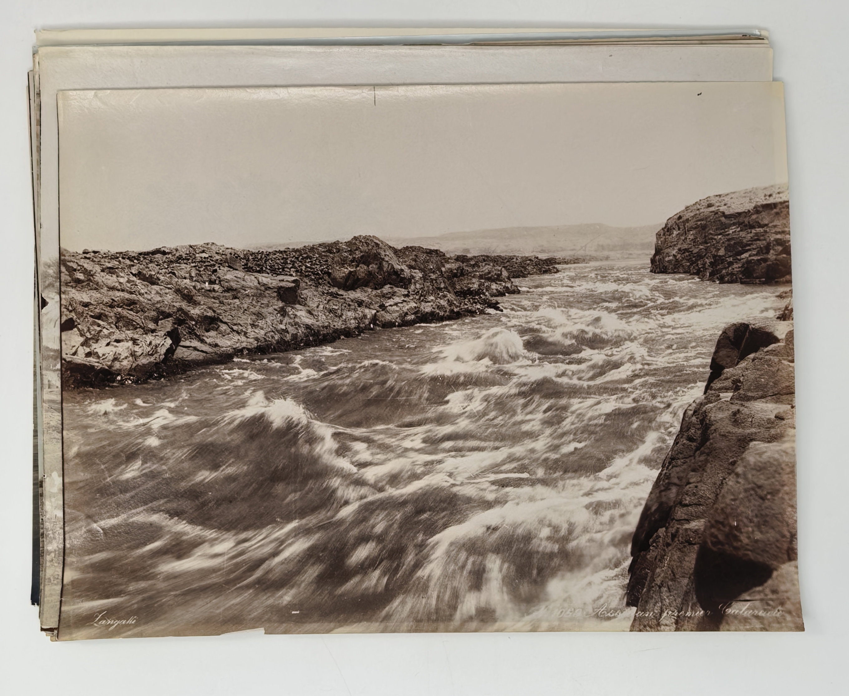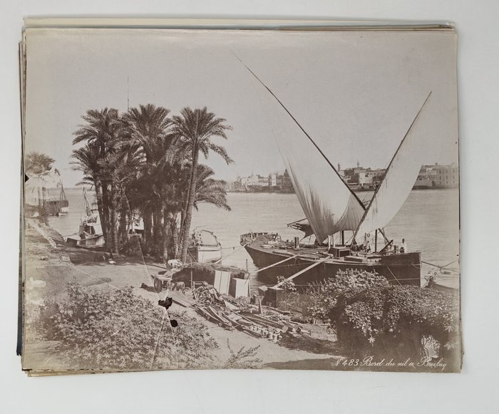 Interesting collection of early original albumen and gelatin silver photographs of Egypt from the late 19th–early 20th century, taken by the prominent local studios of Zangaki Brothers, Pappa Peridis, and Luigi Fiorillo. Twenty-two photos by the studio of Zangaki Brothers show Cairo (Citadel and Muhammad Ali Mosque, Citadel and nearby Arab village, the Nile at Bulaq, a street view), Aswan (the Nile and railway tracks with various machinery), Pyramids of Giza (general views with Mena House hotel, the Nile and palm groves or a small dam, a close-up view of the Great Pyramid), Philae Temple (general views taken from the north, Temple of Hathor), Karnak Temple (Great Hypostyle Hall), the First Cataract at Aswan, three views of the “Olga” dahabiya boat on the Nile (Swedish flag is visible, two locations are captioned – the Elephantine Island and Aswan), &c.