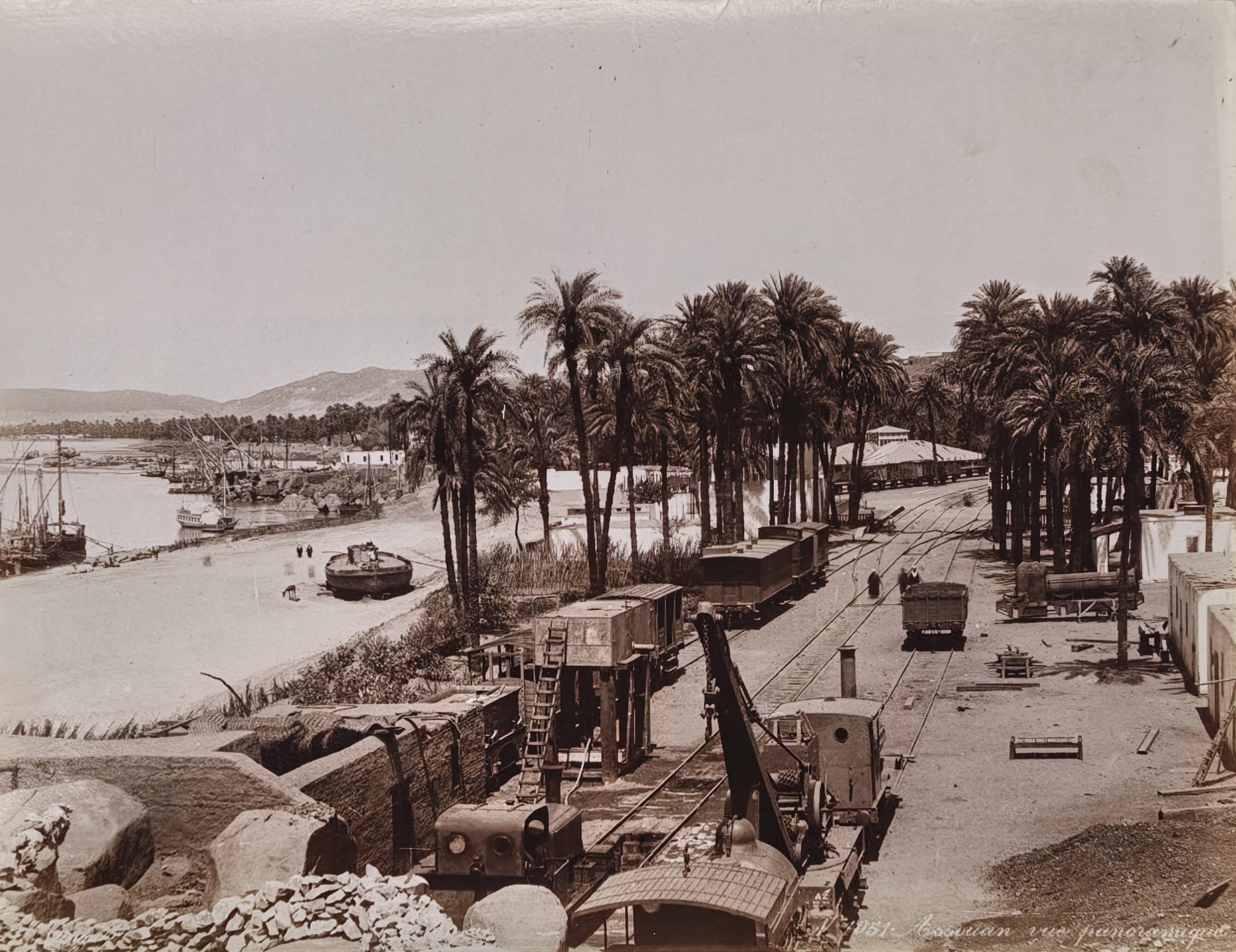 Two images by the Greek photographer Pappa Peridis depict the panoramic view of Cairo and the alley of destroyed sphinxes leading to the Pylon of Ptolemy III at the Karnak Temple. Other photographs include two views of the Philae Island and Temple – before and after it was flooded by the construction of the Aswan Low Dam in 1902 (the second image by Marquis & Fiorillo shows the scale of inundation by the raised level of the Nile), Cataract Hotel in Aswan (built in 1899) and a scene of an official celebration in a town on the river bank – most likely, Aswan (with visible flags of Great Britain and the Sultanate of Egypt).