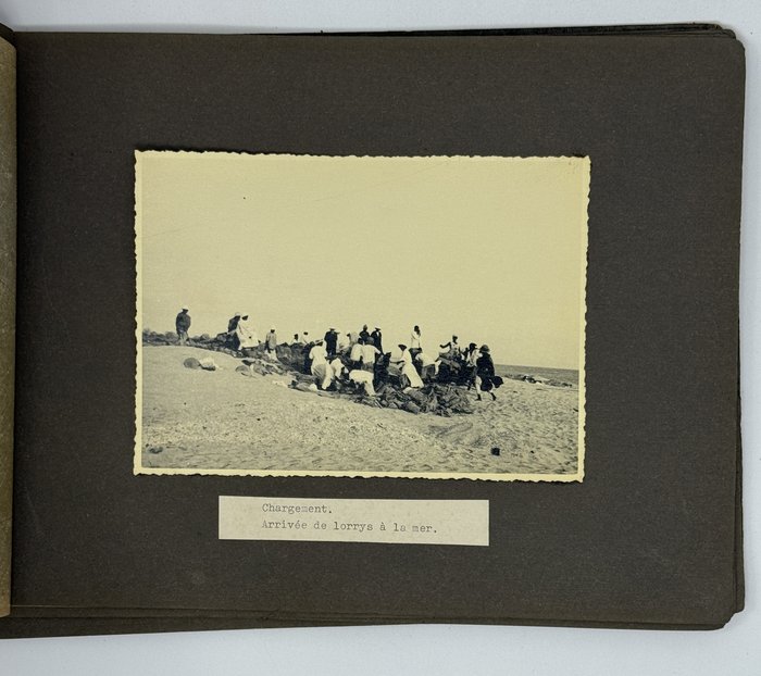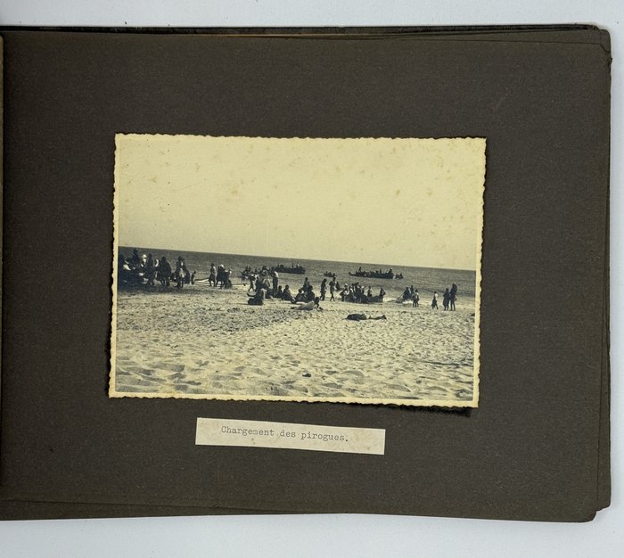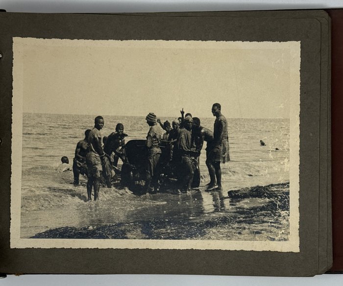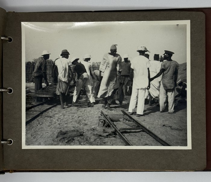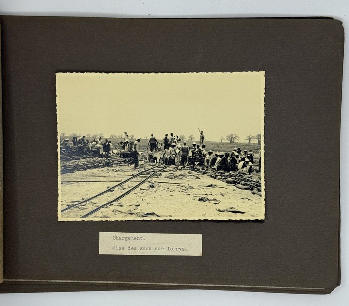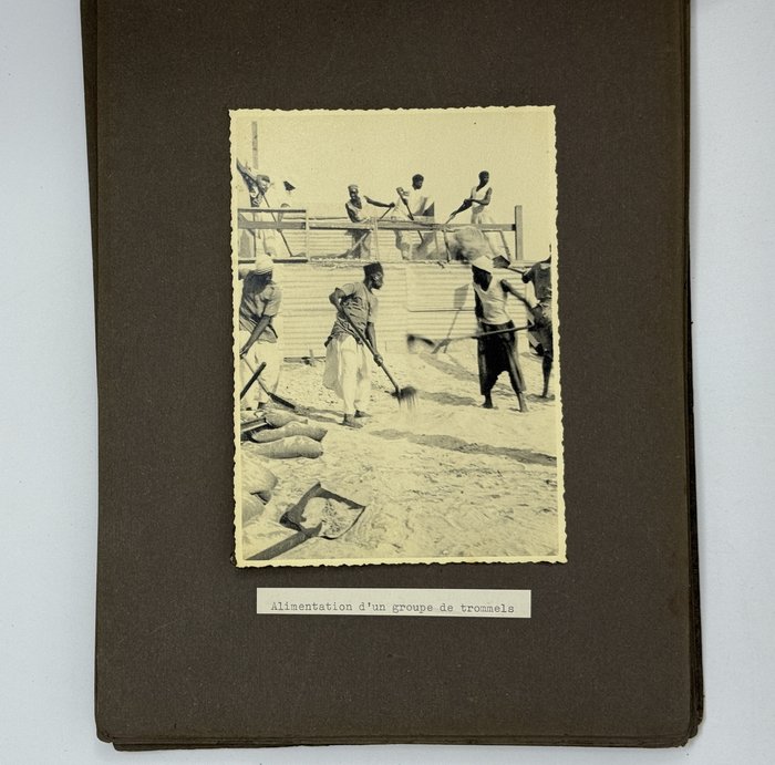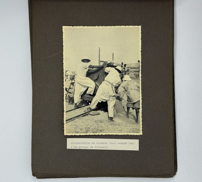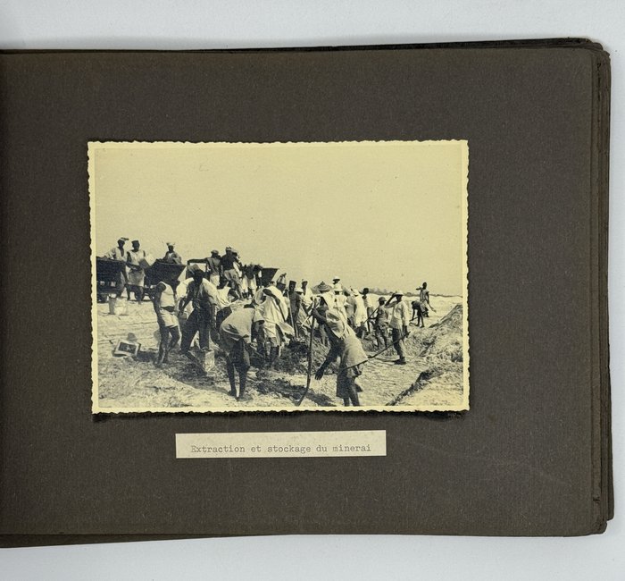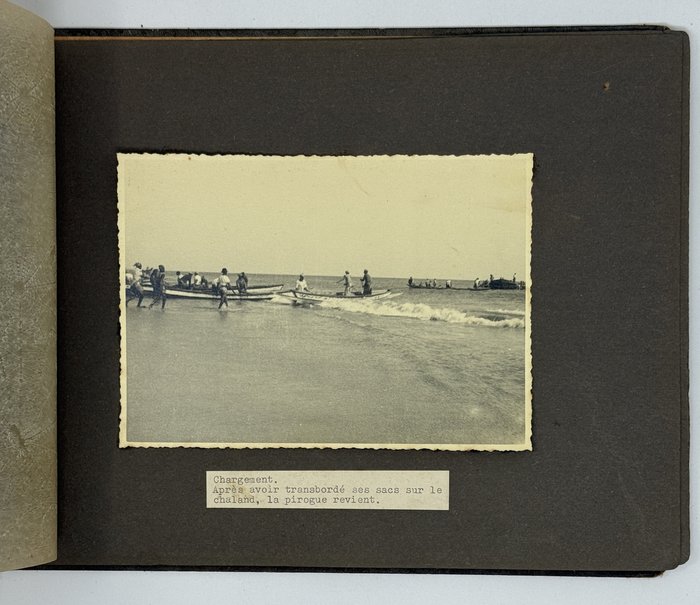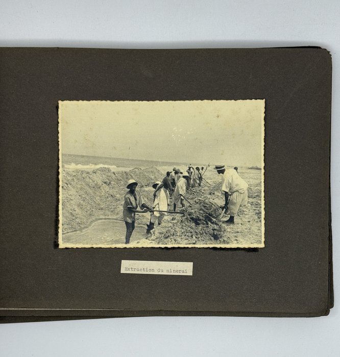 An interesting collection of early original gelatin silver photos, documenting organized beach sands mining operations in French West Africa in the 1930s – possibly, for gold or heavy minerals. The first album opens with a scene on a “prayer field,” taken during the first day of “Tabaski” (a West African name of Eid al-Adha, one of two main festivals in Islam). Two photos were taken during “prospecting” and show an automobile trying to move through an overgrown area and a “tornade pendant une prospection.” Other photos document the mining operations and show African workers digging the “minerai” (ore) sand, loading it into buckets and then onto mine carts, pushing the carts along a narrow-gauge rail line to the ore-drying and processing plant, and emptying the sand into trommel devices. There are also views of the loading area, workers filling sacks and putting them into rail carts, pushing them to the sea shore, loading the sacks into native pirogues, which in turn bring the cargo to “chalands” (barges), with the transportation steamer waiting at sea (visible in the background). The second album contains additional photos of an industrial building under construction, piles of ore and filled bags at the loading area, workers loading the pirogues, cleaning a transportation cart in the sea, &c. Overall an interesting collection of original photos documenting early beach sand mining operations in West Africa.