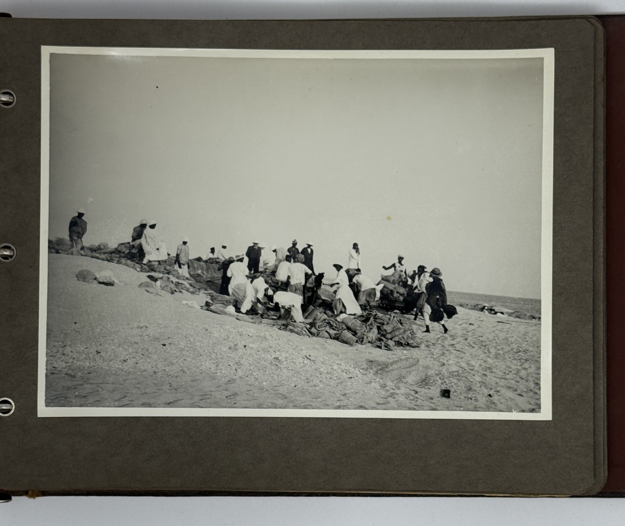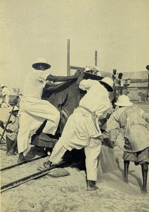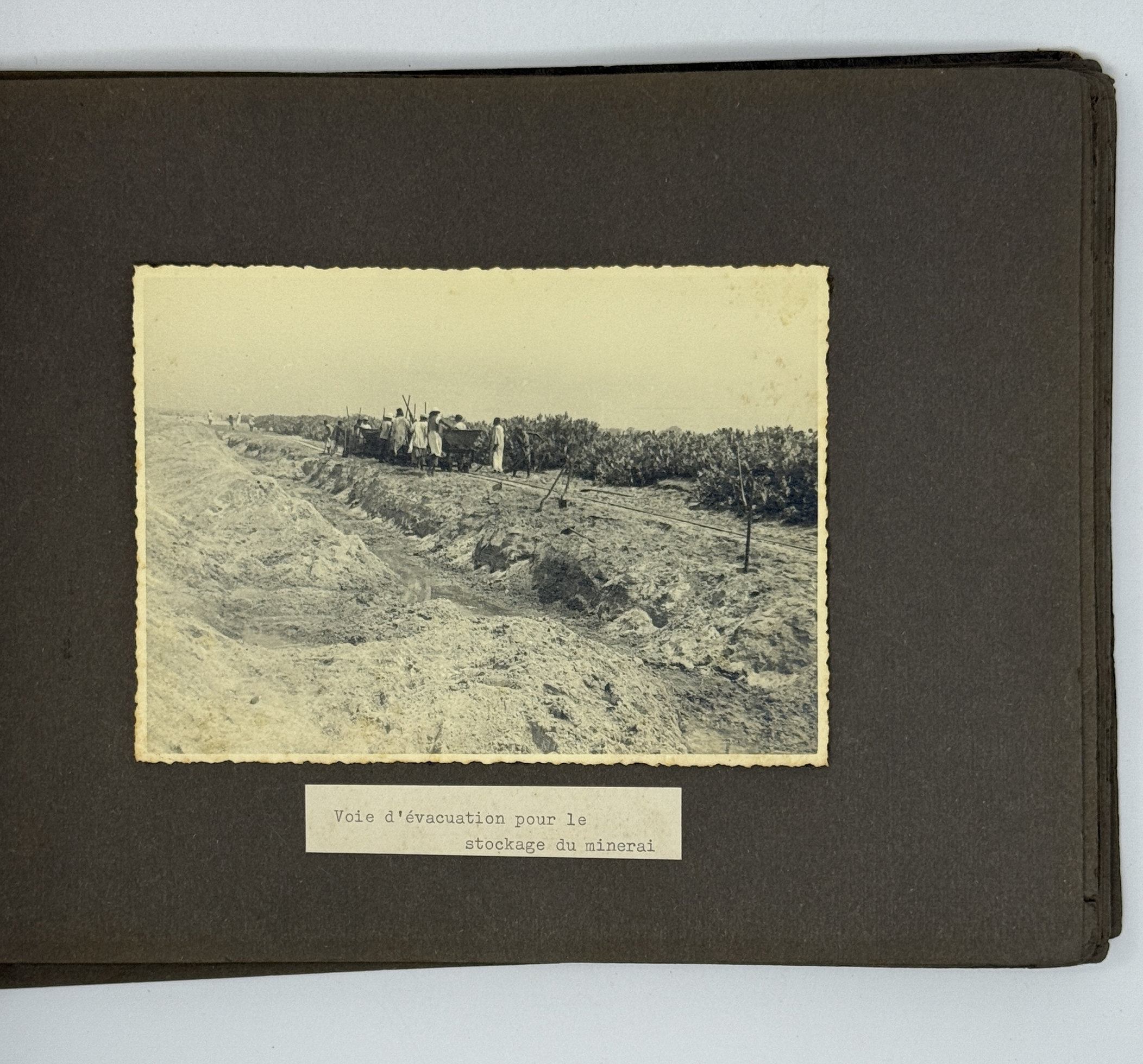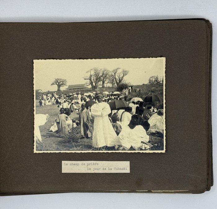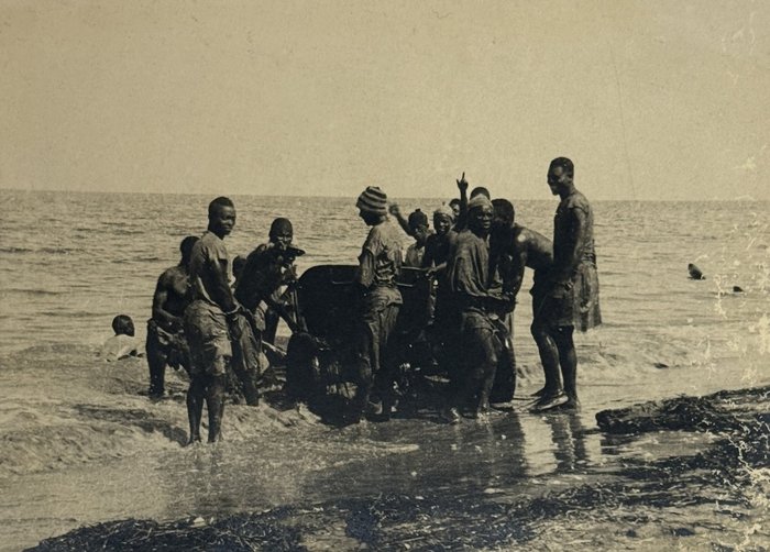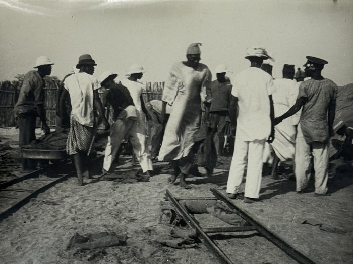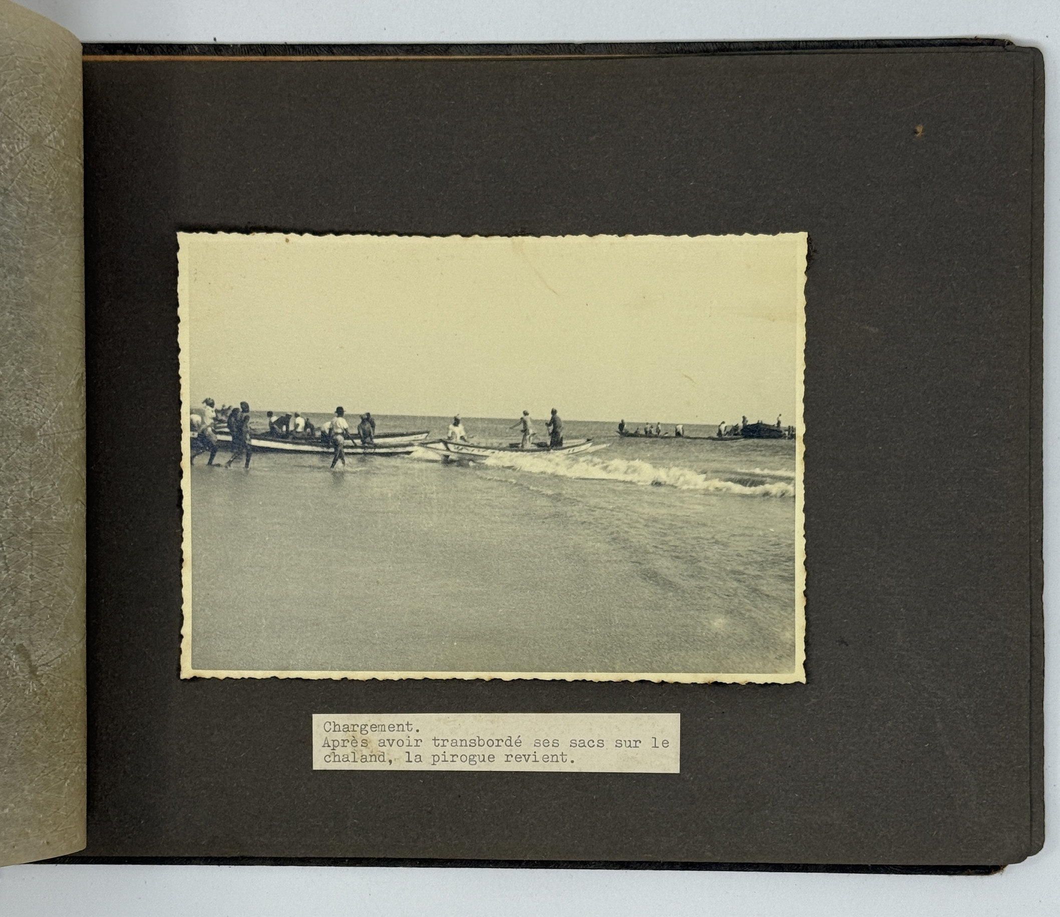 An interesting collection of early original gelatin silver photos, documenting organized beach sands mining operations in French West Africa in the 1930s – possibly, for gold or heavy minerals. The first album opens with a scene on a “prayer field,” taken during the first day of “Tabaski” (a West African name of Eid al-Adha, one of two main festivals in Islam). Two photos were taken during “prospecting” and show an automobile trying to move through an overgrown area and a “tornade pendant une prospection.” Other photos document the mining operations and show African workers digging the “minerai” (ore) sand, loading it into buckets and then onto mine carts, pushing the carts along a narrow-gauge rail line to the ore-drying and processing plant, and emptying the sand into trommel devices. There are also views of the loading area, workers filling sacks and putting them into rail carts, pushing them to the sea shore, loading the sacks into native pirogues, which in turn bring the cargo to “chalands” (barges), with the transportation steamer waiting at sea (visible in the background). The second album contains additional photos of an industrial building under construction, piles of ore and filled bags at the loading area, workers loading the pirogues, cleaning a transportation cart in the sea, &c. Overall an interesting collection of original photos documenting early beach sand mining operations in West Africa.