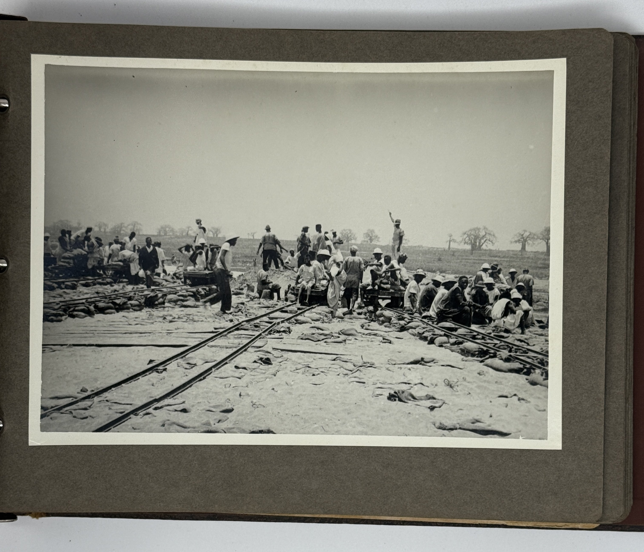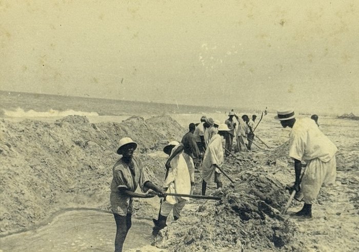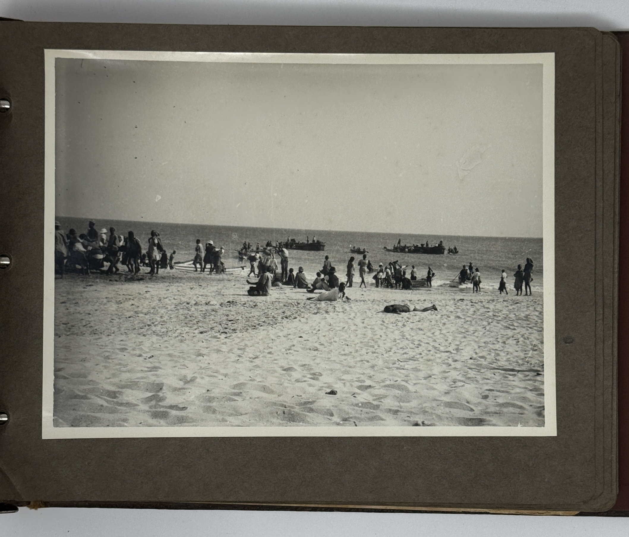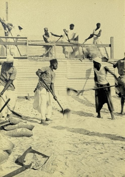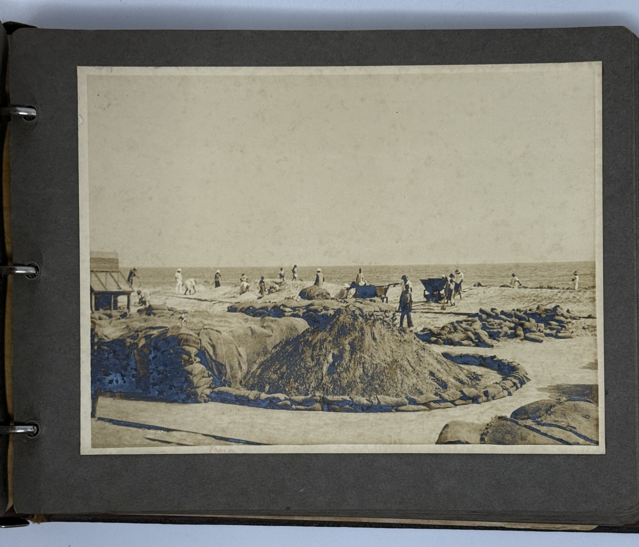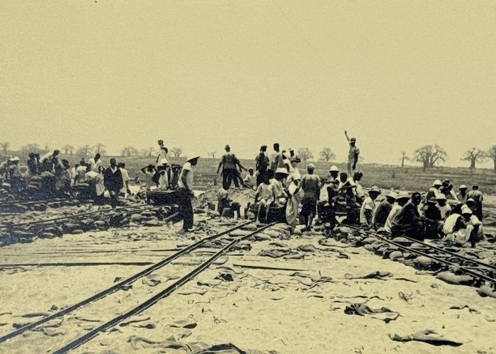 An interesting collection of early original gelatin silver photos, documenting organized beach sands mining operations in French West Africa in the 1930s – possibly, for gold or heavy minerals. The first album opens with a scene on a “prayer field,” taken during the first day of “Tabaski” (a West African name of Eid al-Adha, one of two main festivals in Islam). Two photos were taken during “prospecting” and show an automobile trying to move through an overgrown area and a “tornade pendant une prospection.” Other photos document the mining operations and show African workers digging the “minerai” (ore) sand, loading it into buckets and then onto mine carts, pushing the carts along a narrow-gauge rail line to the ore-drying and processing plant, and emptying the sand into trommel devices. There are also views of the loading area, workers filling sacks and putting them into rail carts, pushing them to the sea shore, loading the sacks into native pirogues, which in turn bring the cargo to “chalands” (barges), with the transportation steamer waiting at sea (visible in the background). The second album contains additional photos of an industrial building under construction, piles of ore and filled bags at the loading area, workers loading the pirogues, cleaning a transportation cart in the sea, &c. Overall an interesting collection of original photos documenting early beach sand mining operations in West Africa.