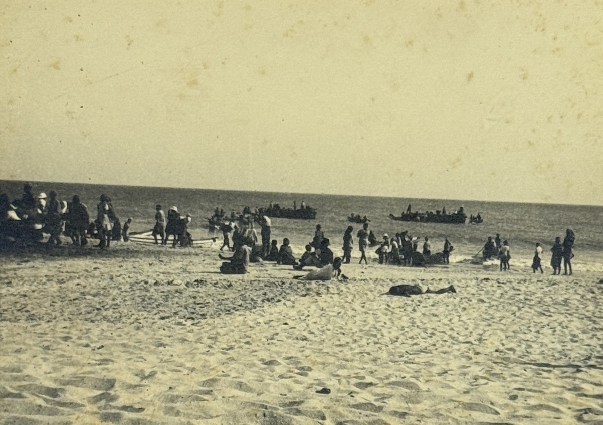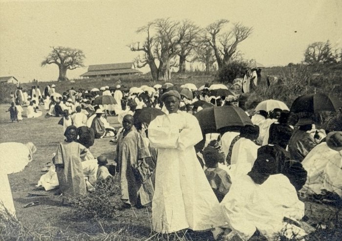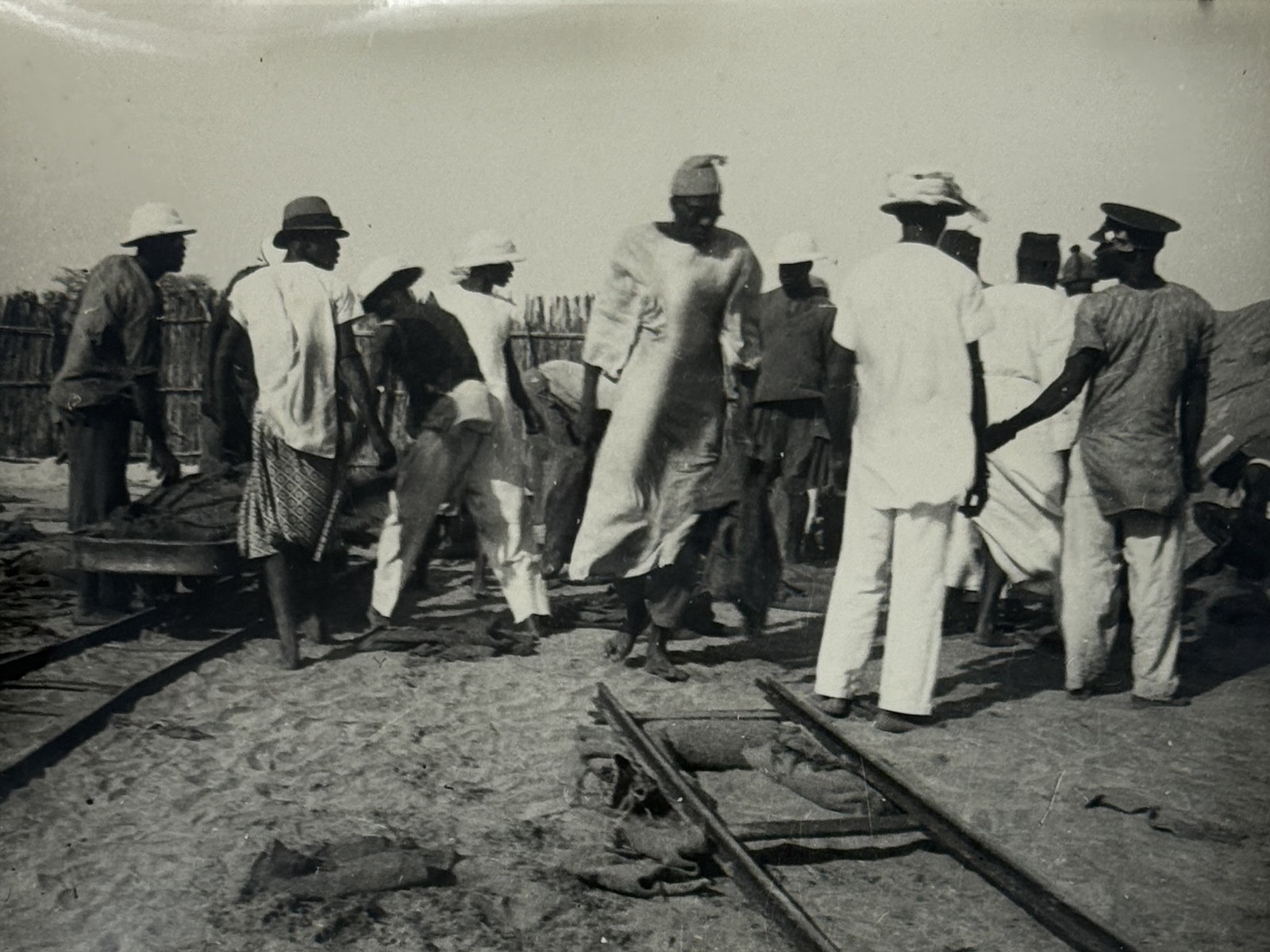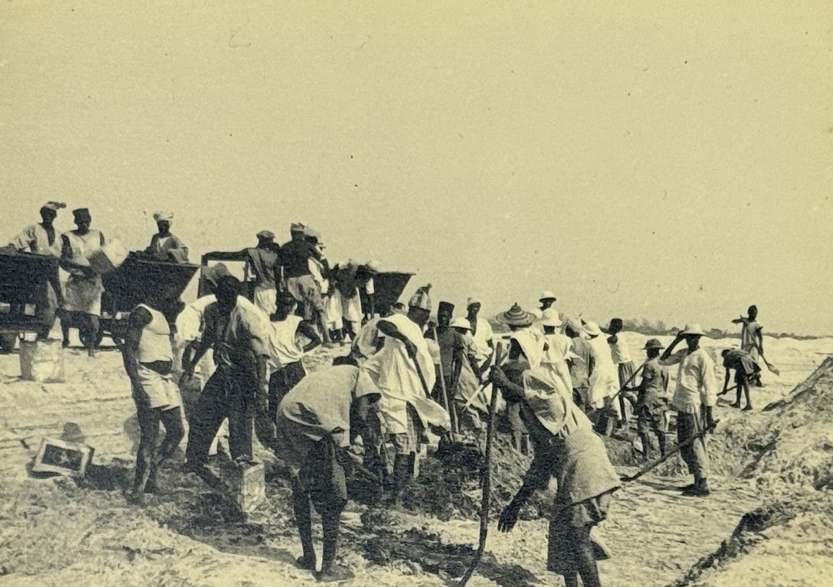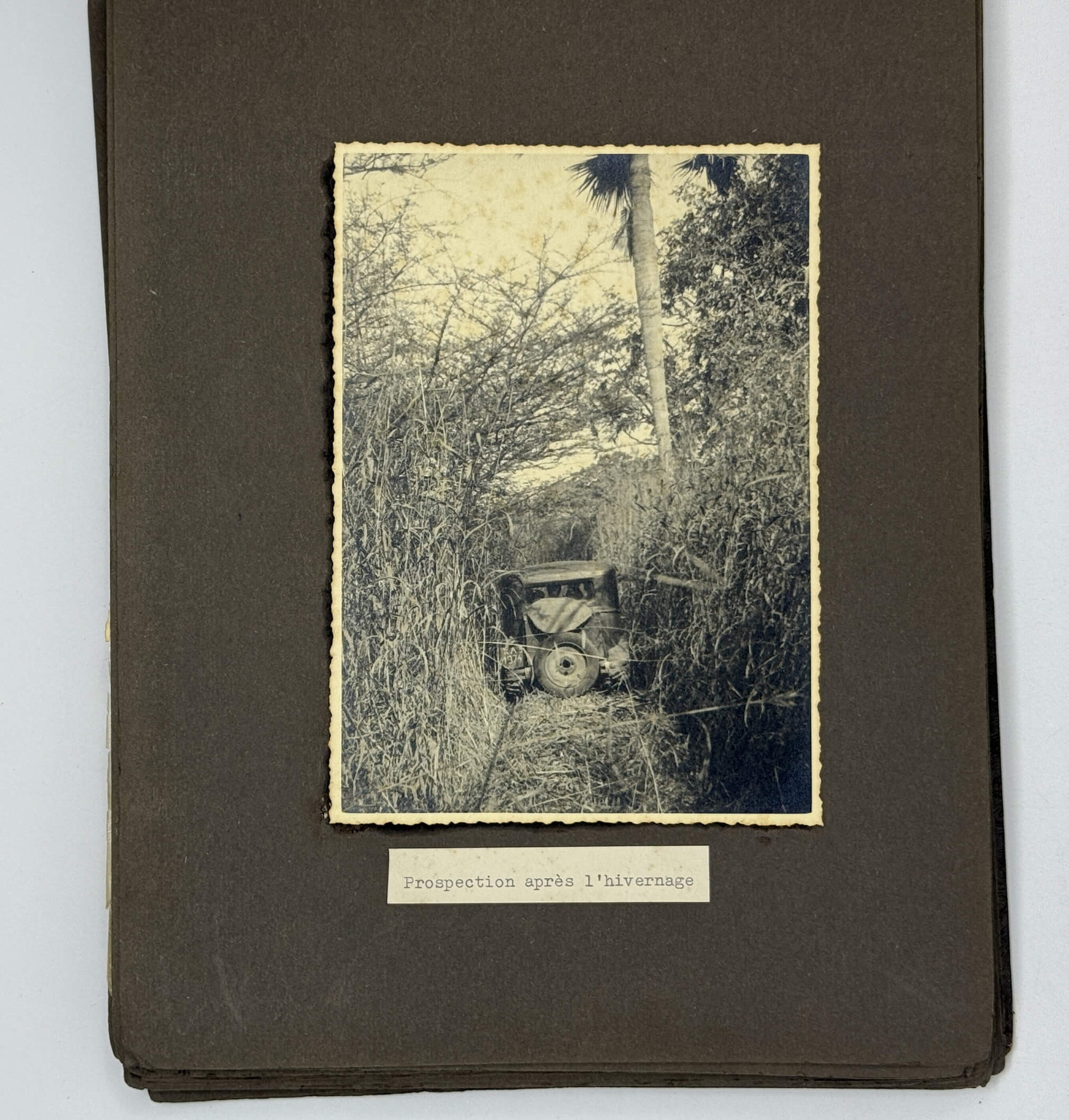 An interesting collection of early original gelatin silver photos, documenting organized beach sands mining operations in French West Africa in the 1930s – possibly, for gold or heavy minerals. The first album opens with a scene on a “prayer field,” taken during the first day of “Tabaski” (a West African name of Eid al-Adha, one of two main festivals in Islam). Two photos were taken during “prospecting” and show an automobile trying to move through an overgrown area and a “tornade pendant une prospection.” Other photos document the mining operations and show African workers digging the “minerai” (ore) sand, loading it into buckets and then onto mine carts, pushing the carts along a narrow-gauge rail line to the ore-drying and processing plant, and emptying the sand into trommel devices. There are also views of the loading area, workers filling sacks and putting them into rail carts, pushing them to the sea shore, loading the sacks into native pirogues, which in turn bring the cargo to “chalands” (barges), with the transportation steamer waiting at sea (visible in the background). The second album contains additional photos of an industrial building under construction, piles of ore and filled bags at the loading area, workers loading the pirogues, cleaning a transportation cart in the sea, &c. Overall an interesting collection of original photos documenting early beach sand mining operations in West Africa.