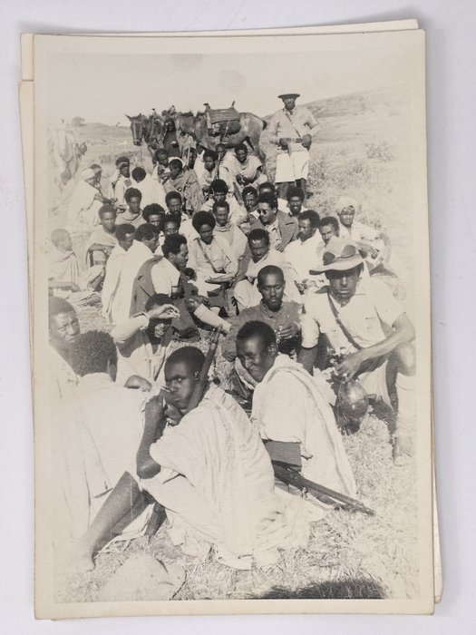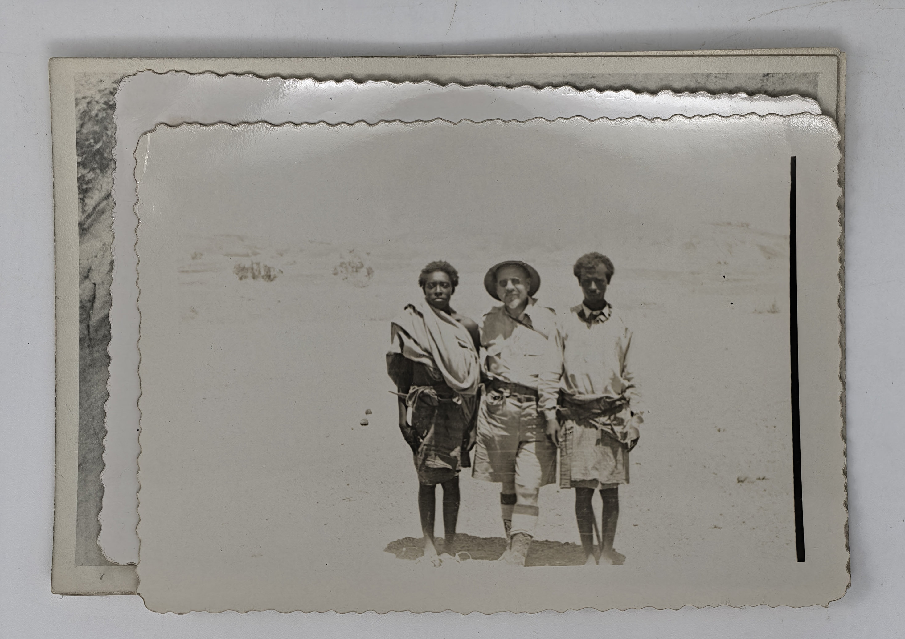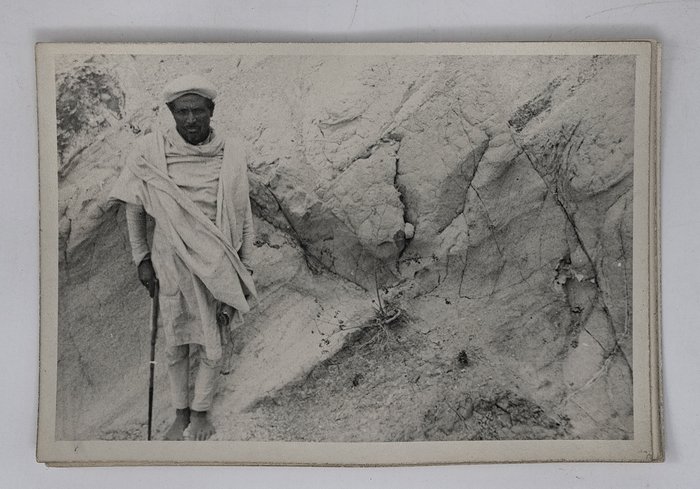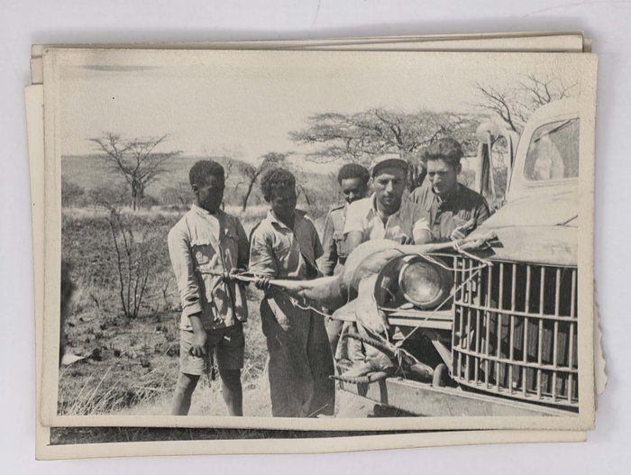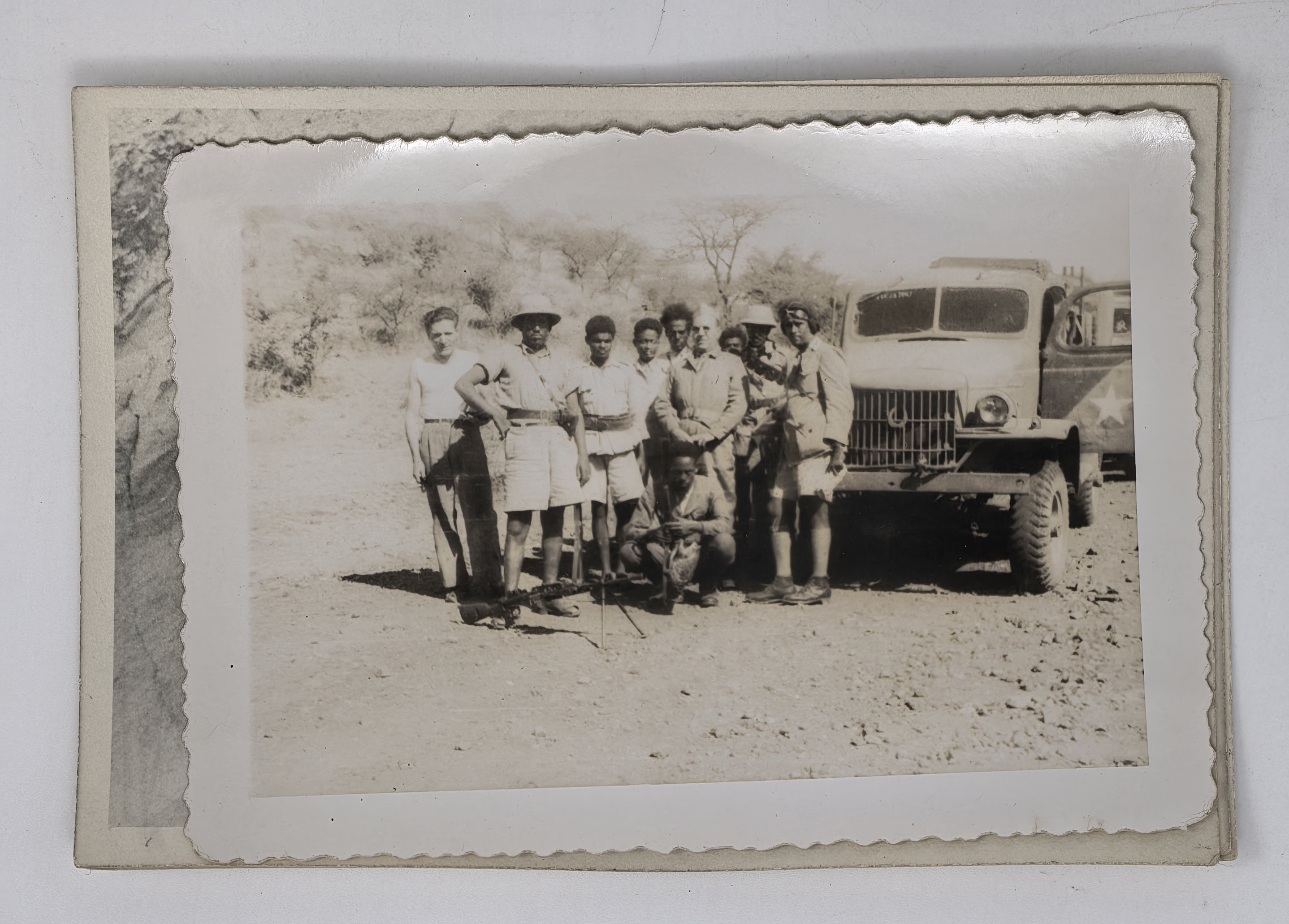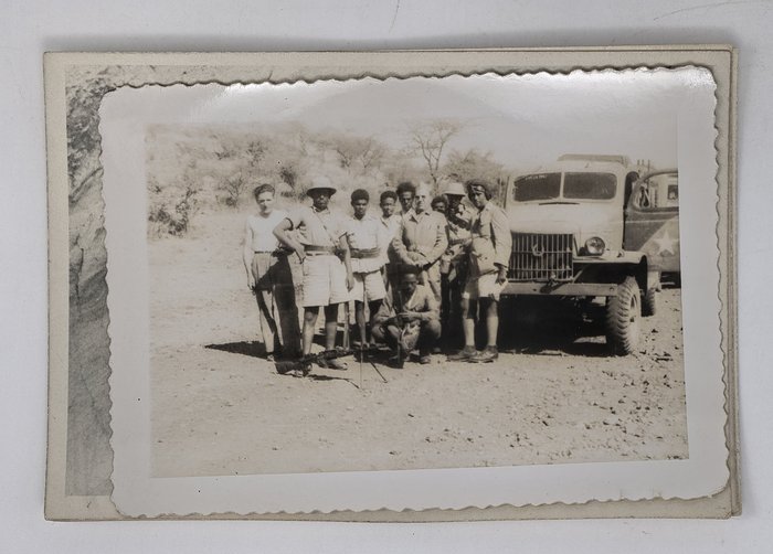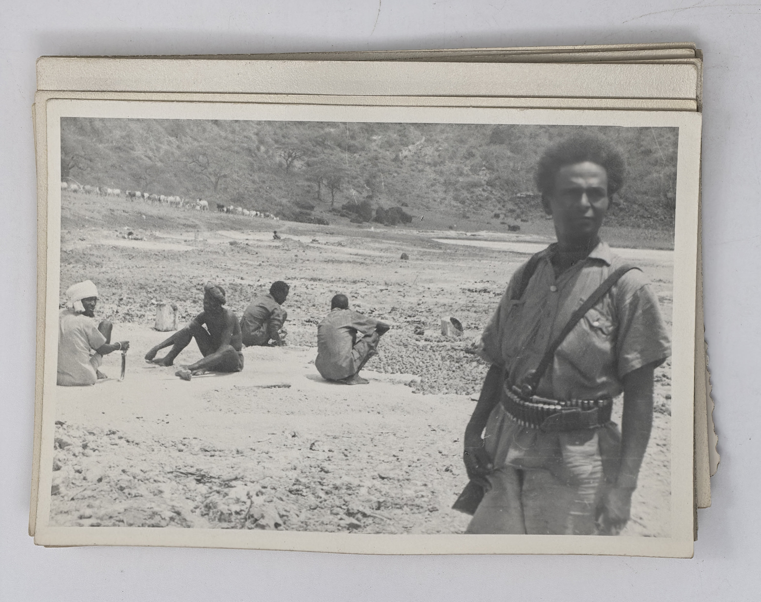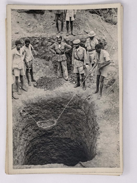 Interesting extensive collection of 223 original gelatin silver snapshot photos, taken during a mining survey expedition (possibly, prospecting for gold) in Italian East Africa (modern-day Eritrea and Ethiopia) in the late 1930s. Possibly set up after the Second Italo-Ethiopian War (1935-1937), the photos follow a party consisting of a European civilian (likely, the Italian expedition leader), several military officers, native soldiers and military trucks, driving across East African landscapes, crossing bridges, posing in front of various geological rock formations or caves, looking for samples in streams, &c. Over a dozen close-up images show a geologist’s hammer, taken in the field next to different rock and earth formations. Four photos show the scenes with Africans performing artisanal gold panning in the streams; one image depicts miners operating a sluice box. There are also several photos of damaged or destroyed bridges and remnants of a tank in a field (likely, the echo of the Second Italo-Ethiopian War). Other photos show East African mountains and valleys, rivers, forests, roads, bridges, villages, cattle herds, native people, &c. There are also views of the Obelisk of Axum and Ethiopian megalithic stellae (possibly, in Tuto Fela, Gedeo Zone of Ethiopia), a military memorial with the Italian fascist eagle emblem and sign “Direzione Lavori […?] Eritrea,” a gravestone for “Morts pour la Belgique,” two Italian modernist buildings &c. Overall, an interesting extensive collection of original snapshot photos of mineral surveys in Ethiopia and Eritrea during the Italian occupation in the 1930s.