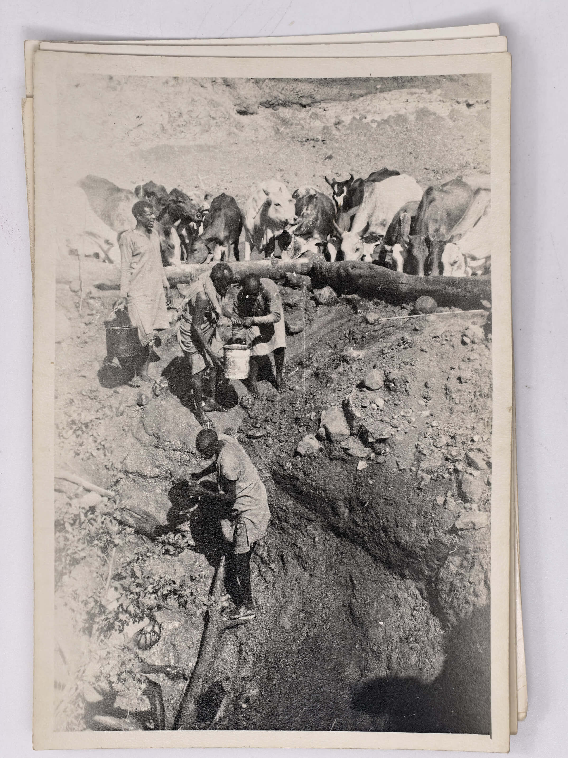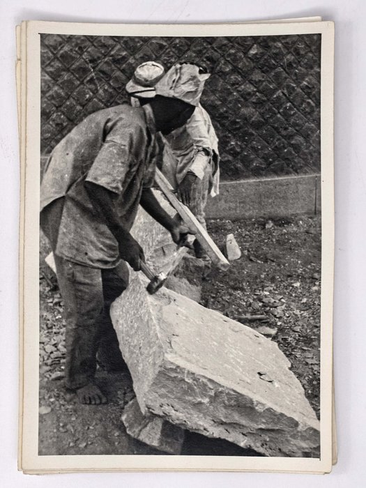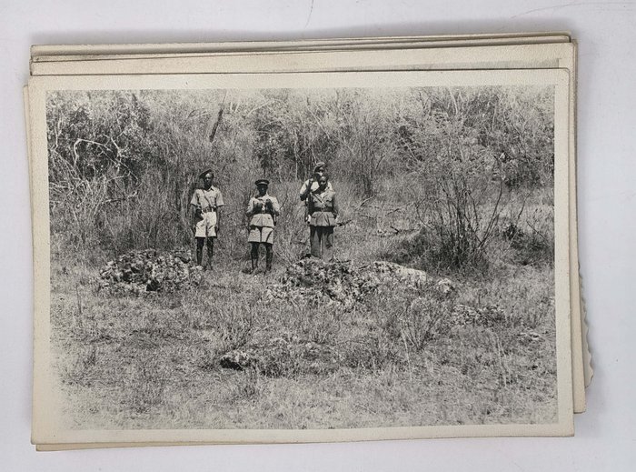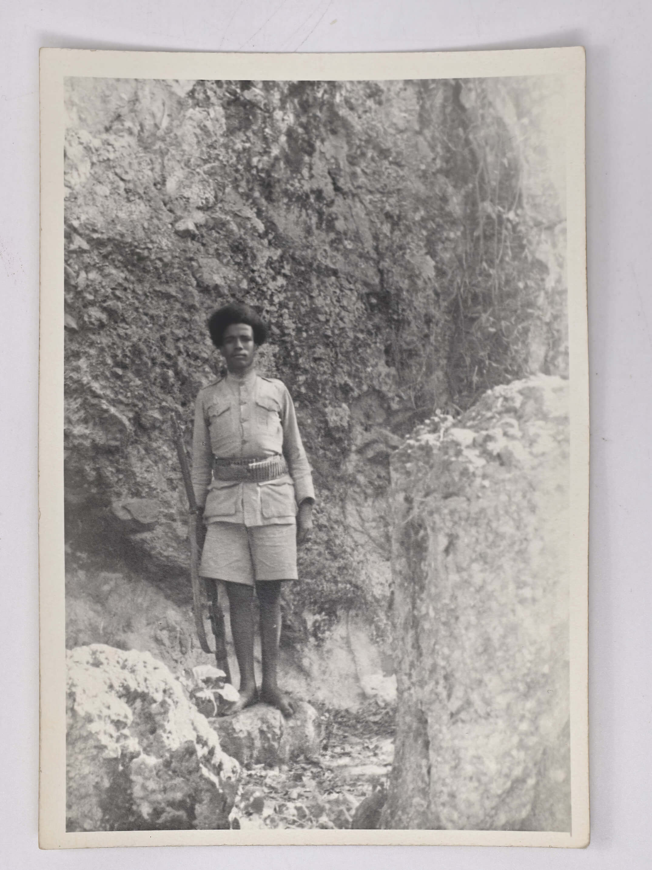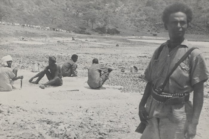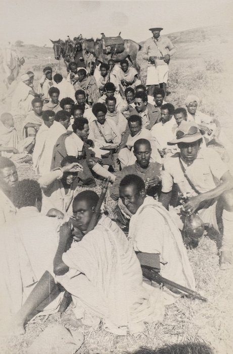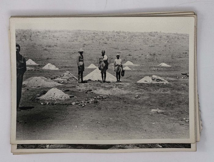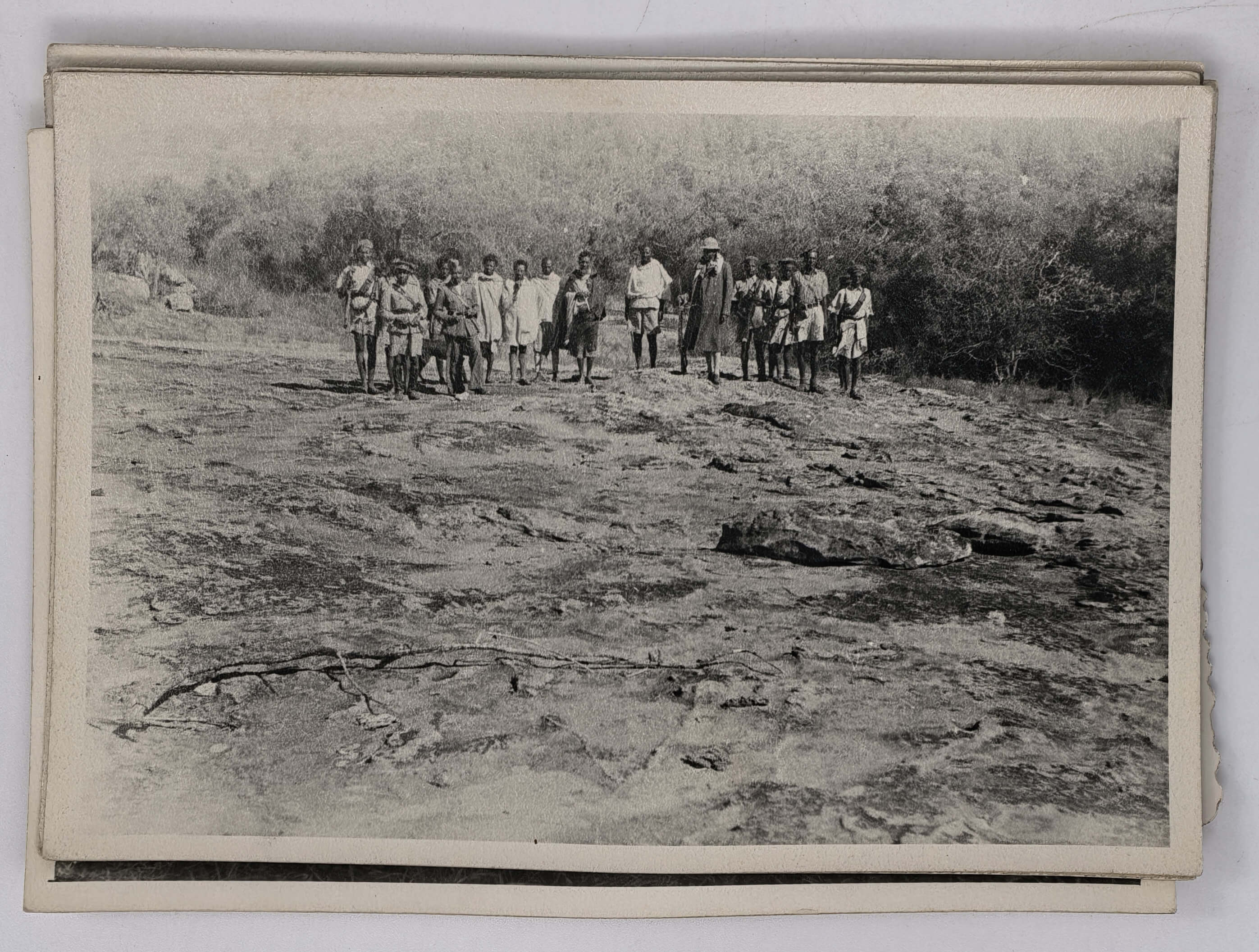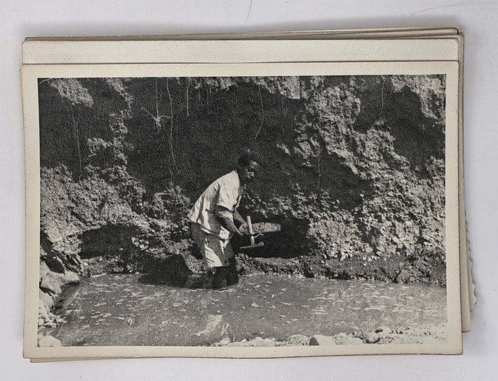 Interesting extensive collection of 223 original gelatin silver snapshot photos, taken during a mining survey expedition (possibly, prospecting for gold) in Italian East Africa (modern-day Eritrea and Ethiopia) in the late 1930s. Possibly set up after the Second Italo-Ethiopian War (1935-1937), the photos follow a party consisting of a European civilian (likely, the Italian expedition leader), several military officers, native soldiers and military trucks, driving across East African landscapes, crossing bridges, posing in front of various geological rock formations or caves, looking for samples in streams, &c. Over a dozen close-up images show a geologist’s hammer, taken in the field next to different rock and earth formations. Four photos show the scenes with Africans performing artisanal gold panning in the streams; one image depicts miners operating a sluice box. There are also several photos of damaged or destroyed bridges and remnants of a tank in a field (likely, the echo of the Second Italo-Ethiopian War). Other photos show East African mountains and valleys, rivers, forests, roads, bridges, villages, cattle herds, native people, &c. There are also views of the Obelisk of Axum and Ethiopian megalithic stellae (possibly, in Tuto Fela, Gedeo Zone of Ethiopia), a military memorial with the Italian fascist eagle emblem and sign “Direzione Lavori […?] Eritrea,” a gravestone for “Morts pour la Belgique,” two Italian modernist buildings &c. Overall, an interesting extensive collection of original snapshot photos of mineral surveys in Ethiopia and Eritrea during the Italian occupation in the 1930s.