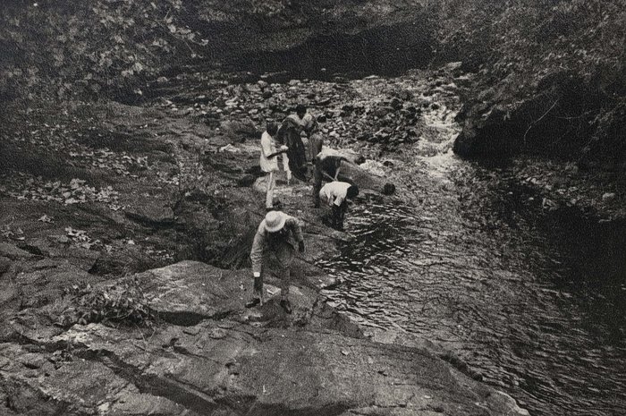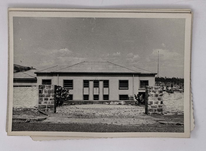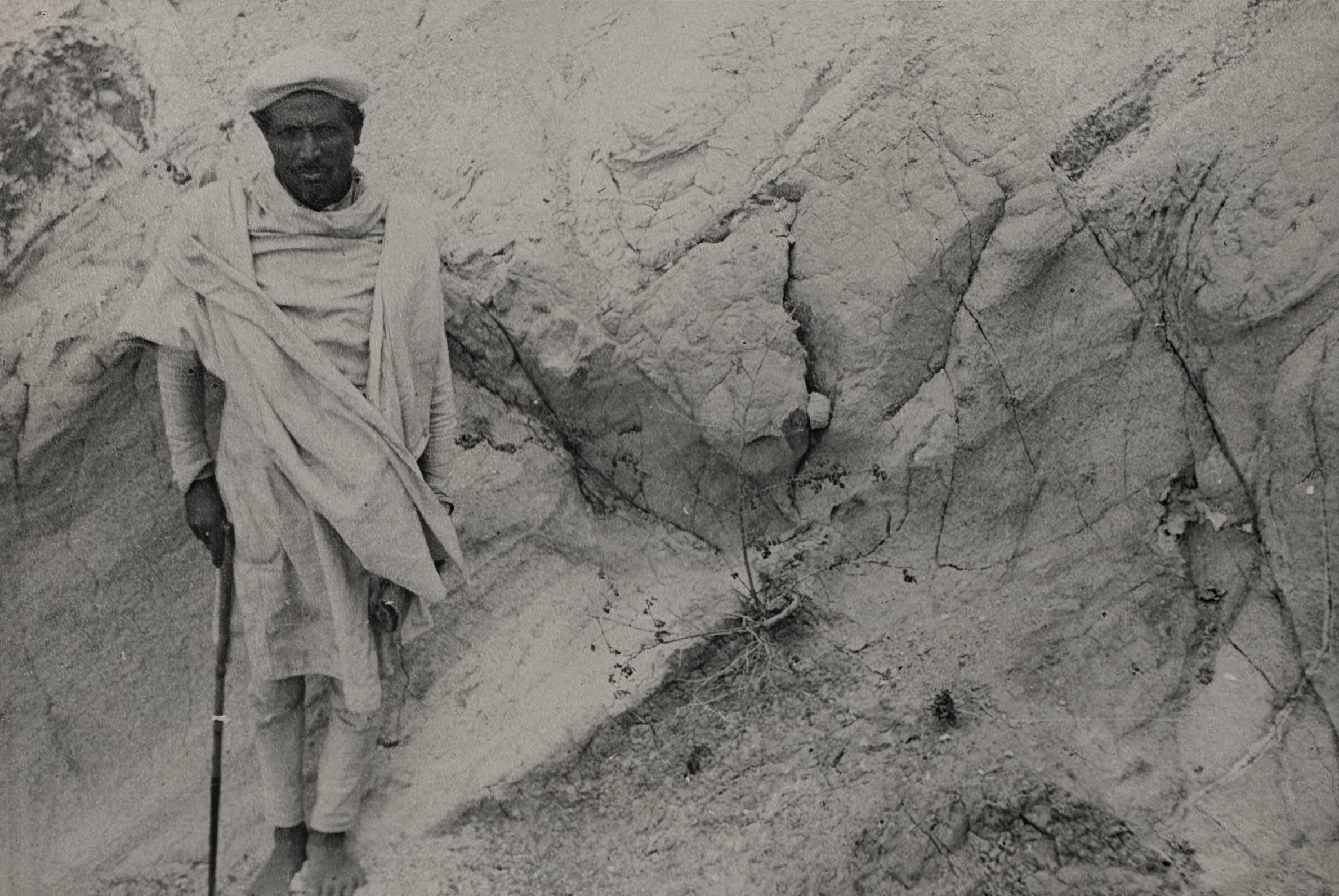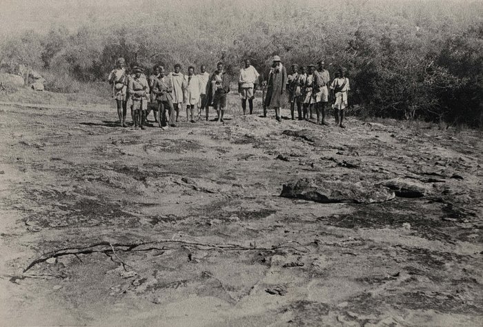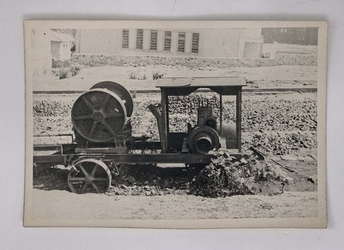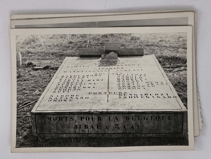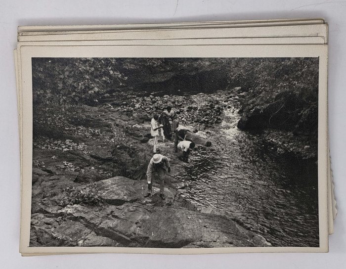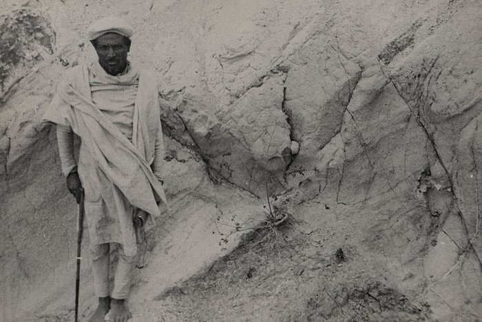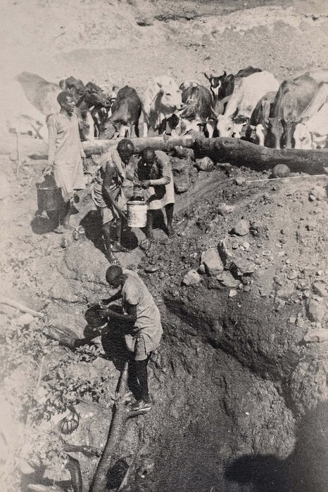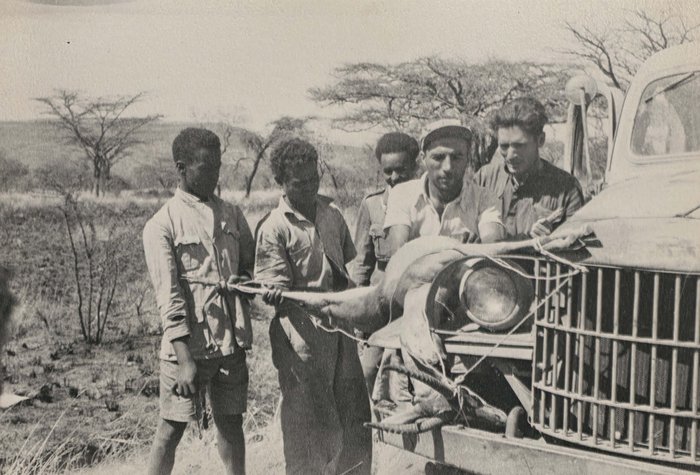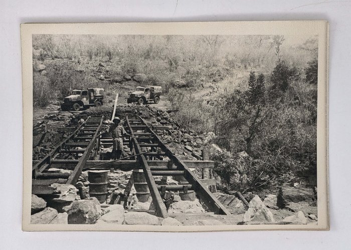 Interesting extensive collection of 223 original gelatin silver snapshot photos, taken during a mining survey expedition (possibly, prospecting for gold) in Italian East Africa (modern-day Eritrea and Ethiopia) in the late 1930s. Possibly set up after the Second Italo-Ethiopian War (1935-1937), the photos follow a party consisting of a European civilian (likely, the Italian expedition leader), several military officers, native soldiers and military trucks, driving across East African landscapes, crossing bridges, posing in front of various geological rock formations or caves, looking for samples in streams, &c. Over a dozen close-up images show a geologist’s hammer, taken in the field next to different rock and earth formations. Four photos show the scenes with Africans performing artisanal gold panning in the streams; one image depicts miners operating a sluice box. There are also several photos of damaged or destroyed bridges and remnants of a tank in a field (likely, the echo of the Second Italo-Ethiopian War). Other photos show East African mountains and valleys, rivers, forests, roads, bridges, villages, cattle herds, native people, &c. There are also views of the Obelisk of Axum and Ethiopian megalithic stellae (possibly, in Tuto Fela, Gedeo Zone of Ethiopia), a military memorial with the Italian fascist eagle emblem and sign “Direzione Lavori […?] Eritrea,” a gravestone for “Morts pour la Belgique,” two Italian modernist buildings &c. Overall, an interesting extensive collection of original snapshot photos of mineral surveys in Ethiopia and Eritrea during the Italian occupation in the 1930s.