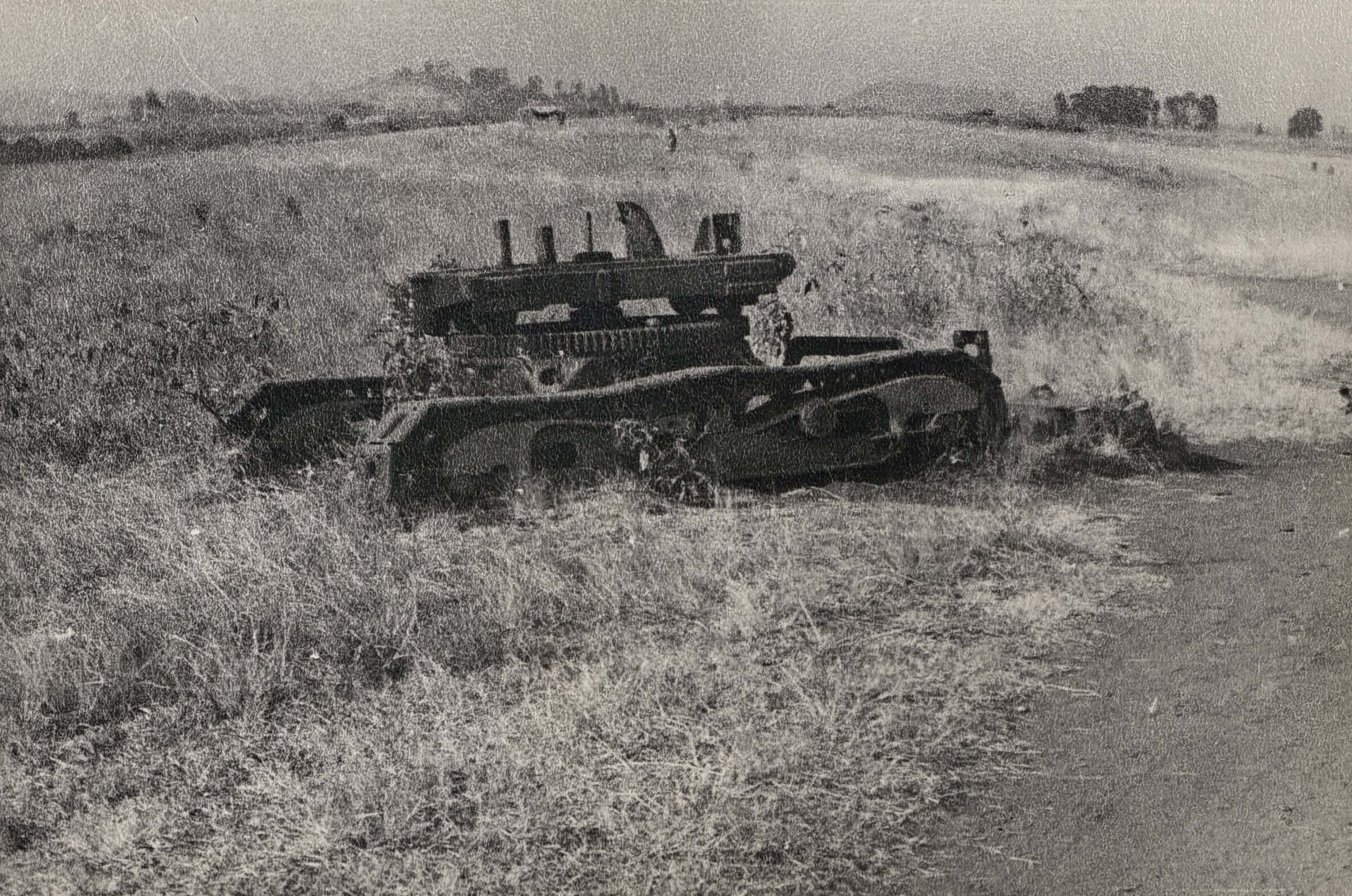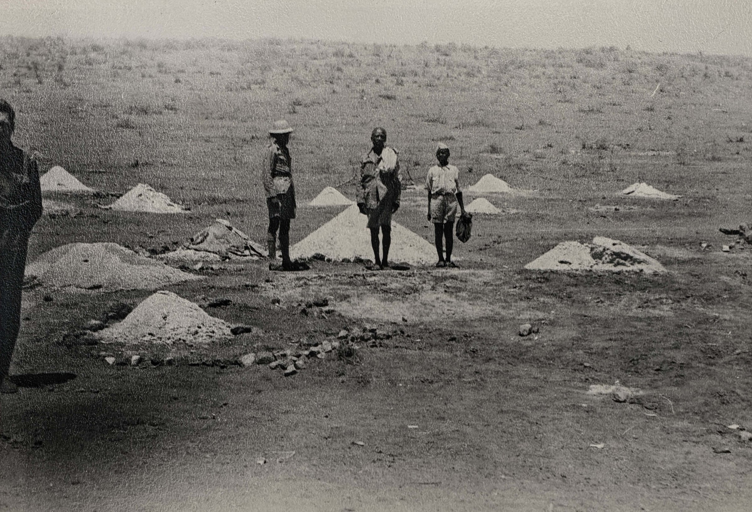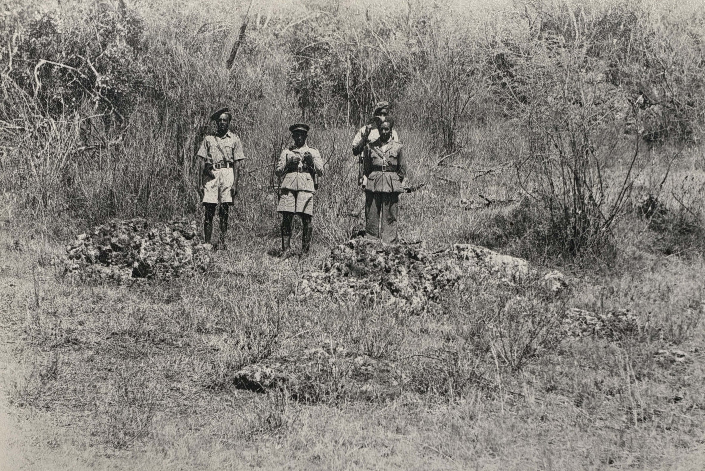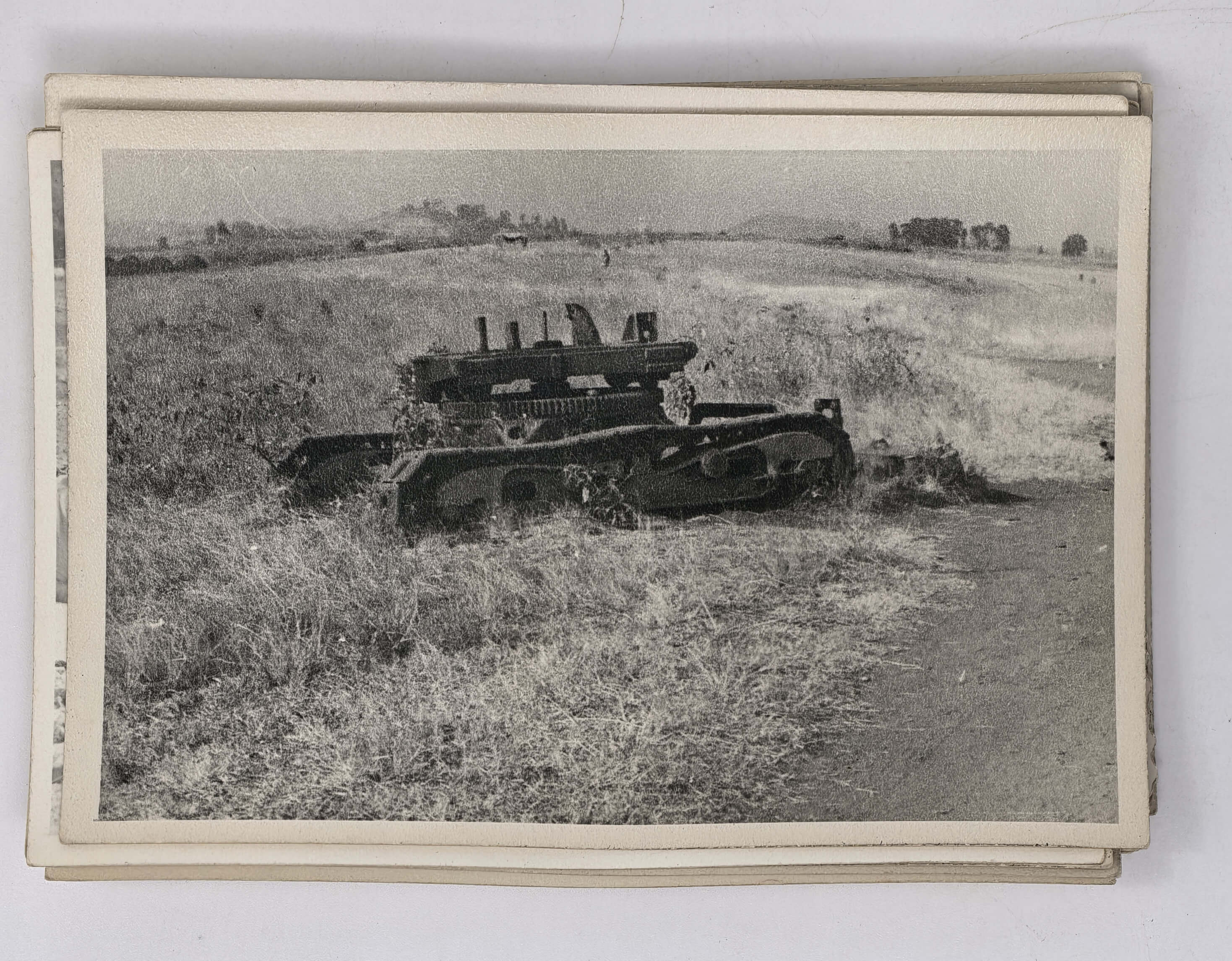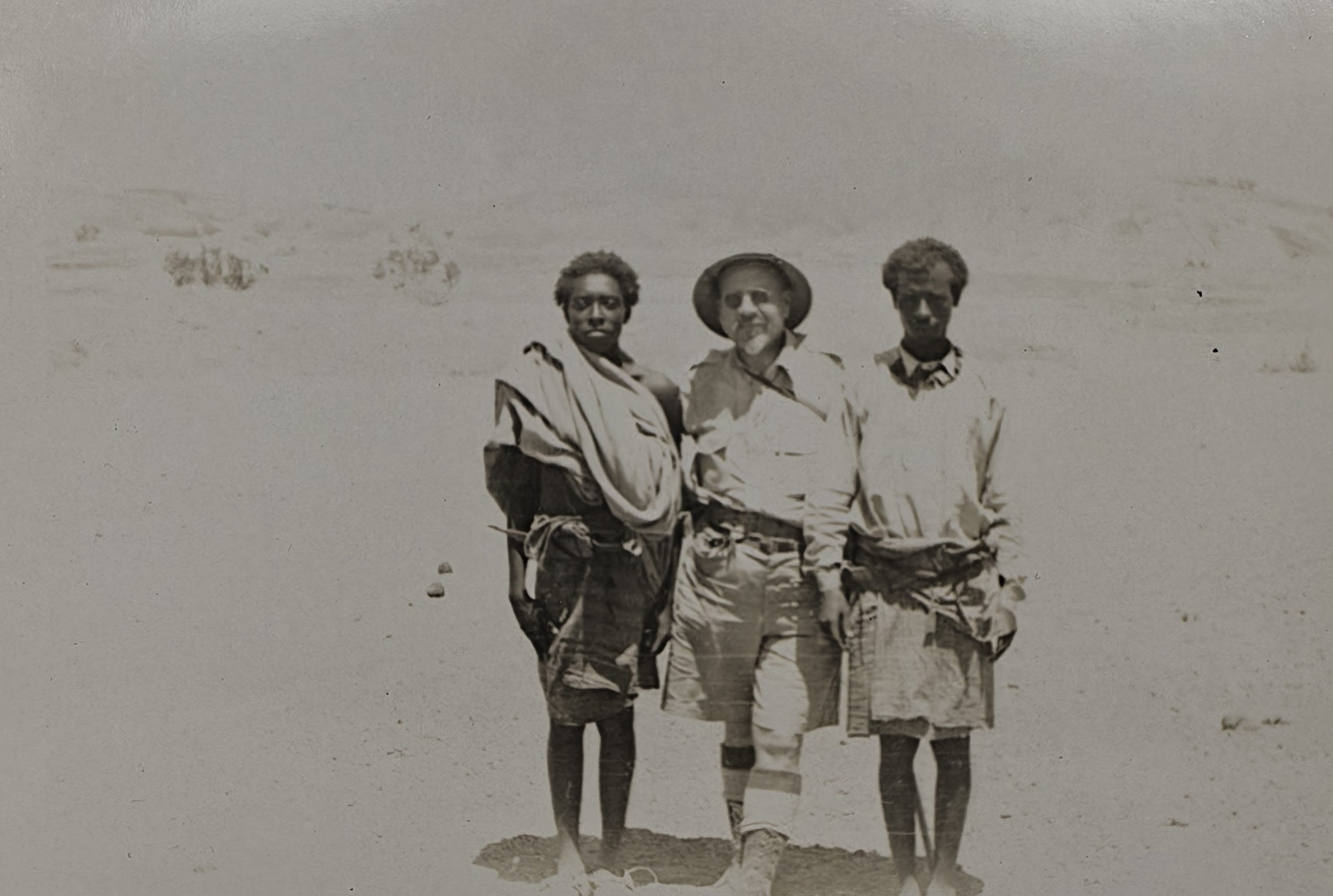 Interesting extensive collection of 223 original gelatin silver snapshot photos, taken during a mining survey expedition (possibly, prospecting for gold) in Italian East Africa (modern-day Eritrea and Ethiopia) in the late 1930s. Possibly set up after the Second Italo-Ethiopian War (1935-1937), the photos follow a party consisting of a European civilian (likely, the Italian expedition leader), several military officers, native soldiers and military trucks, driving across East African landscapes, crossing bridges, posing in front of various geological rock formations or caves, looking for samples in streams, &c. Over a dozen close-up images show a geologist’s hammer, taken in the field next to different rock and earth formations. Four photos show the scenes with Africans performing artisanal gold panning in the streams; one image depicts miners operating a sluice box. There are also several photos of damaged or destroyed bridges and remnants of a tank in a field (likely, the echo of the Second Italo-Ethiopian War). Other photos show East African mountains and valleys, rivers, forests, roads, bridges, villages, cattle herds, native people, &c. There are also views of the Obelisk of Axum and Ethiopian megalithic stellae (possibly, in Tuto Fela, Gedeo Zone of Ethiopia), a military memorial with the Italian fascist eagle emblem and sign “Direzione Lavori […?] Eritrea,” a gravestone for “Morts pour la Belgique,” two Italian modernist buildings &c. Overall, an interesting extensive collection of original snapshot photos of mineral surveys in Ethiopia and Eritrea during the Italian occupation in the 1930s.