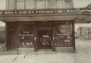 6) A view of “Scamell’s Prescription Pharmacy” (southwest corner of Bush and Divisadero Streets, San Francisco). Period pencil inscription “Dr. Scamell” pointing to one of the two men posing at the front door.
