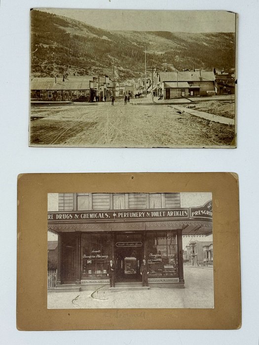 7) A view of Marysville, Montana. Pen note on verso: “Marysville, Mont., 1905. Dr. J.W. Scamell standing on R.R. track facing camera, 3 men & dog leaning on Dr.’s Office.”
