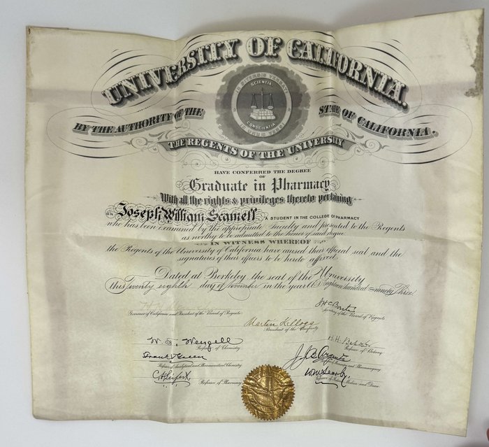 1) Scamell’s diploma of a Graduate in Pharmacy from the College of Pharmacy, University of California. Berkeley, November 28, 1893. Signed by Henry Markham (Governor of California in 1891-95), Martin Kellogg (7th President of the University of California, 1893-99), Professors of Chemistry, Botany, Analytical and Pharmaceutical Chemistry, Microscopy and Pharmacognosy, Pharmacy, and Materia Medica. With a gold paper seal of the University of California.