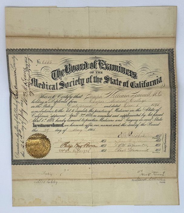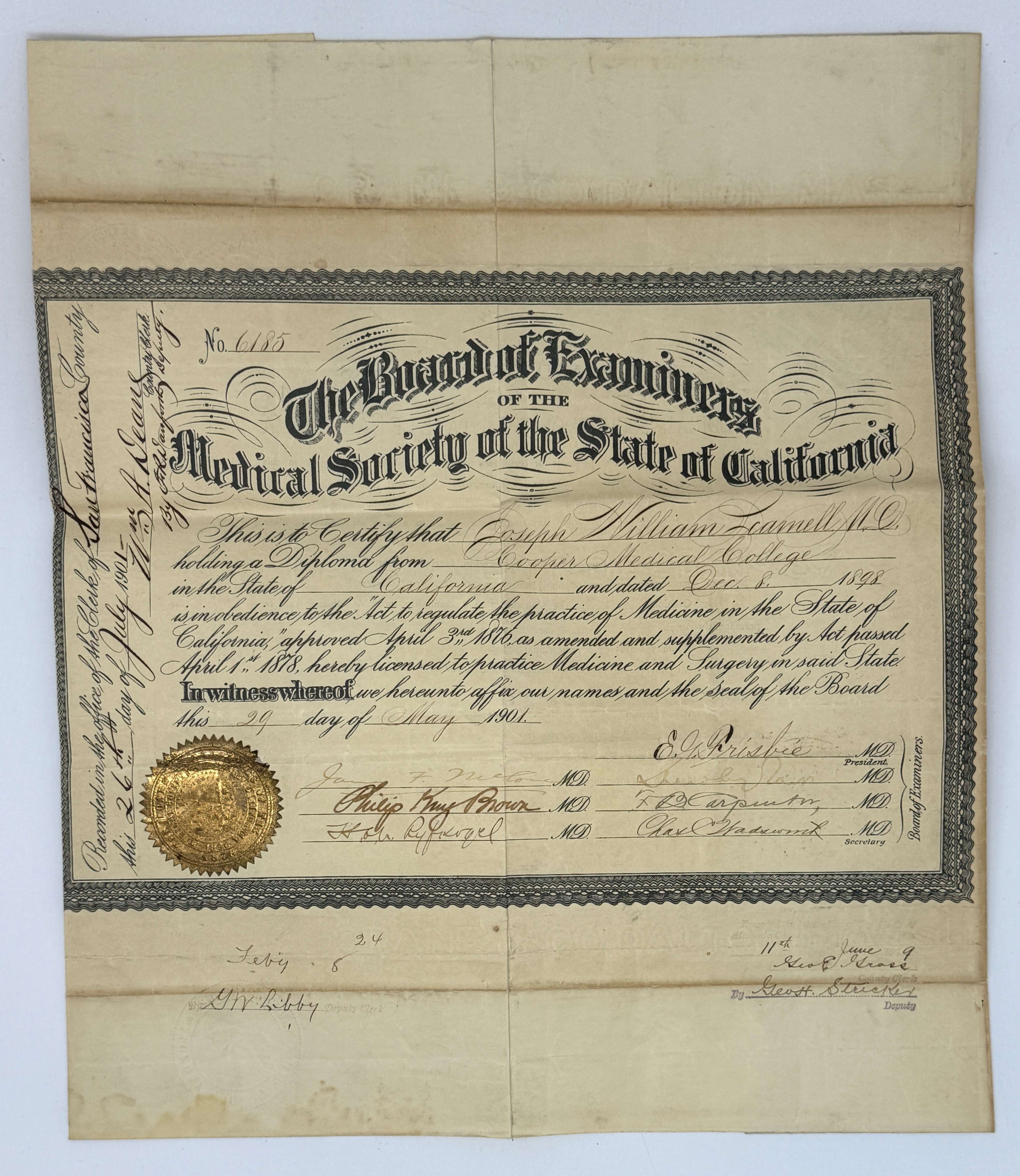 3) Scamell’s Licence “to practice Medicine and Surgery,” issued by the Medical Society of the State of California on May 29, 1901. Signed by the Society’s President, E.G. Frisbie, M.D. and six members of the Board of Examiners. Certified in the office of the Clerk of San Francisco County on July 26, 1901. With a gold paper seal of the Board of Examiners of the Medical Society of California and a blind stamp of the Superior Court of Sonoma County, California.