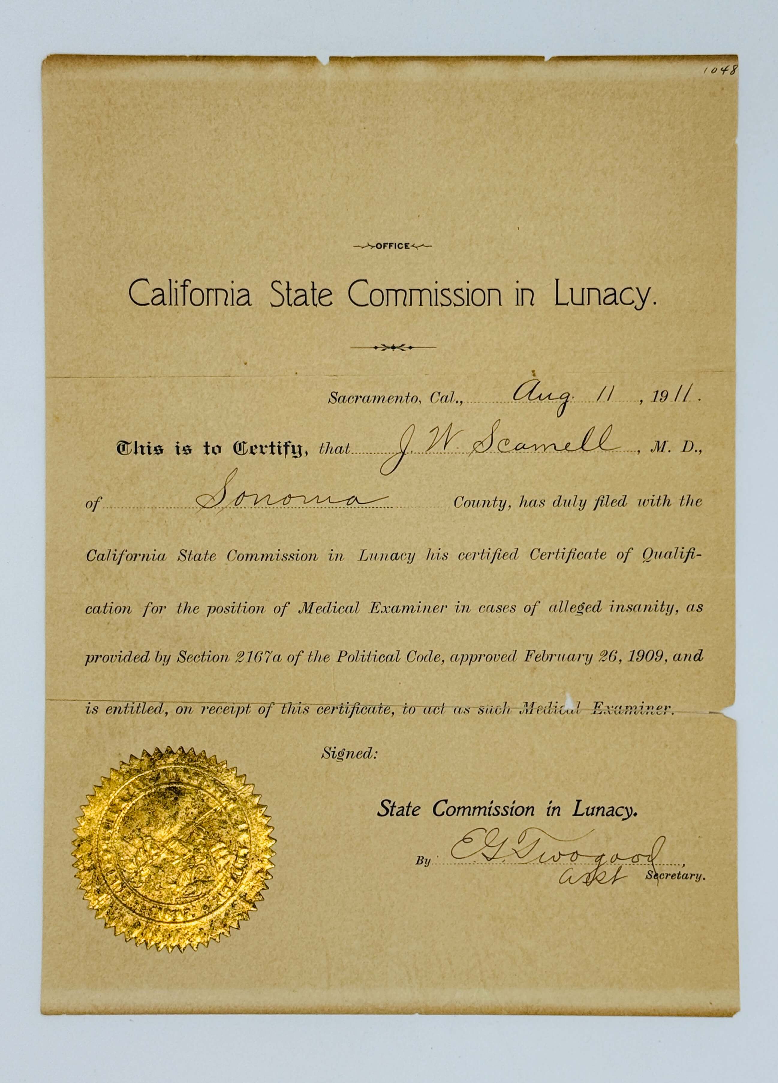 4) Scamell’s “Certificate of Qualification for the position of Medical Examiner in cases of alleged insanity,” issued by the California State Commission in Lunacy” on August 11, 1911. Signed by the Commission’s assistant secretary, with a gold paper seal of the California State Commission in Lunacy.
